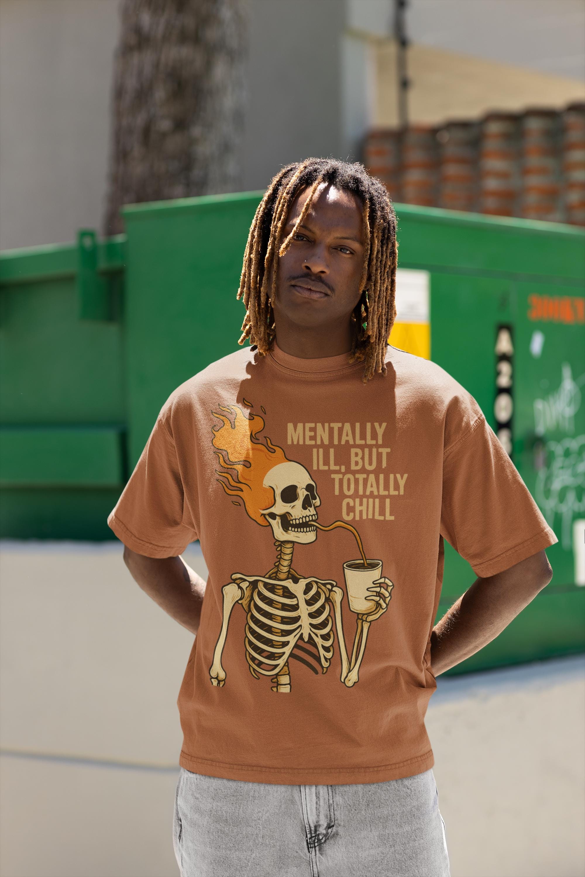 Embrace the chaos with a bit of dark humor in our "Mentally Ill, But Totally Chill" shirt. This sarcastic skeleton shirt perfectly captures the feeling of being overwhelmed on the inside while keeping a cool exterior. It's an ideal piece for anyone who uses humor to navigate life's stresses and makes a thoughtful gift for a friend who gets it.