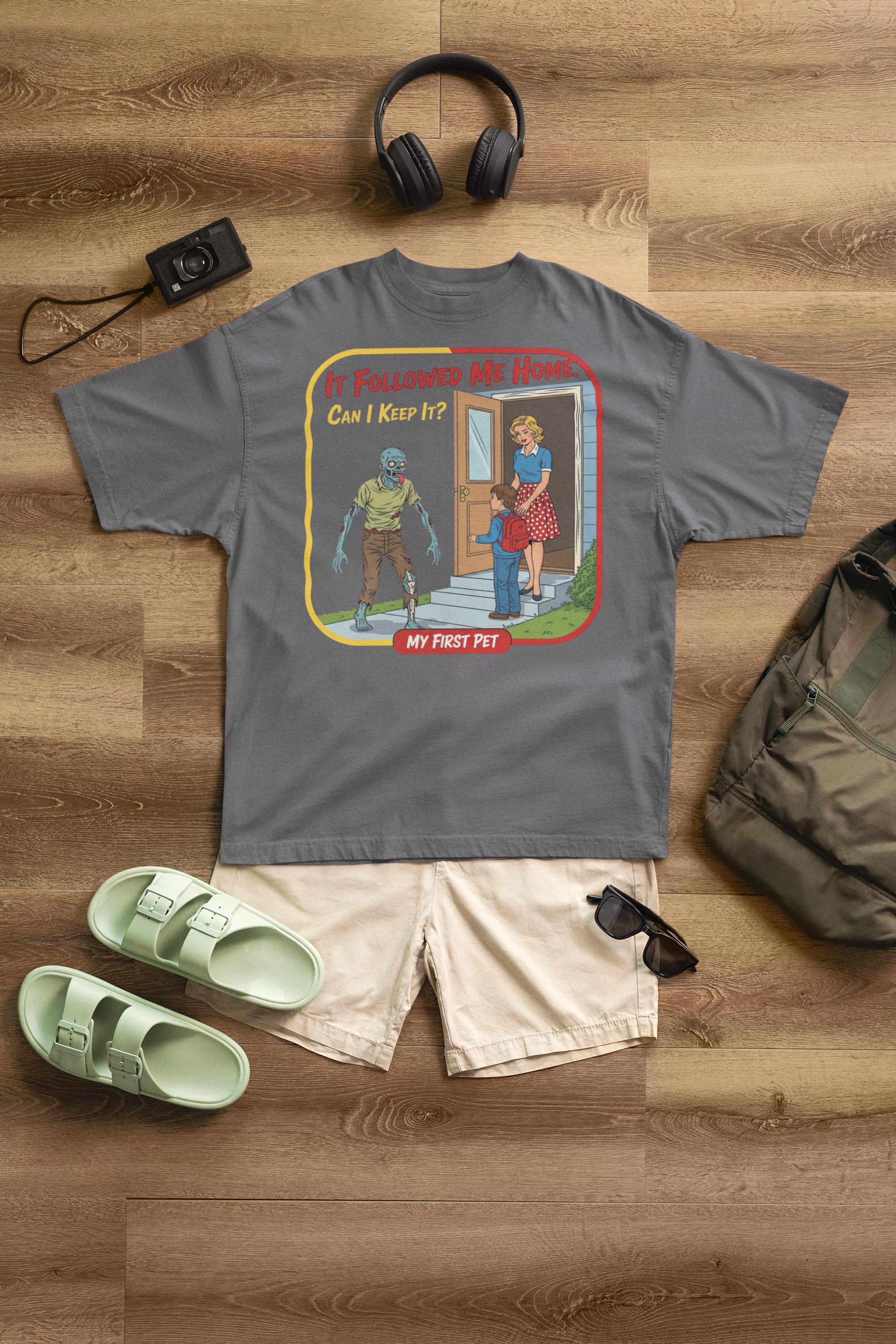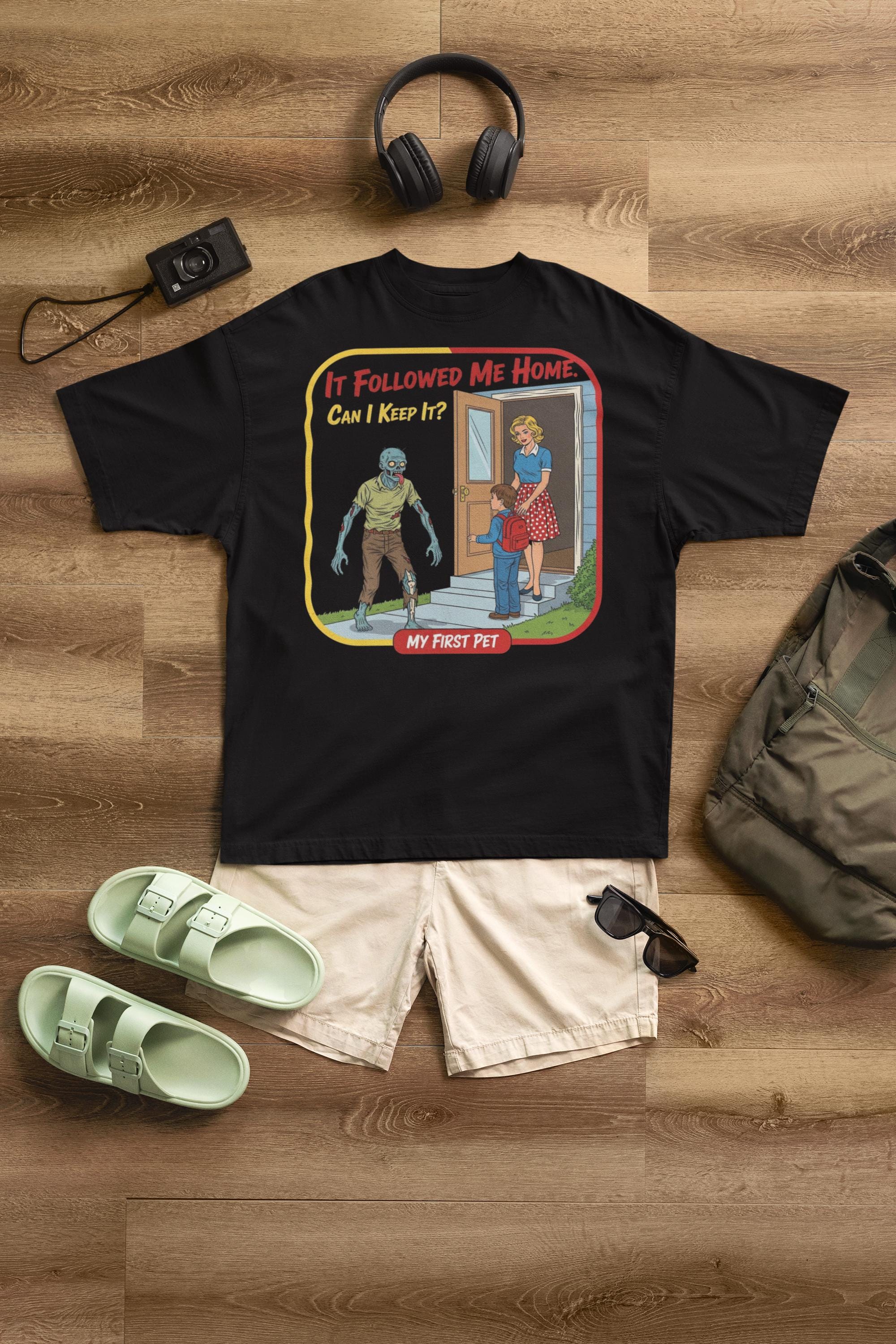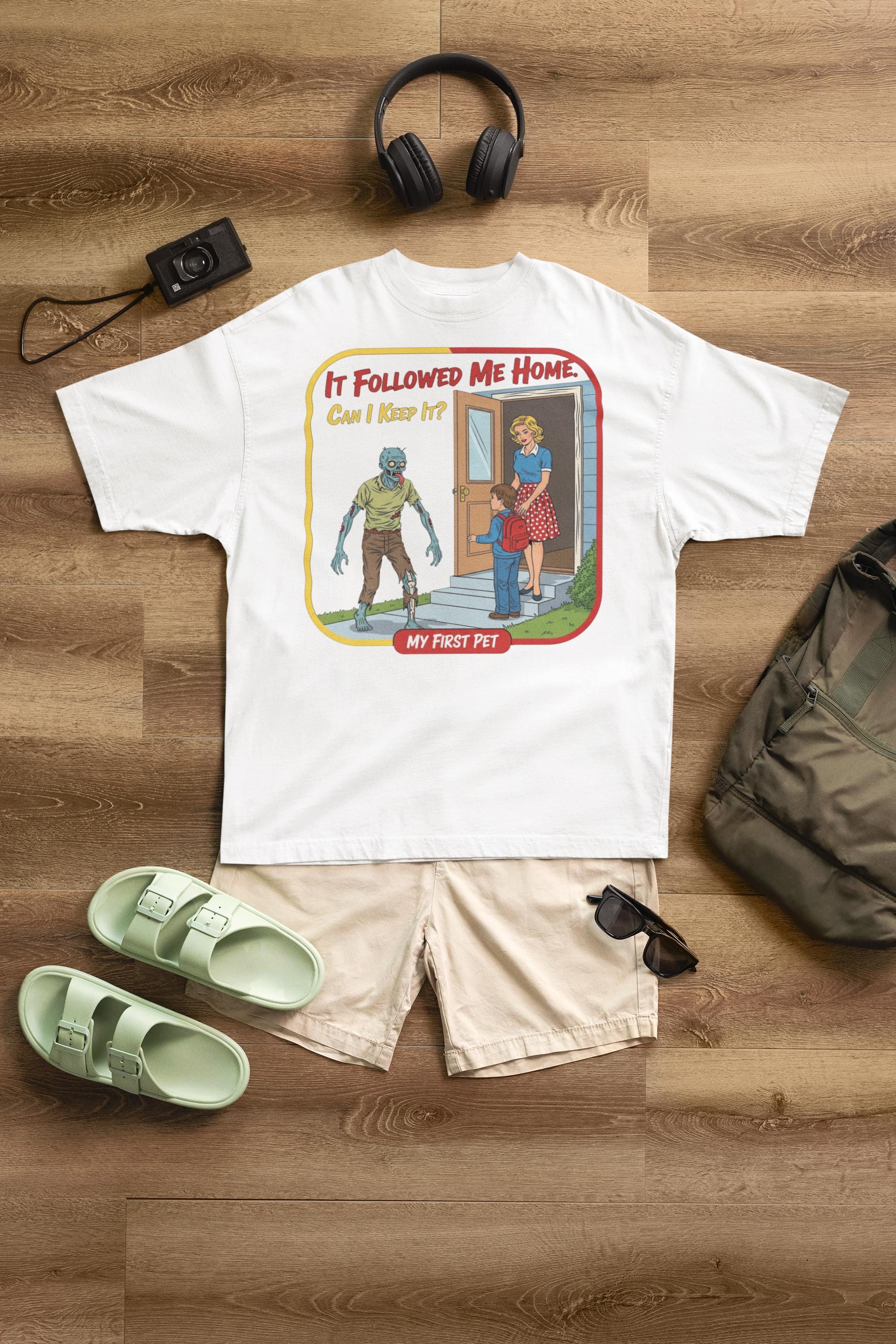 For everyone who's ever wanted to bring home a stray... of the undead variety. This sarcastic "My First Pet" design captures the hilarious dark humor of mixing 1950s innocence with a classic horror movie monster, making it the perfect shirt for any zombie fan with a witty side.