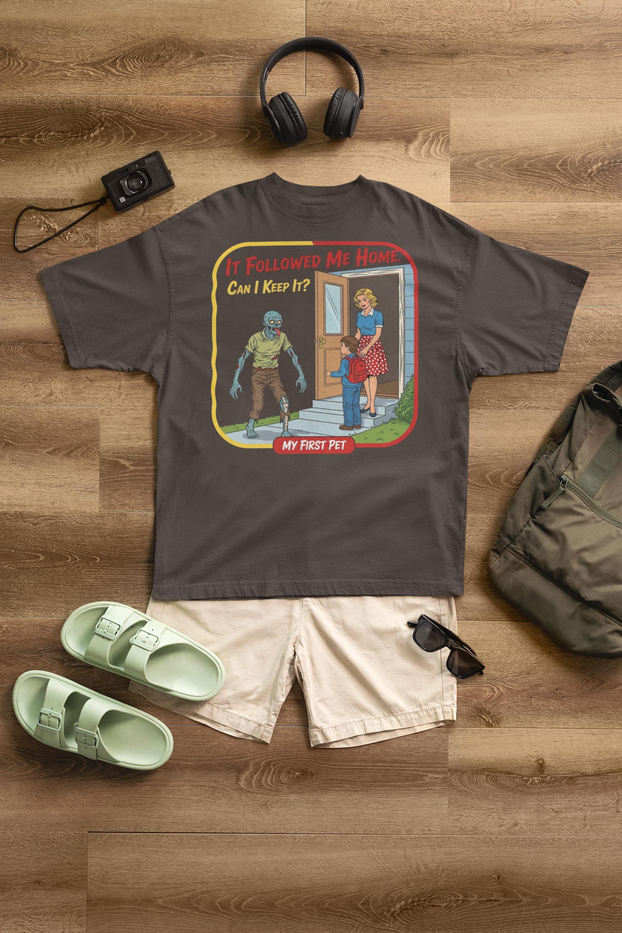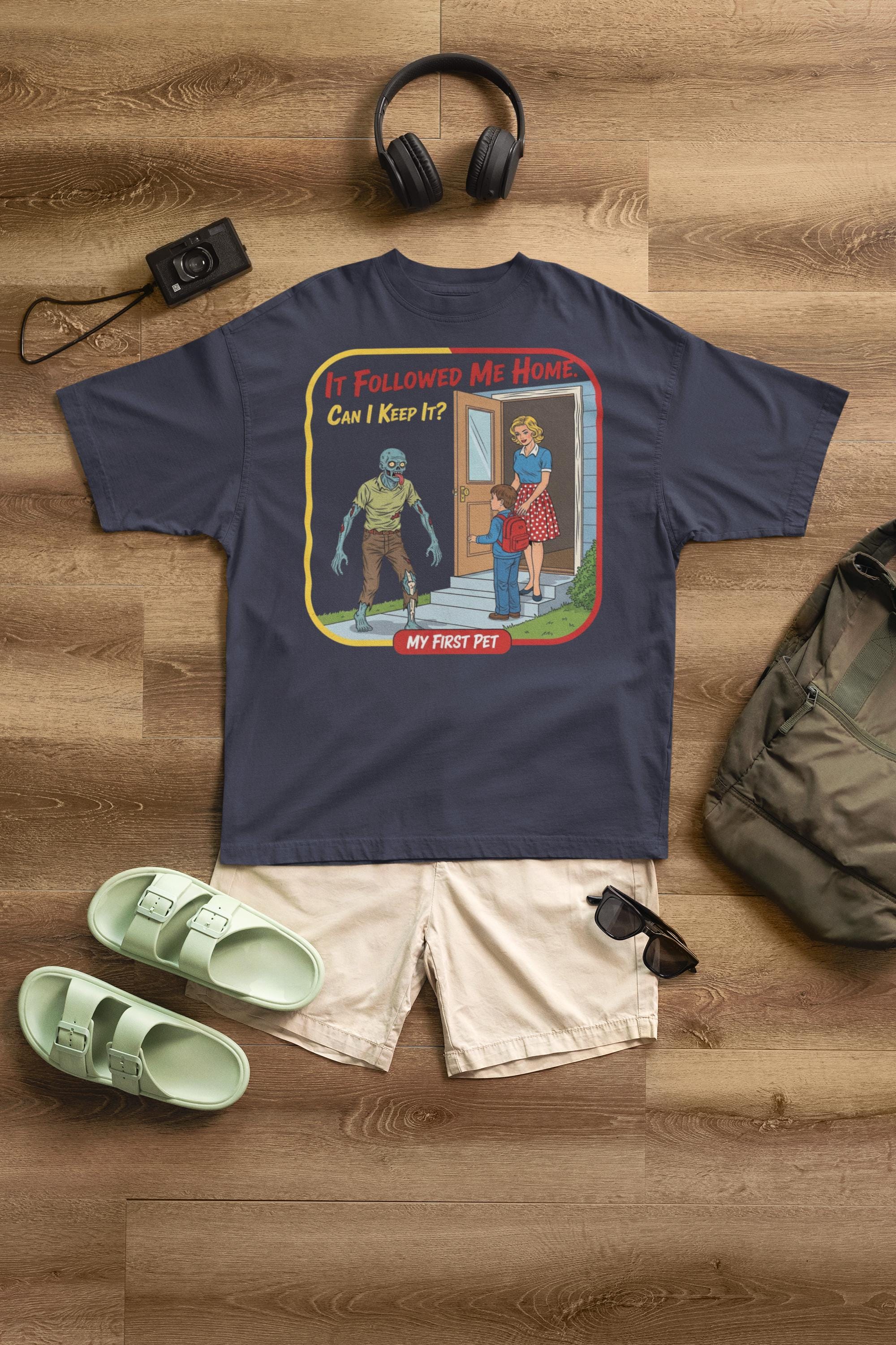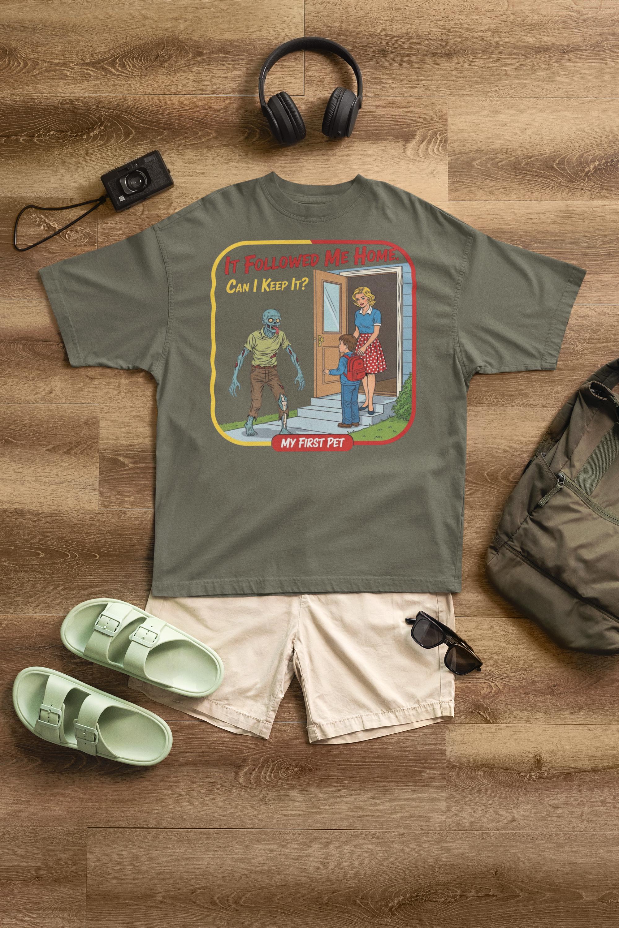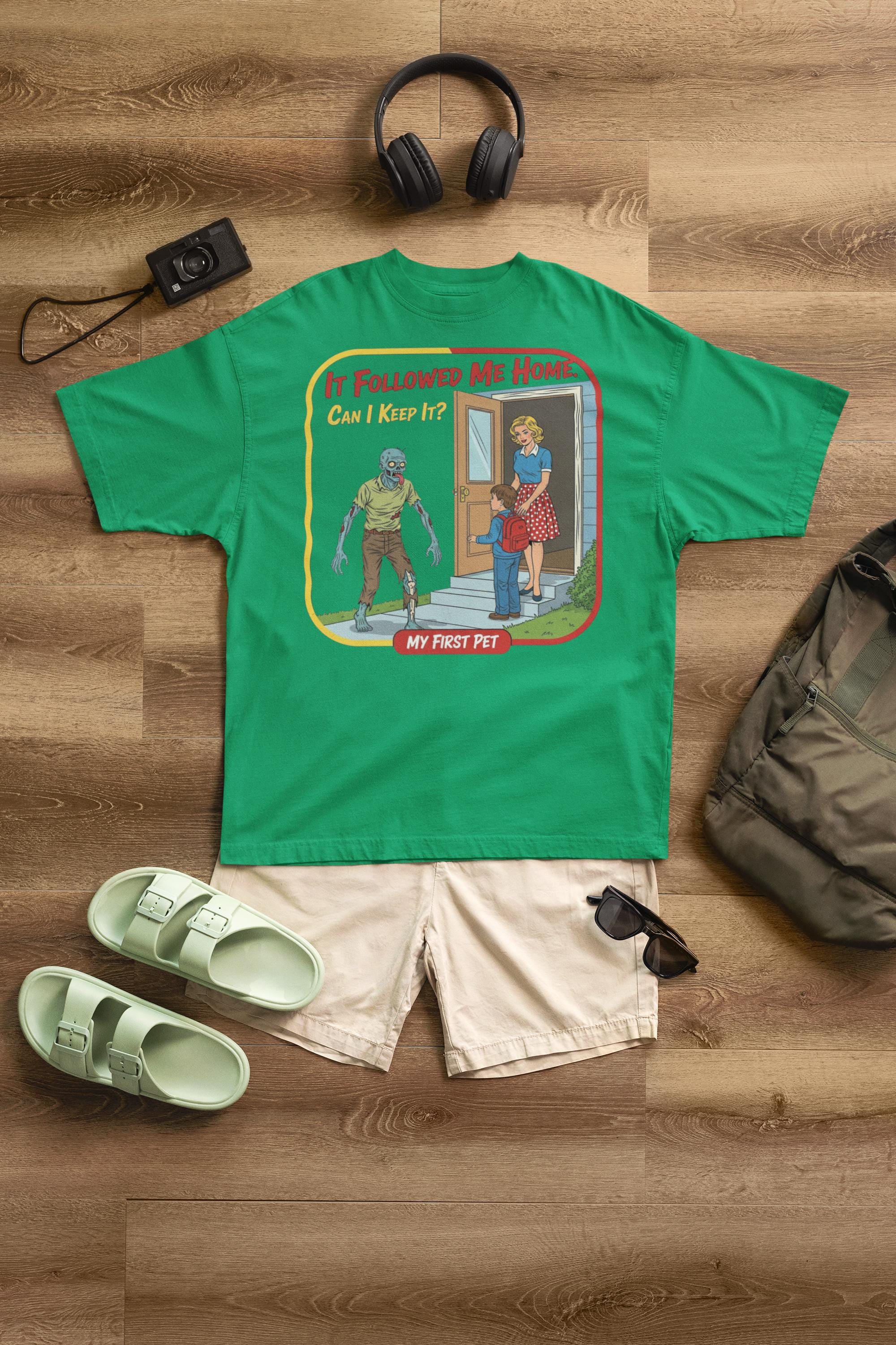 For everyone who's ever wanted to bring home a stray... of the undead variety. This sarcastic "My First Pet" design captures the hilarious dark humor of mixing 1950s innocence with a classic horror movie monster, making it the perfect shirt for any zombie fan with a witty side.