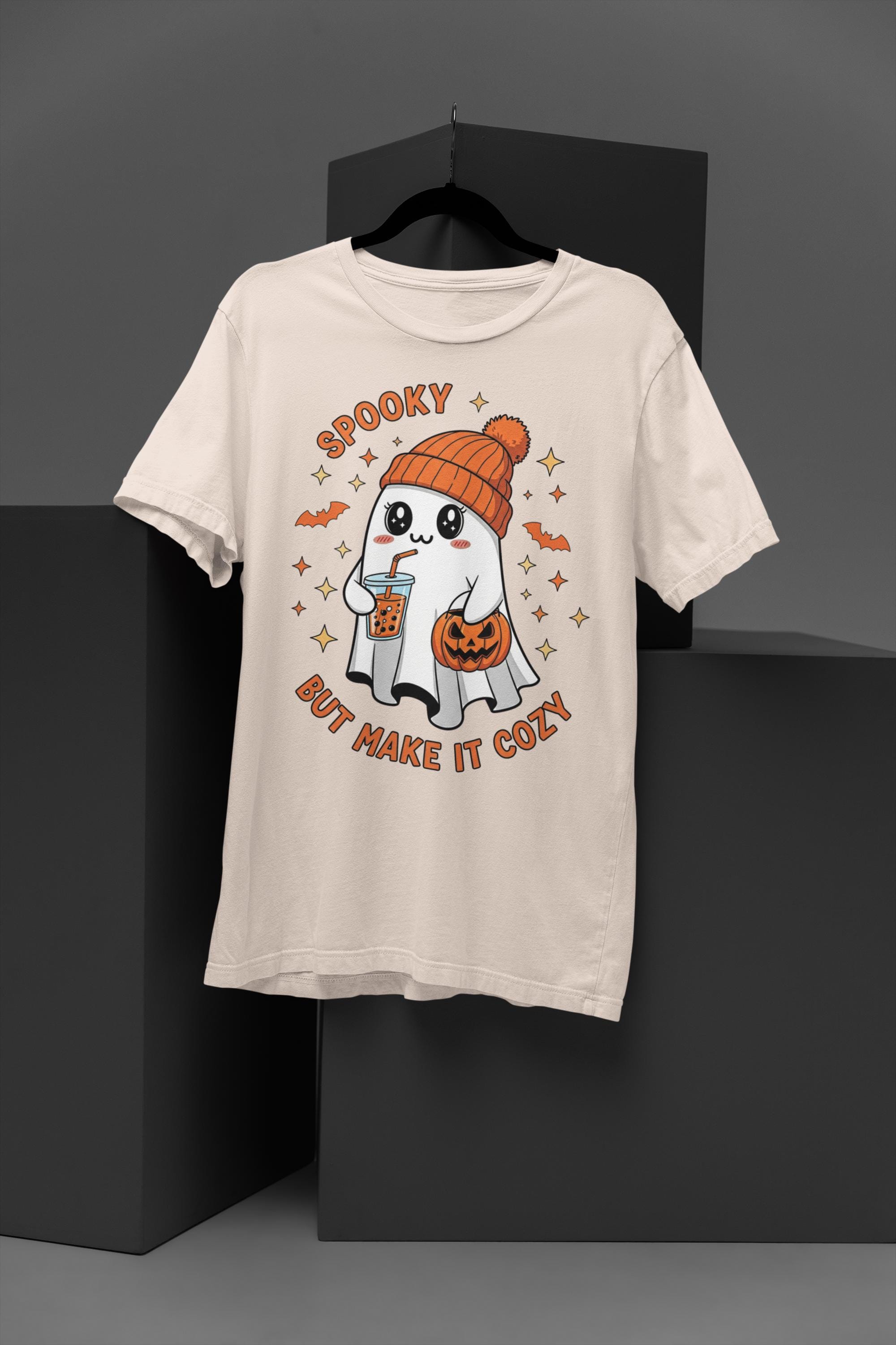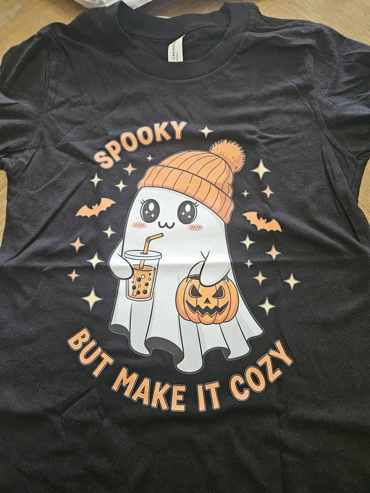 Get into the Halloween spirit with our "Spooky But Make It Cozy" Gildan 64000 t-shirt, also available in youth sizes and on sweatshirts and hoodies. This tee features a unique DTG print of a kawaii ghost, making it a perfect choice for matching family Halloween fun. It's designed for a soft feel and a great fit for all ages.