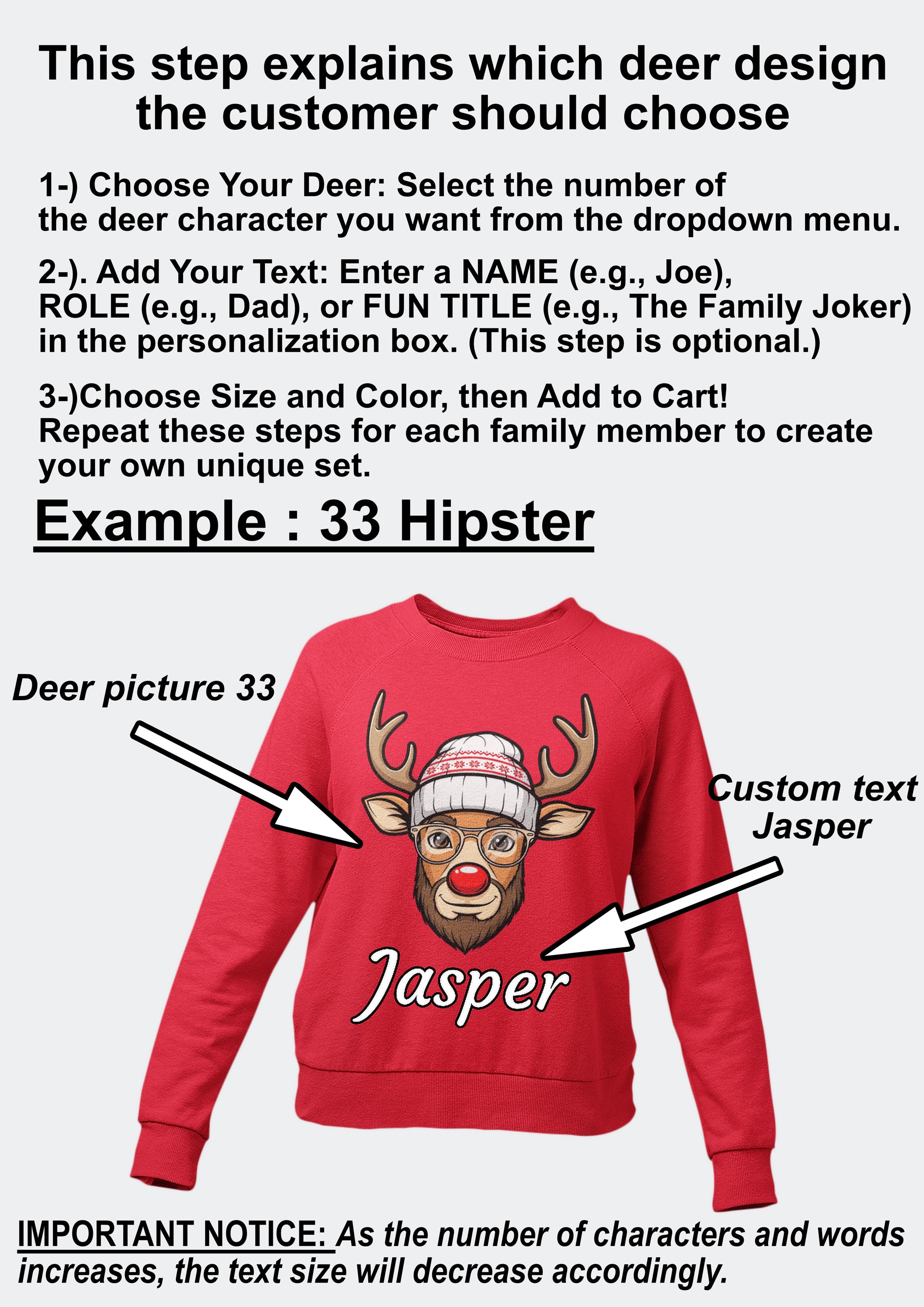 To create your custom reindeer, simply provide answers to the following 5 simple points in the 'personalization' box at checkout. Please keep descriptions short and clear!