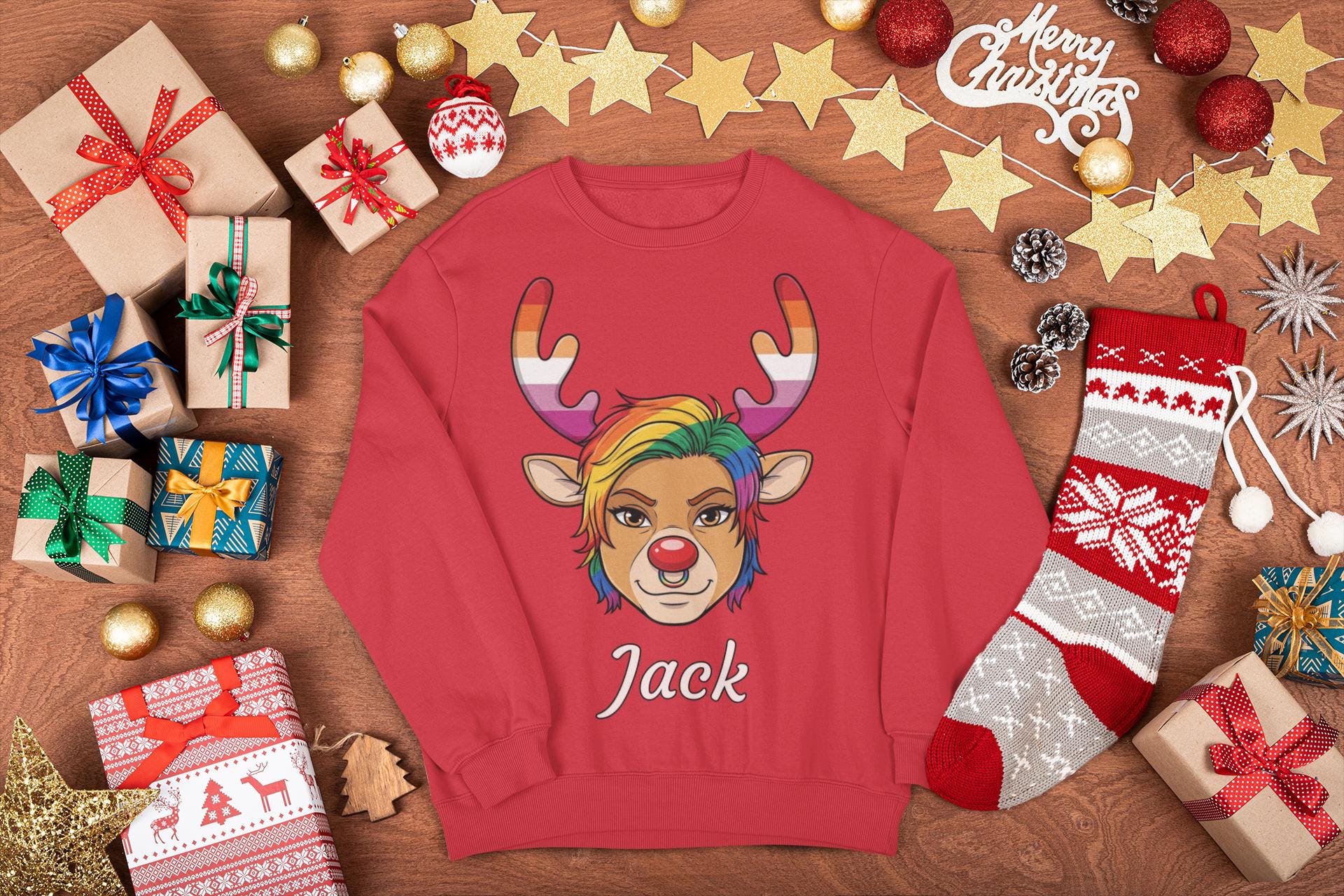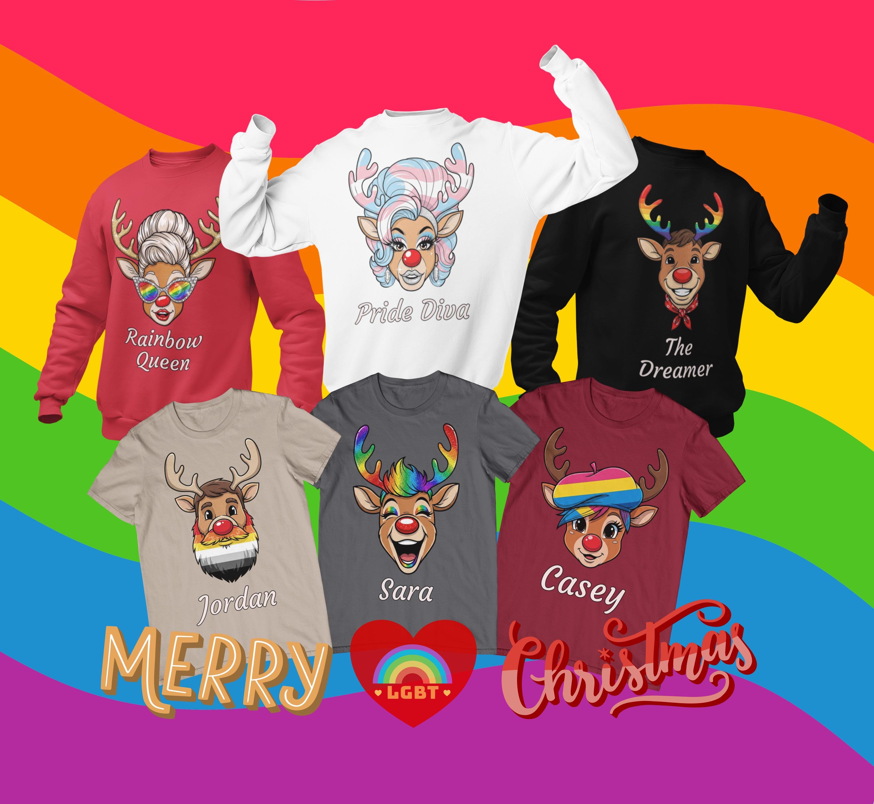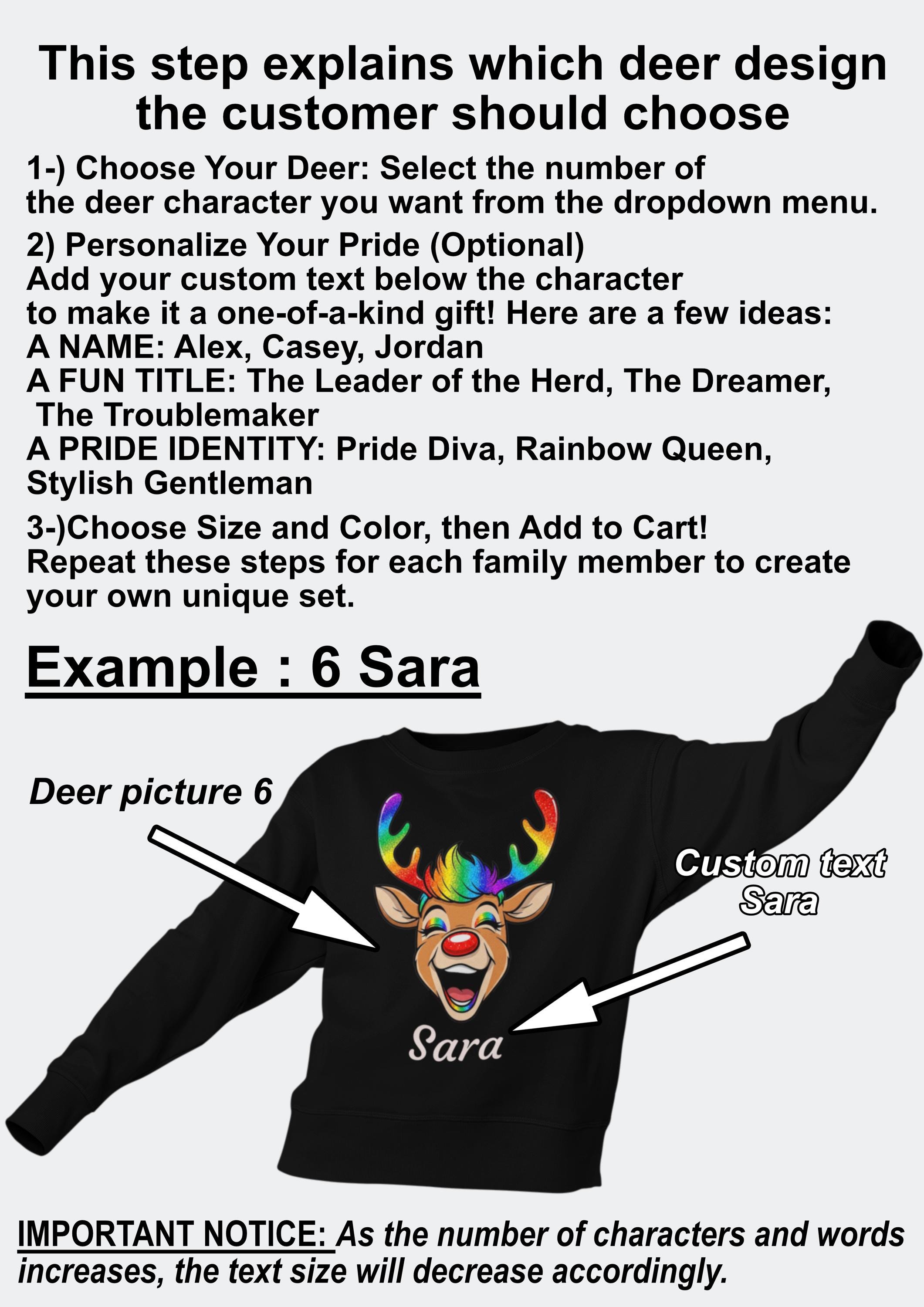 Celebrate the holidays with a custom LGBTQ+ Reindeer Sweatshirt, printed on a cozy Gildan 18000. This unisex classic fit crewneck features a vibrant, personalized DTG print with your choice of 18 pride characters and custom text, available in adult and youth sizes for the whole family.