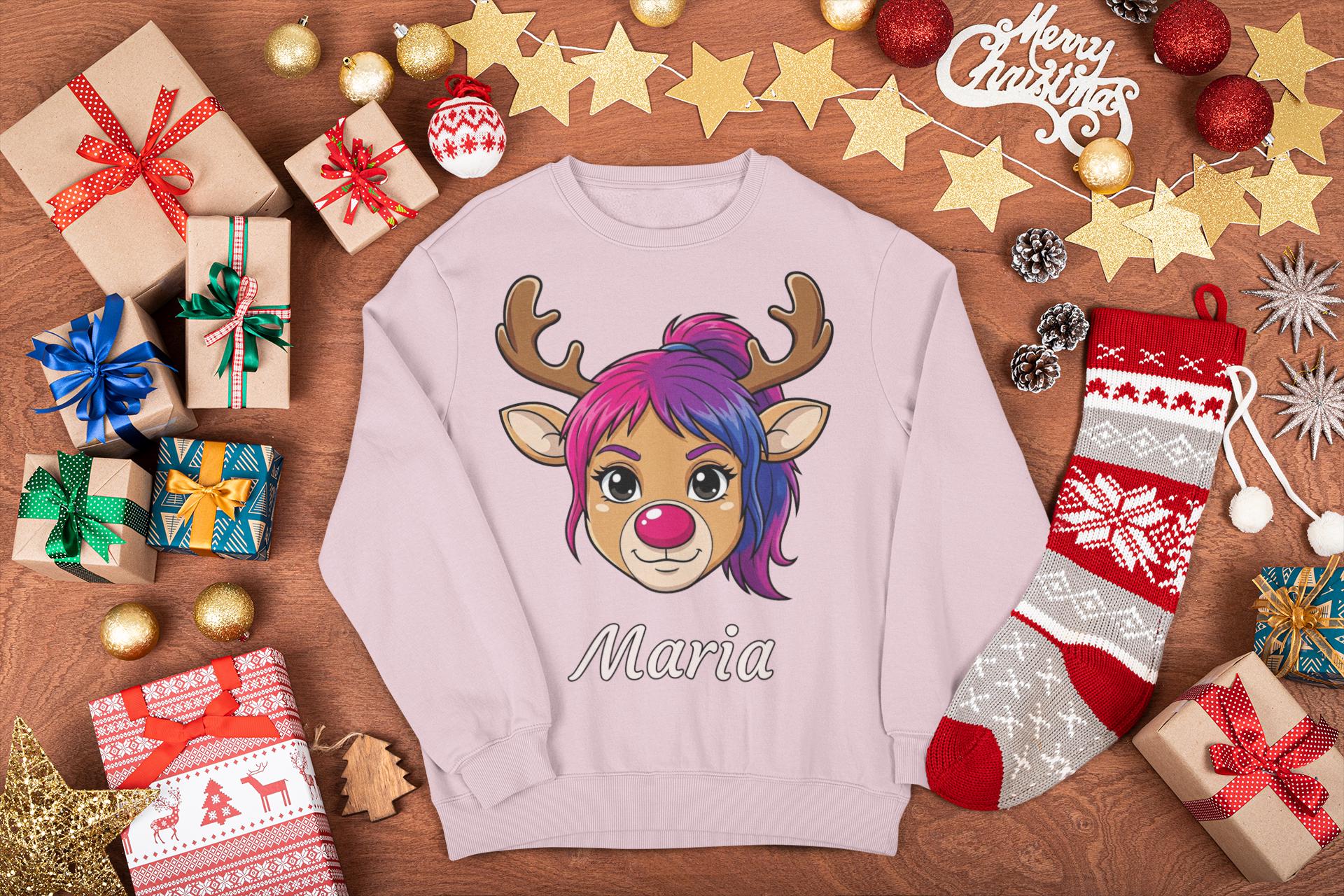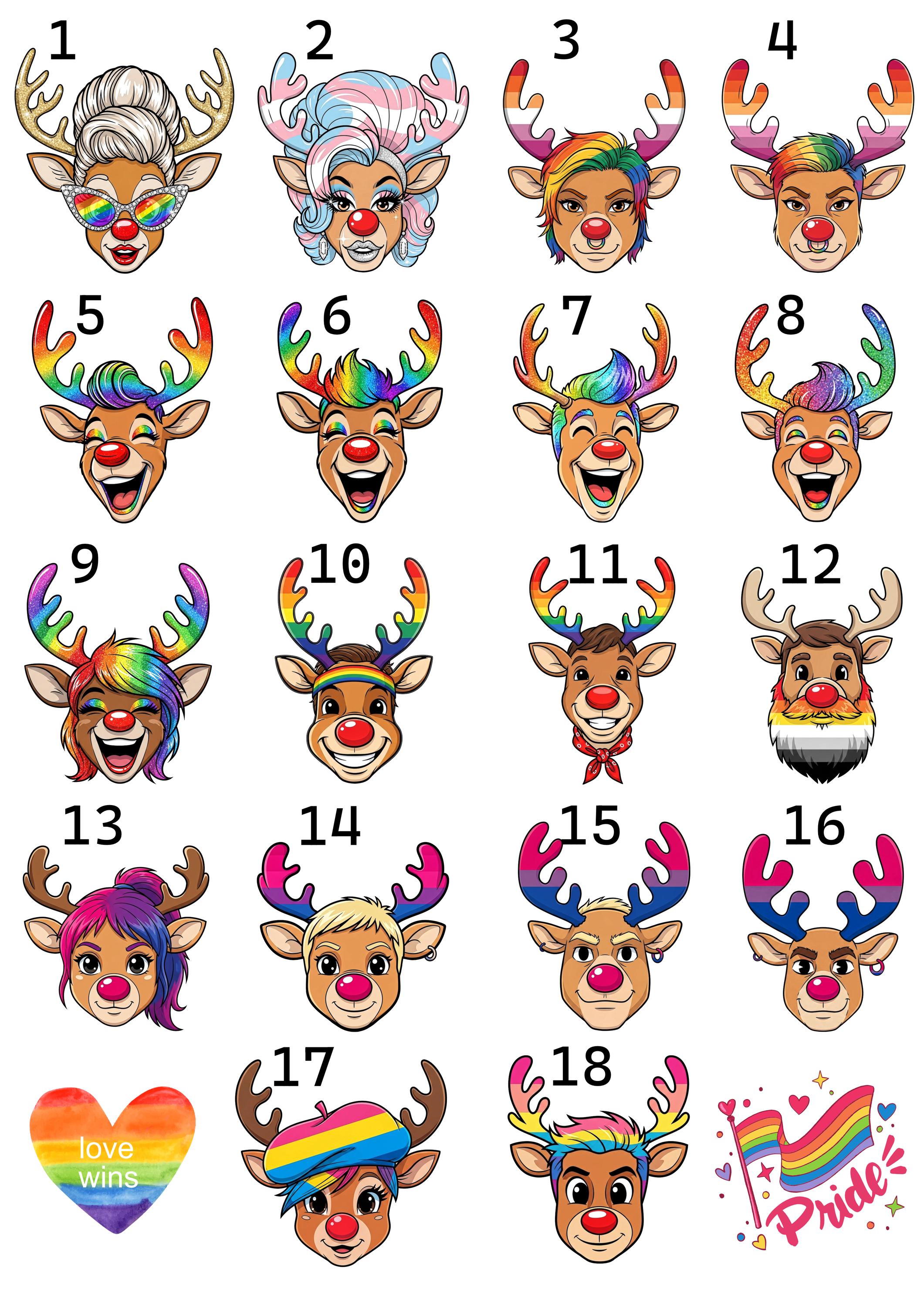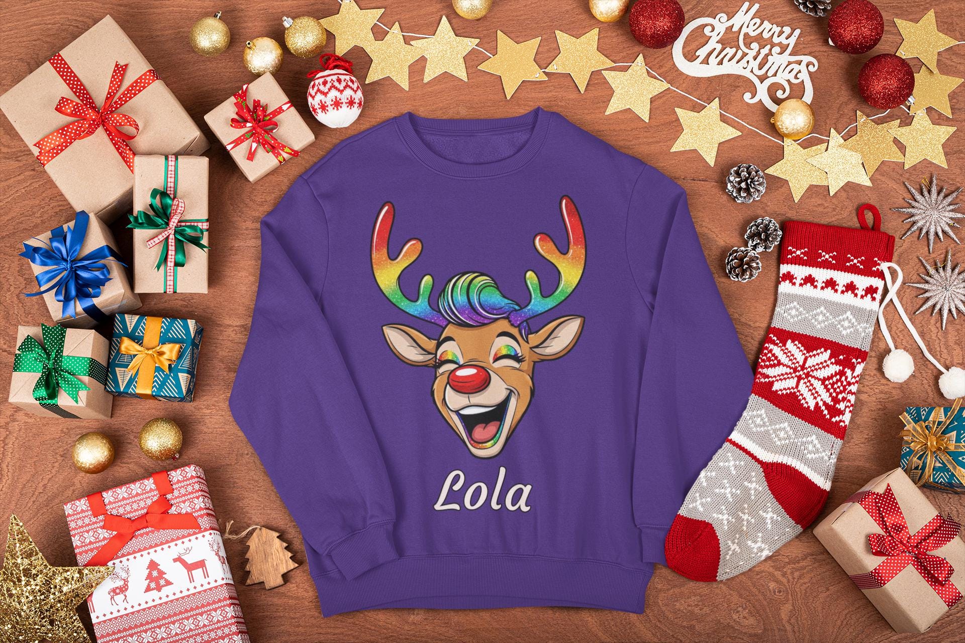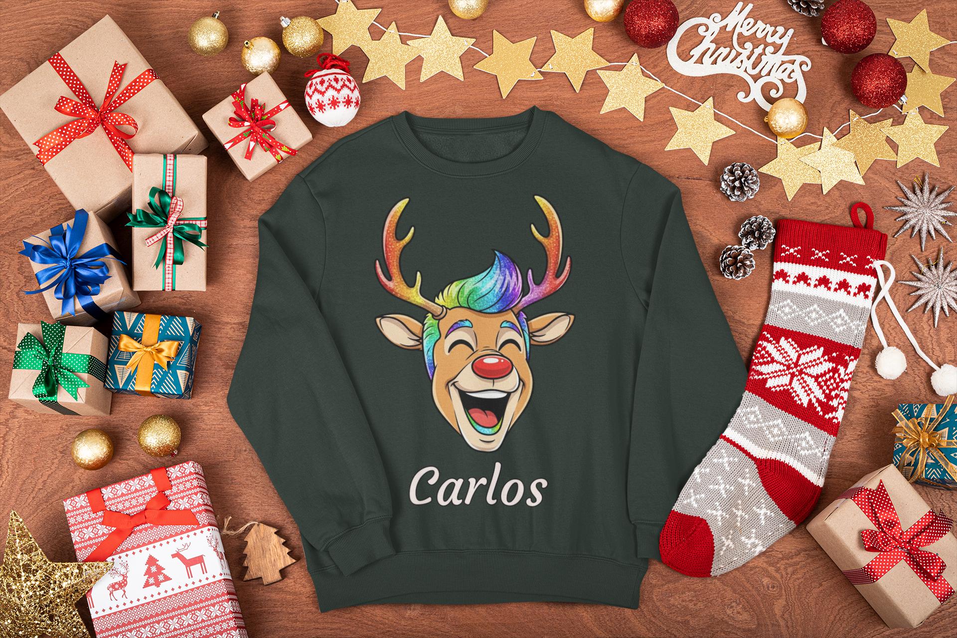 Celebrate the holidays with a custom LGBTQ+ Reindeer Sweatshirt, printed on a cozy Gildan 18000. This unisex classic fit crewneck features a vibrant, personalized DTG print with your choice of 18 pride characters and custom text, available in adult and youth sizes for the whole family.