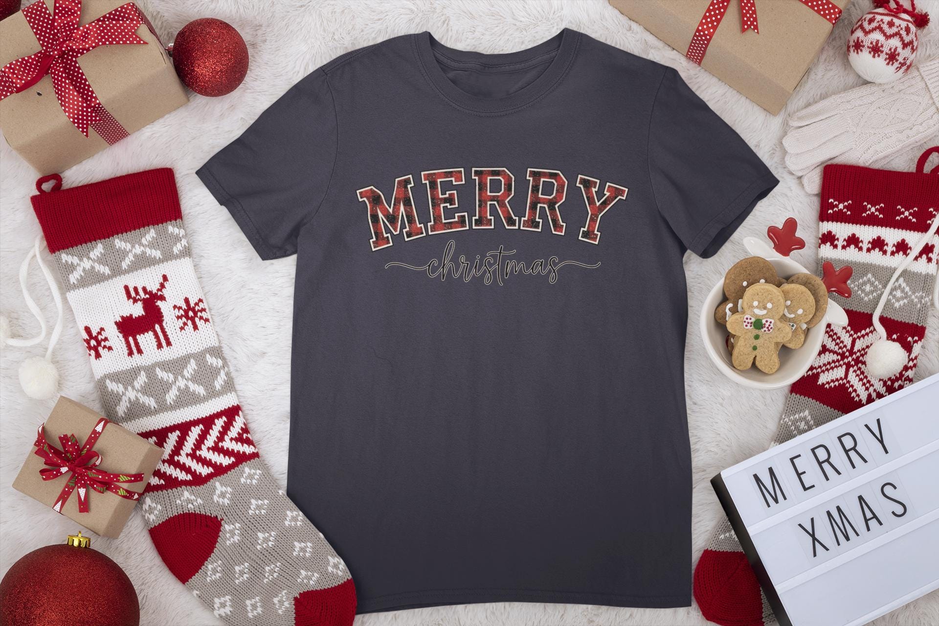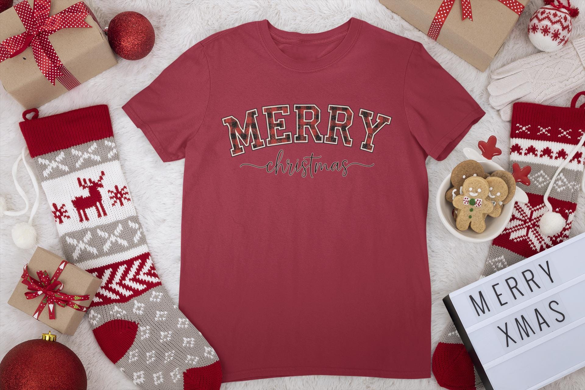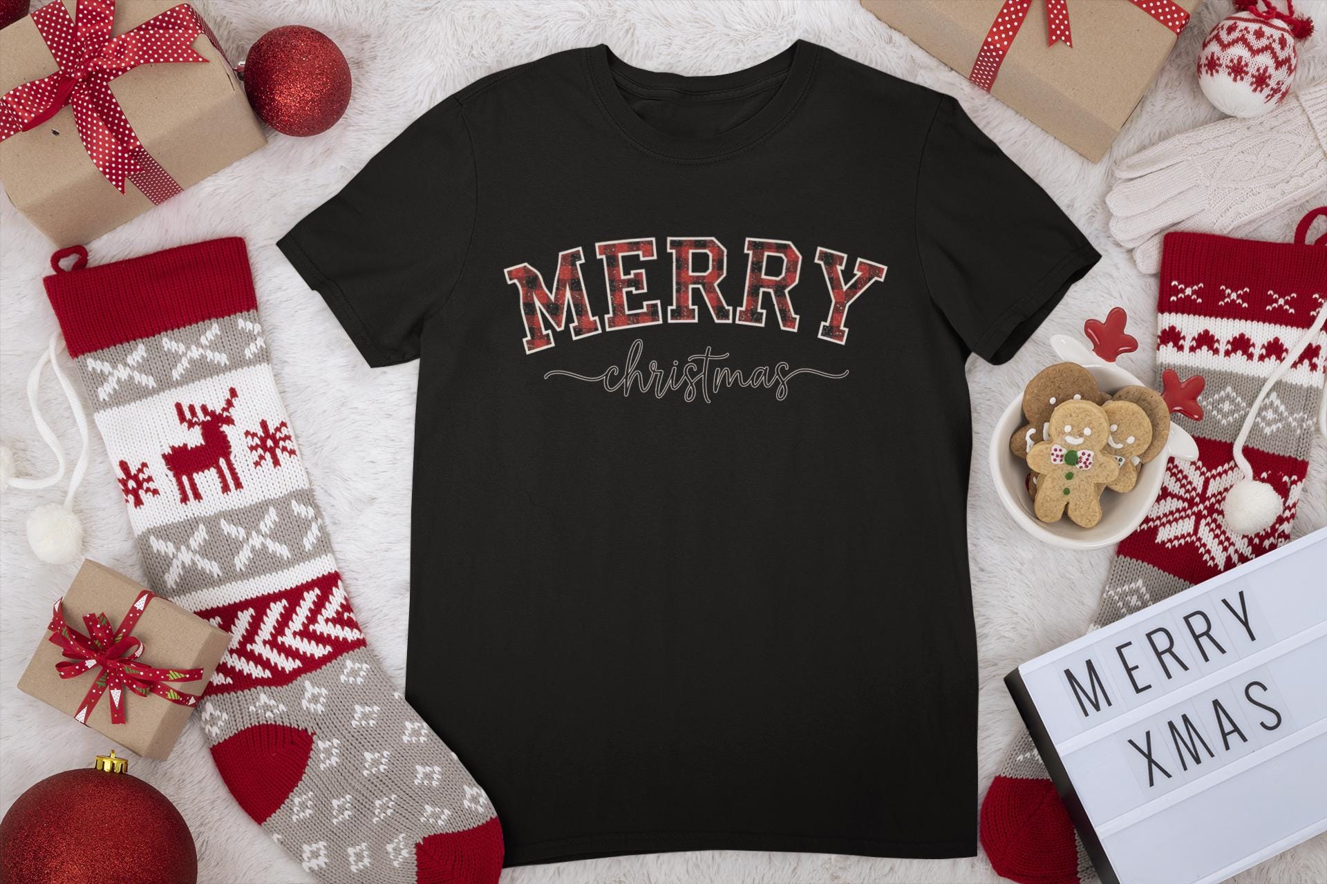 Classic Holiday Design: Combines a trendy varsity font with timeless buffalo plaid, perfect for any Christmas occasion.