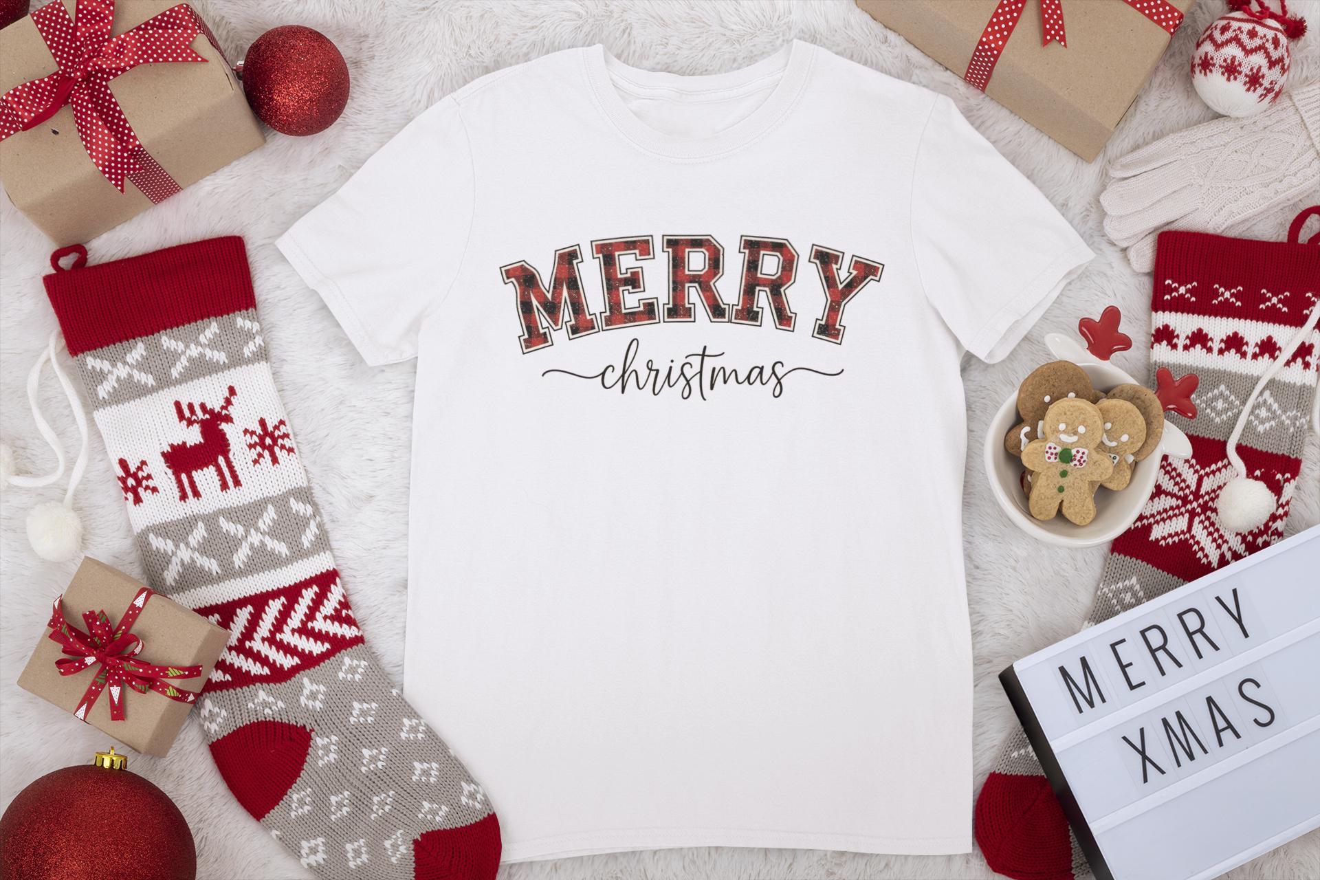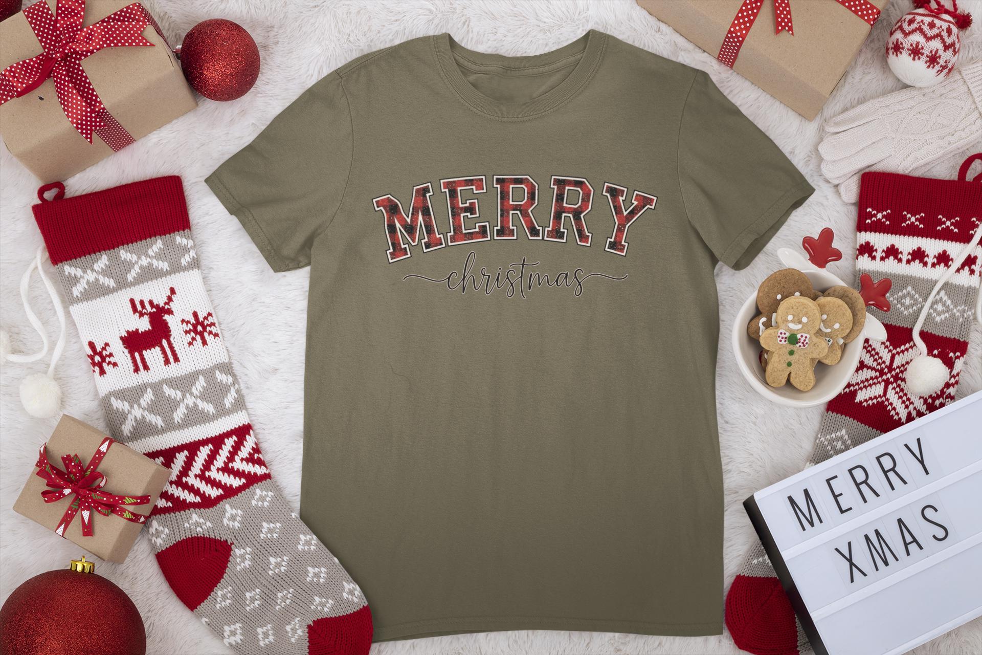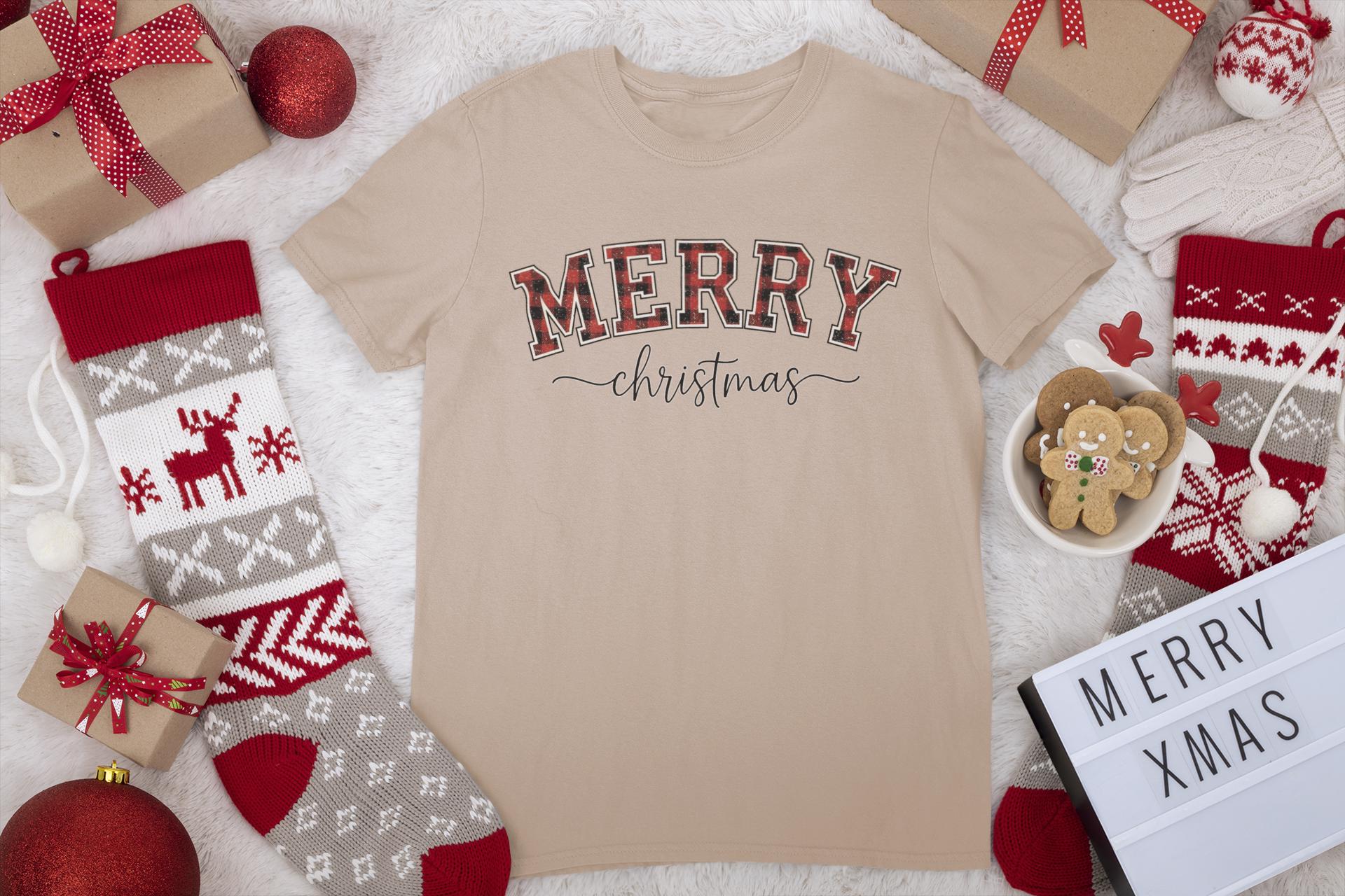 Classic Holiday Design: Combines a trendy varsity font with timeless buffalo plaid, perfect for any Christmas occasion.