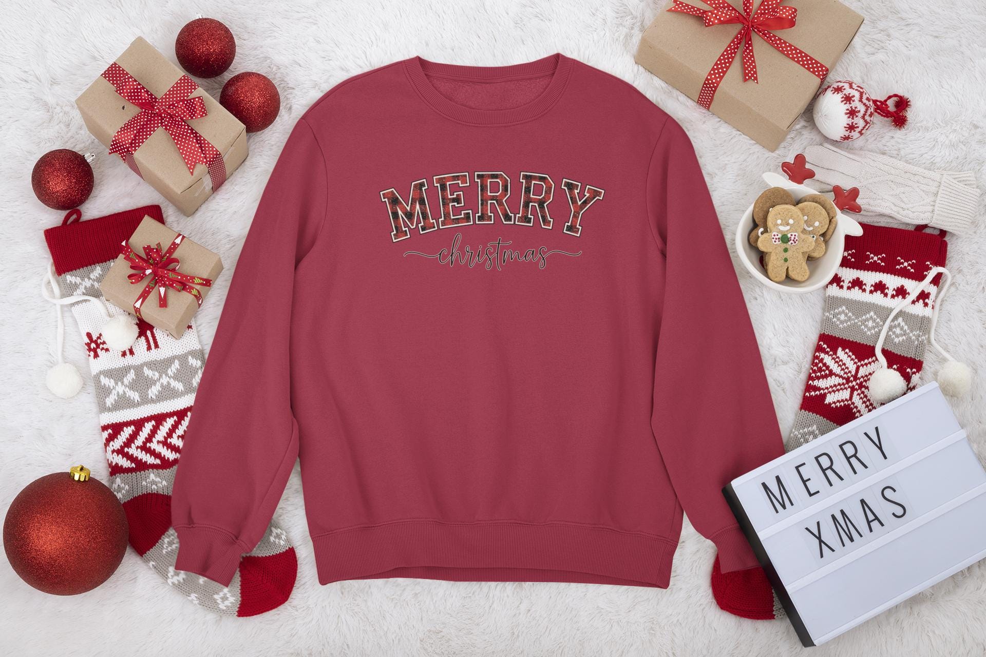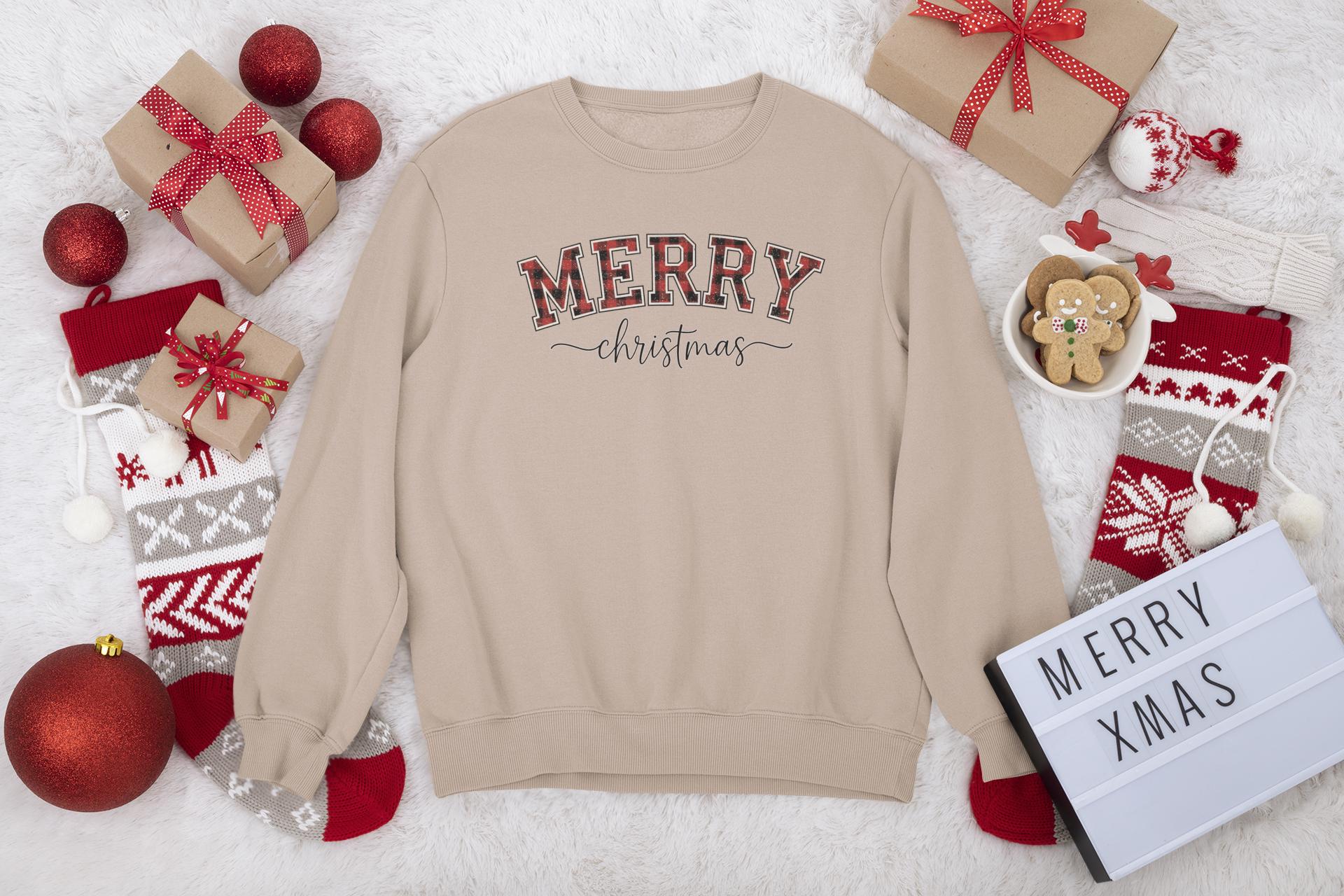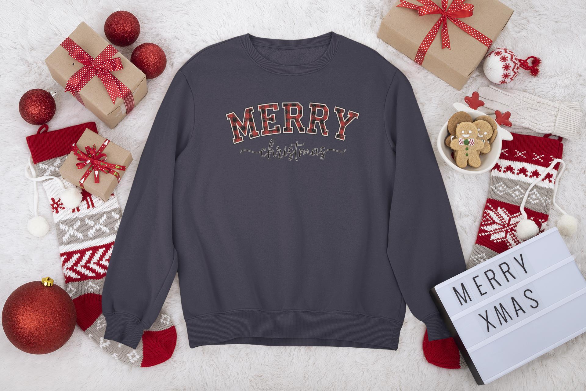 Get into the holiday spirit with our cozy Gildan 18000 Merry Christmas sweatshirt, featuring a classic red and black buffalo plaid design. This unisex pullover offers a comfortable fit and is DTG printed for a vibrant, durable finish, making it a festive favorite.