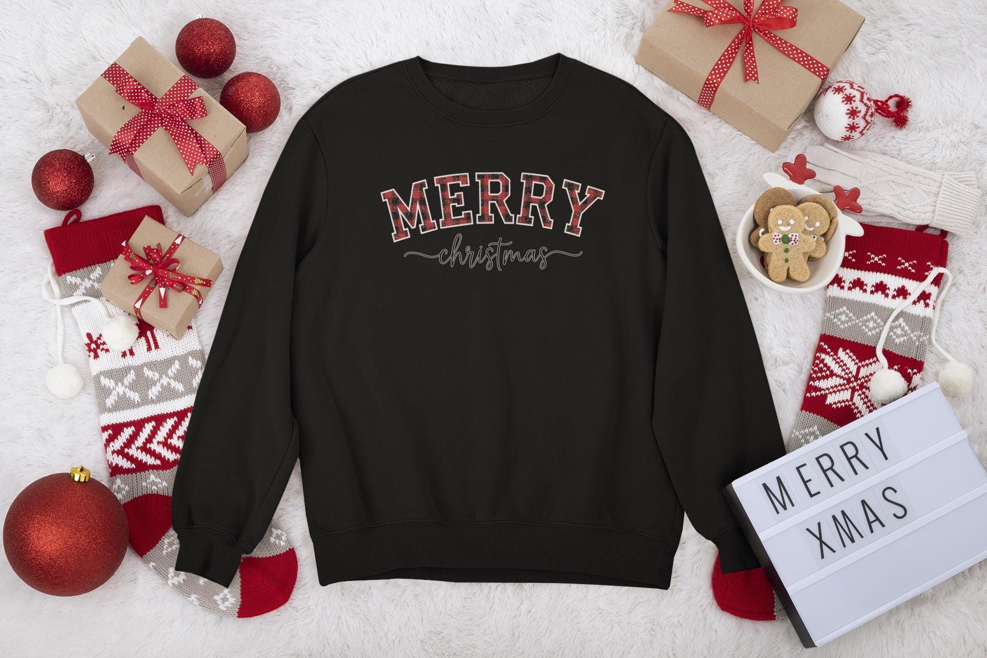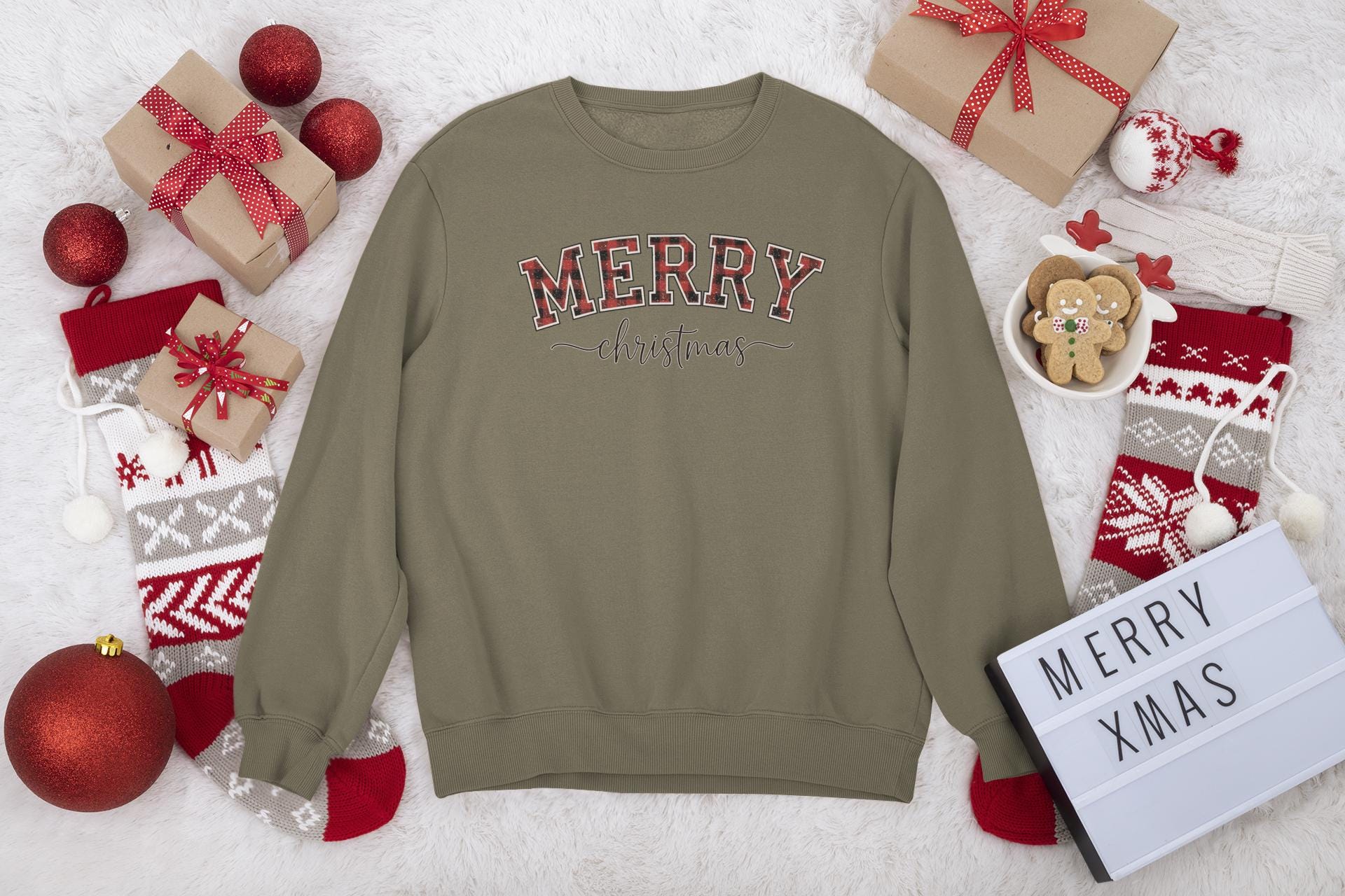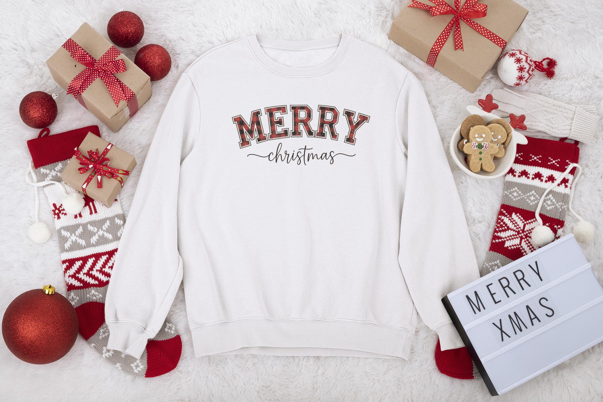 Get into the holiday spirit with our cozy Gildan 18000 Merry Christmas sweatshirt, featuring a classic red and black buffalo plaid design. This unisex pullover offers a comfortable fit and is DTG printed for a vibrant, durable finish, making it a festive favorite.