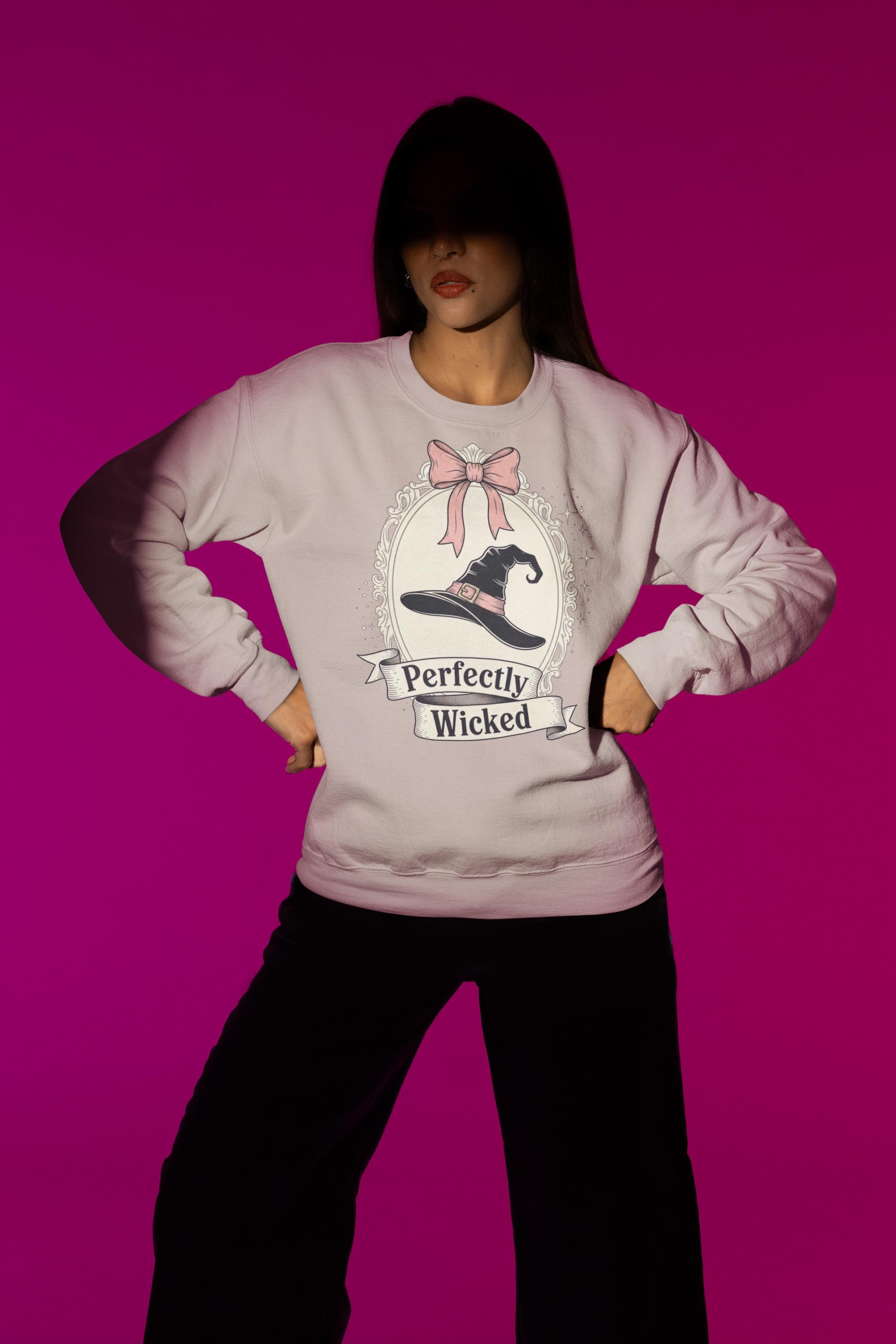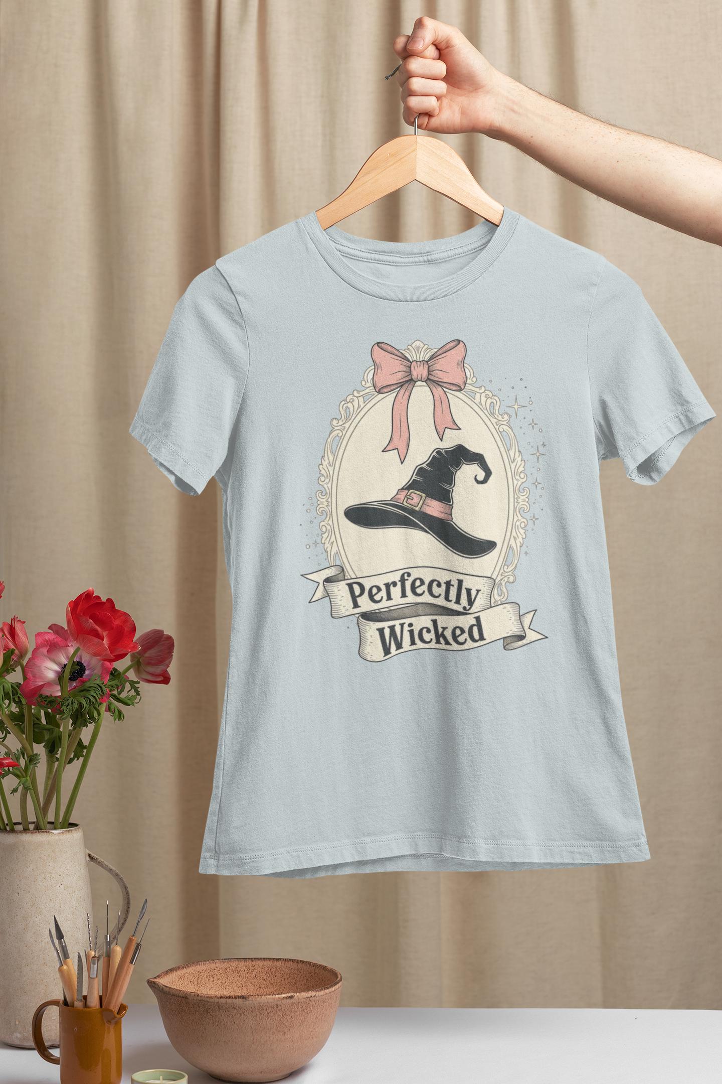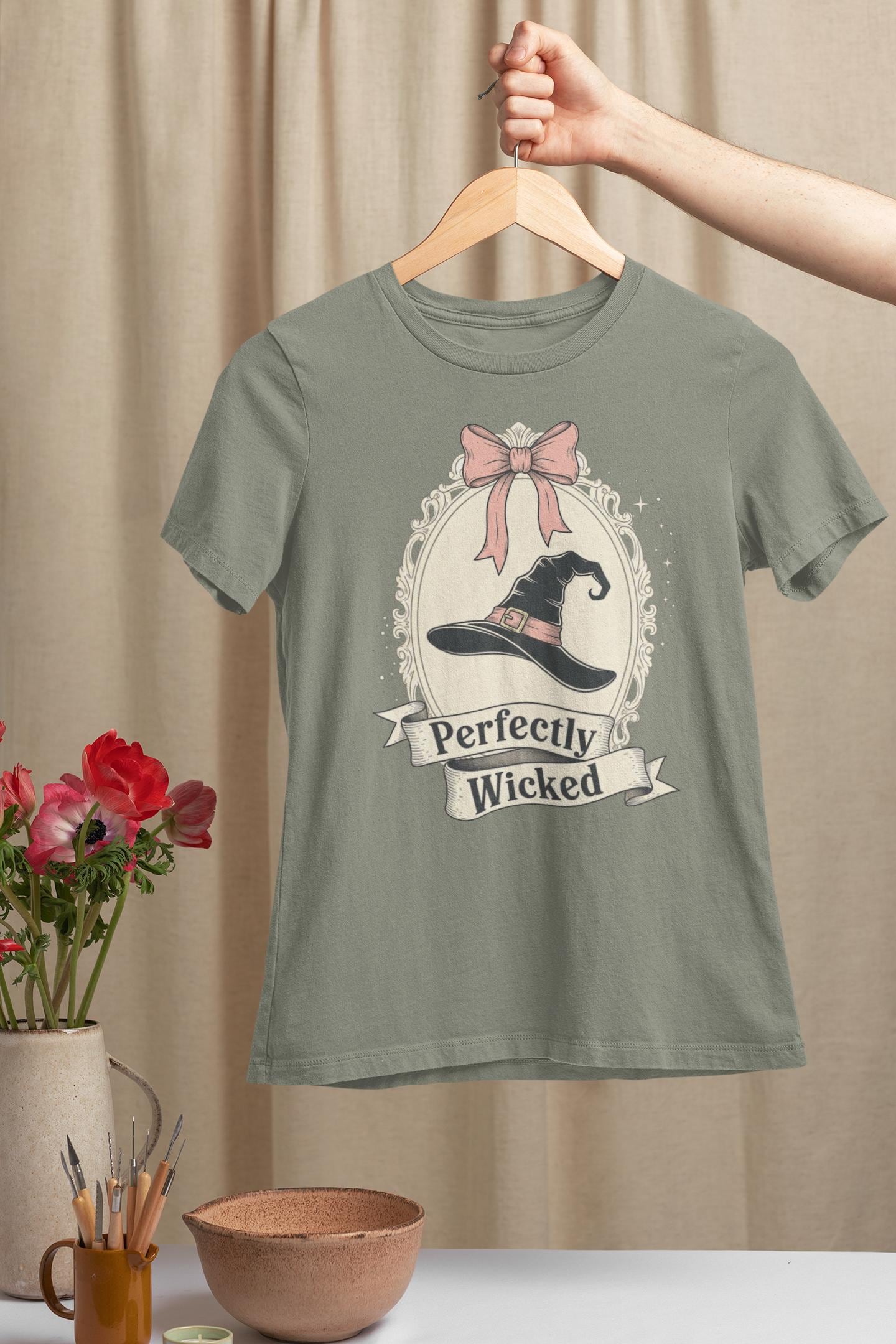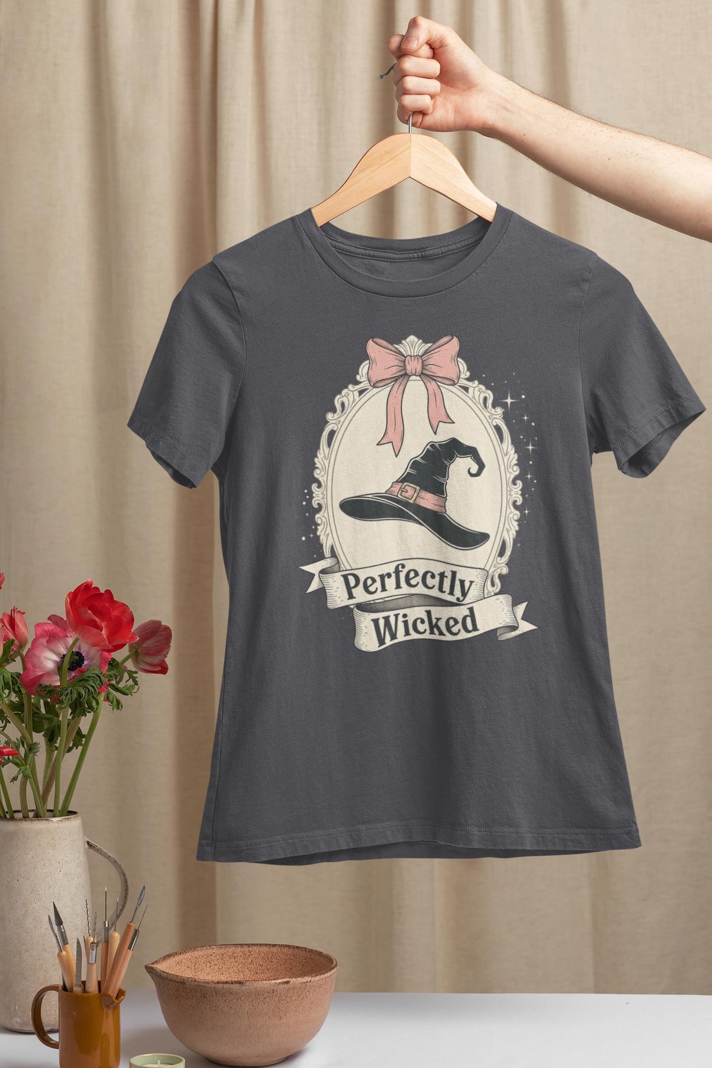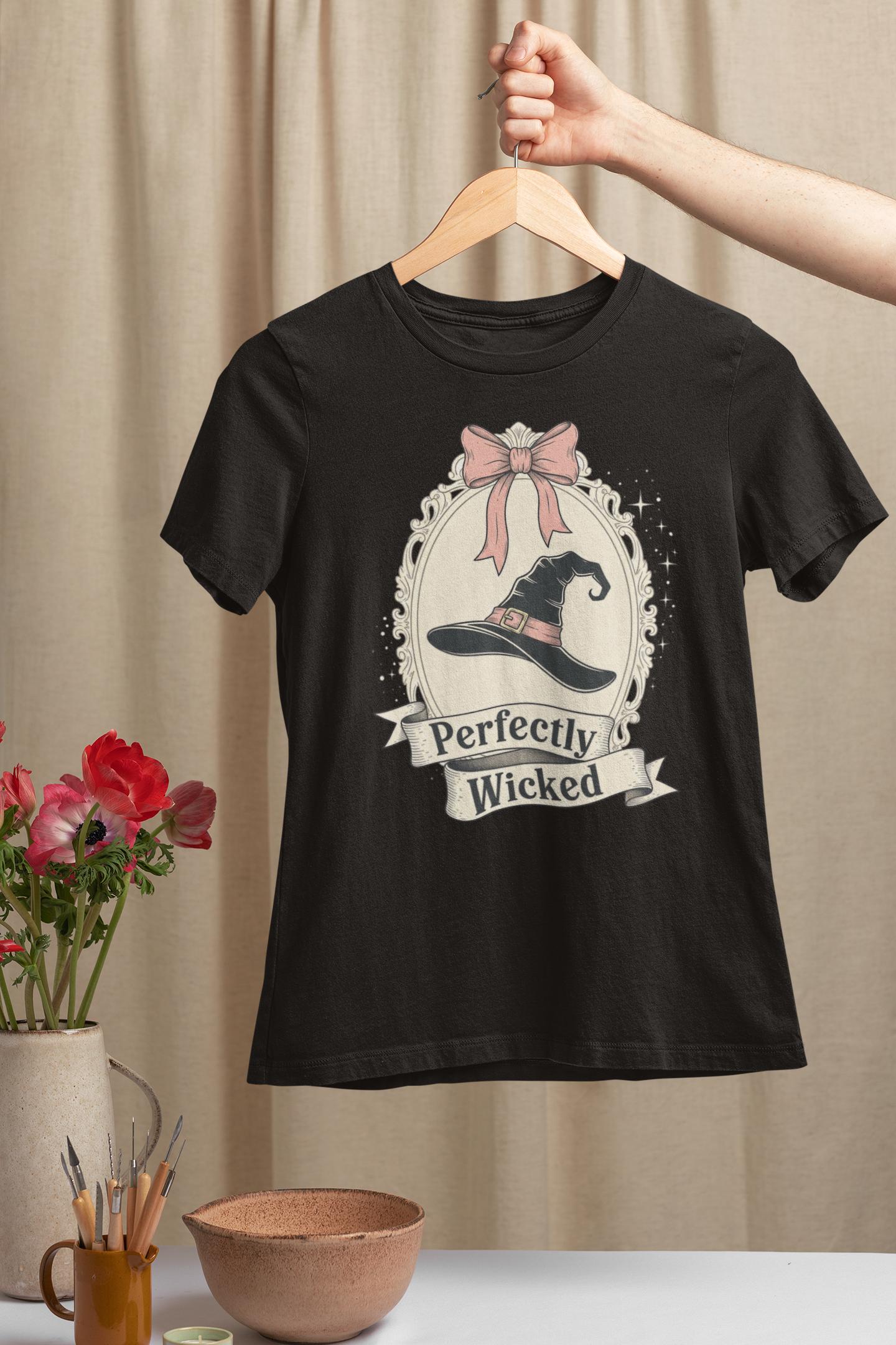 Discover the perfect Coquette Witch Shirt. This vintage-style cameo tee features a "Perfectly Wicked" slogan, blending a chic pink bow with a classic witch hat for a subtle nod to Broadway magic.