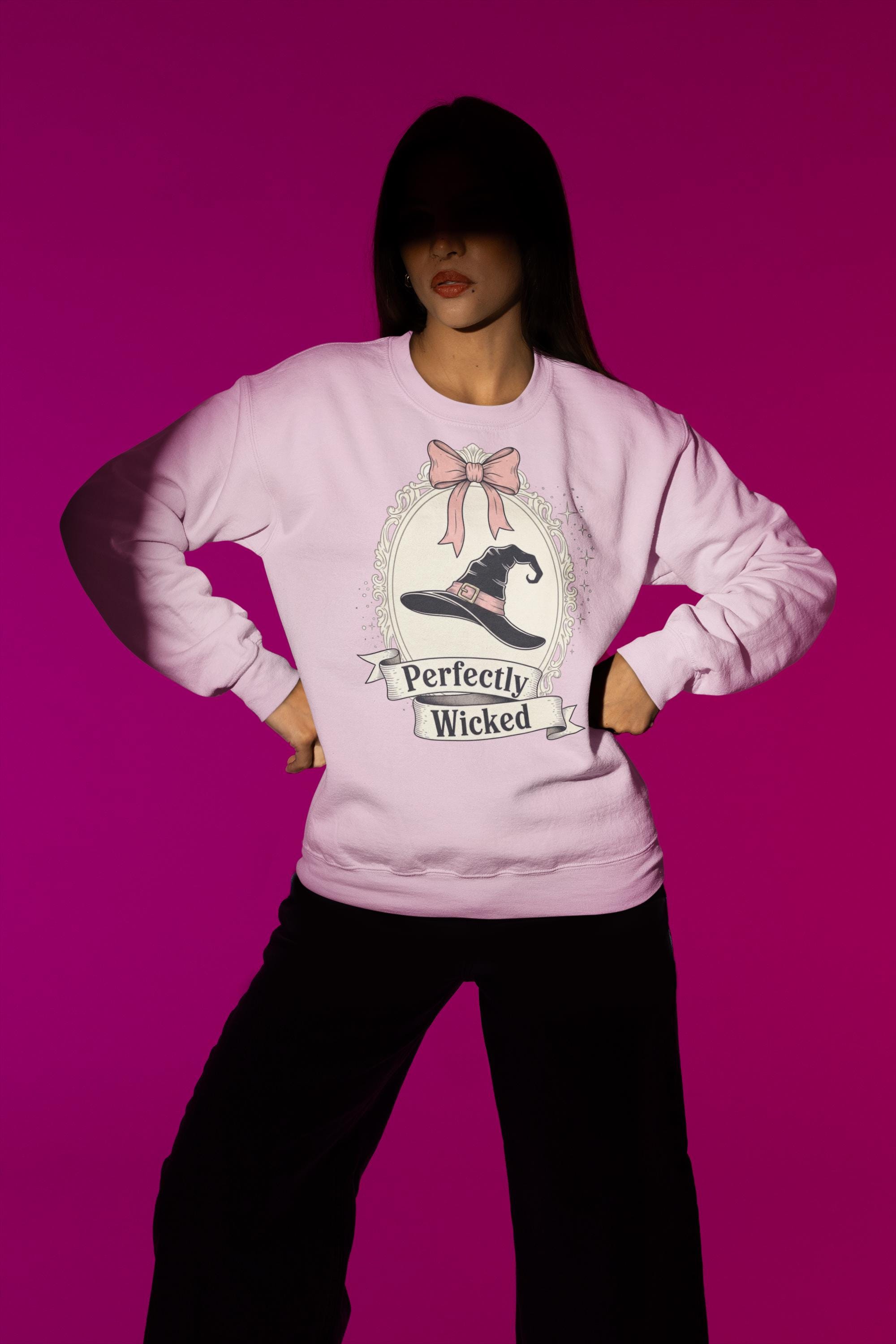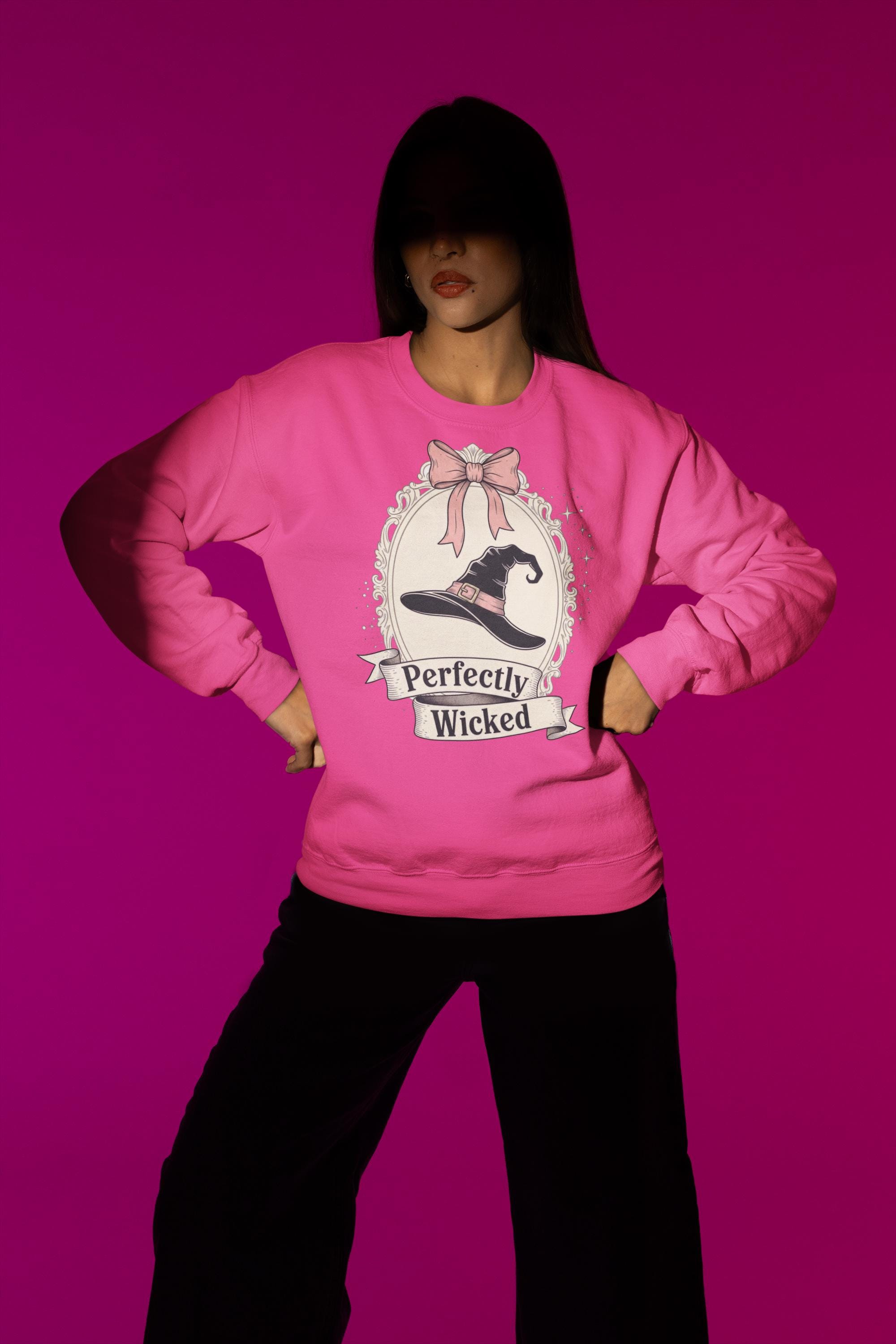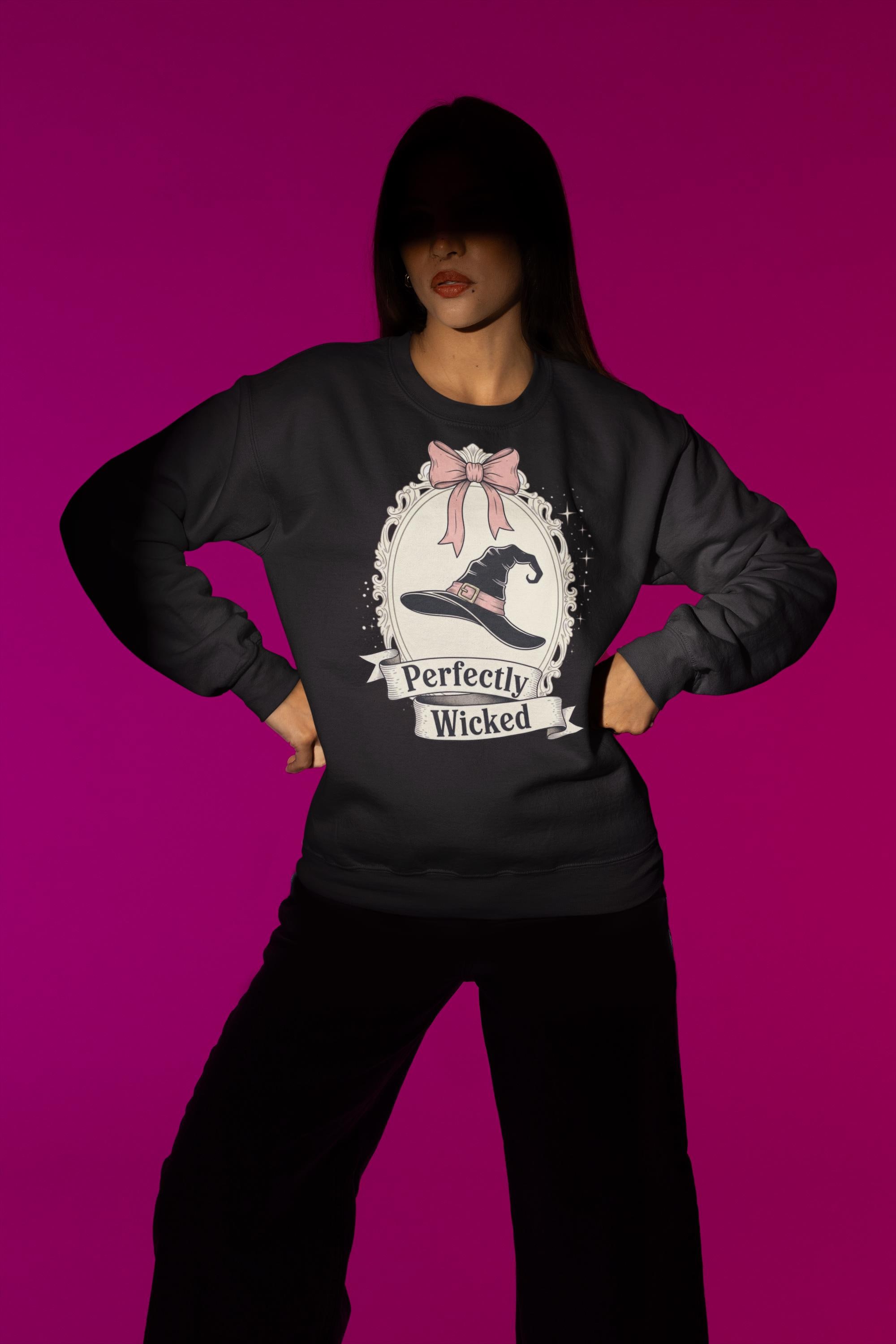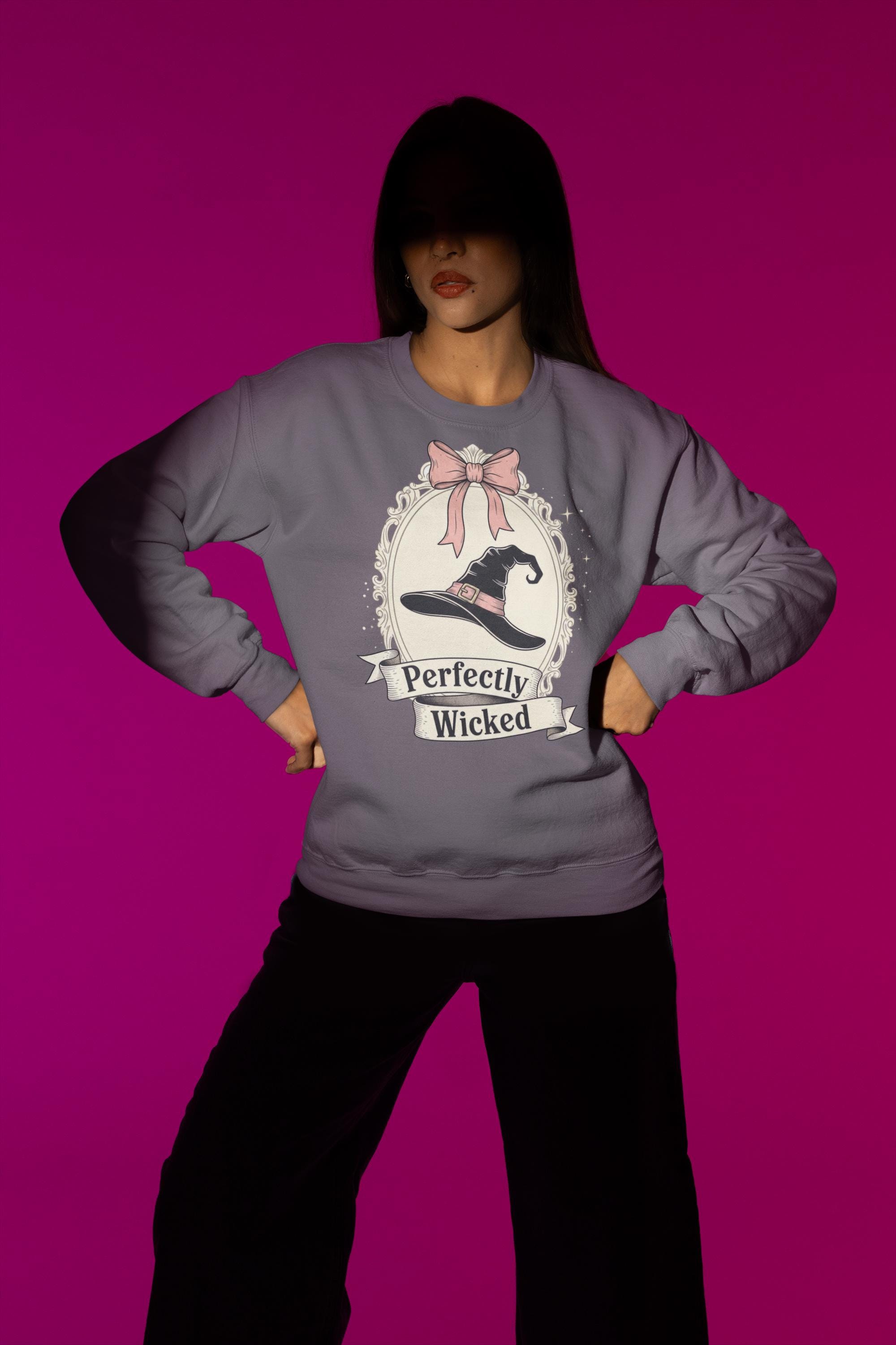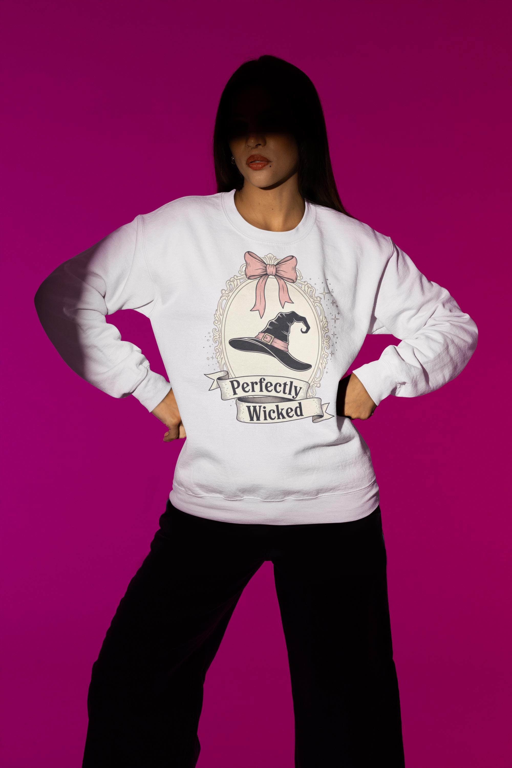 Discover the perfect Coquette Witch Shirt. This vintage-style cameo tee features a "Perfectly Wicked" slogan, blending a chic pink bow with a classic witch hat for a subtle nod to Broadway magic.