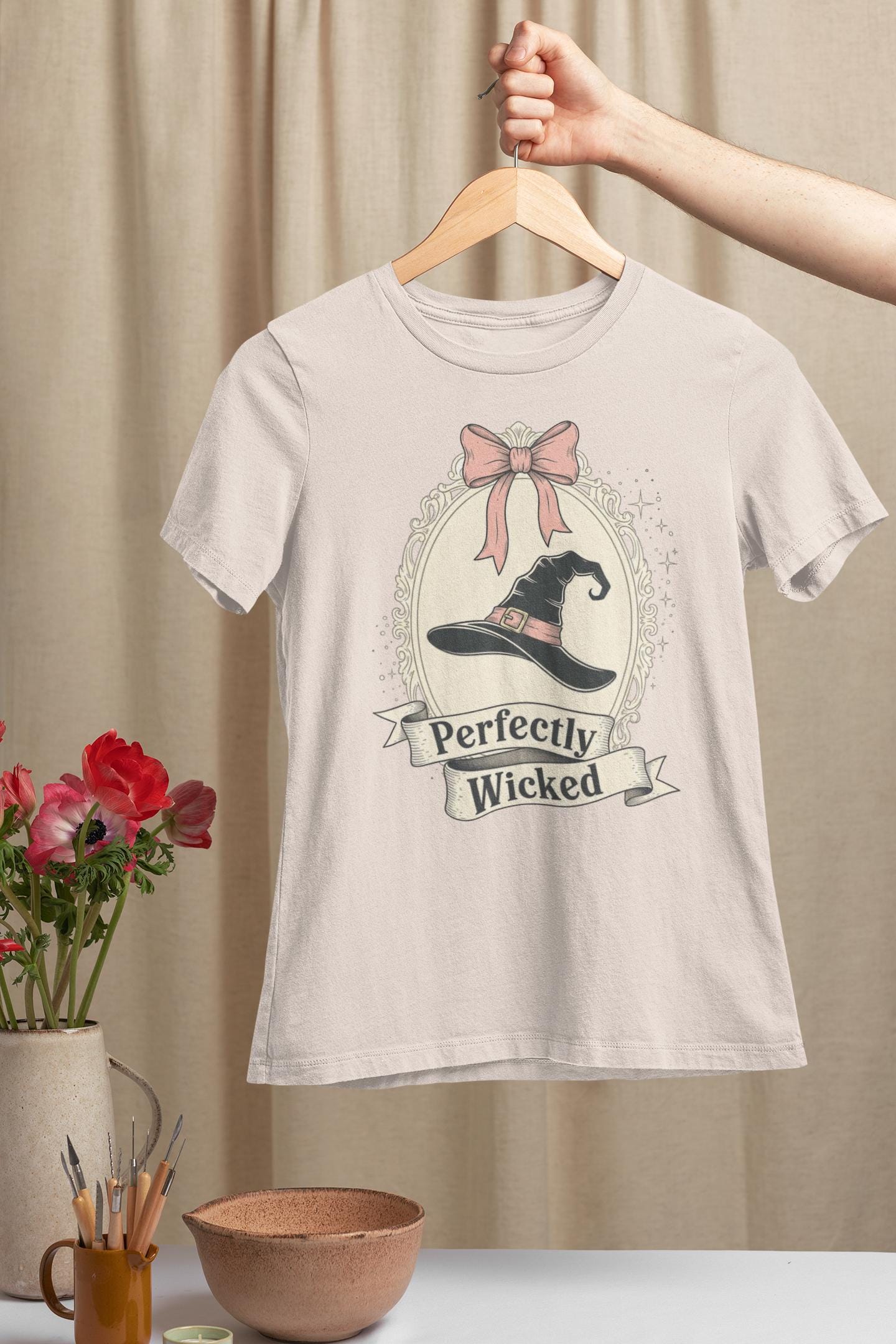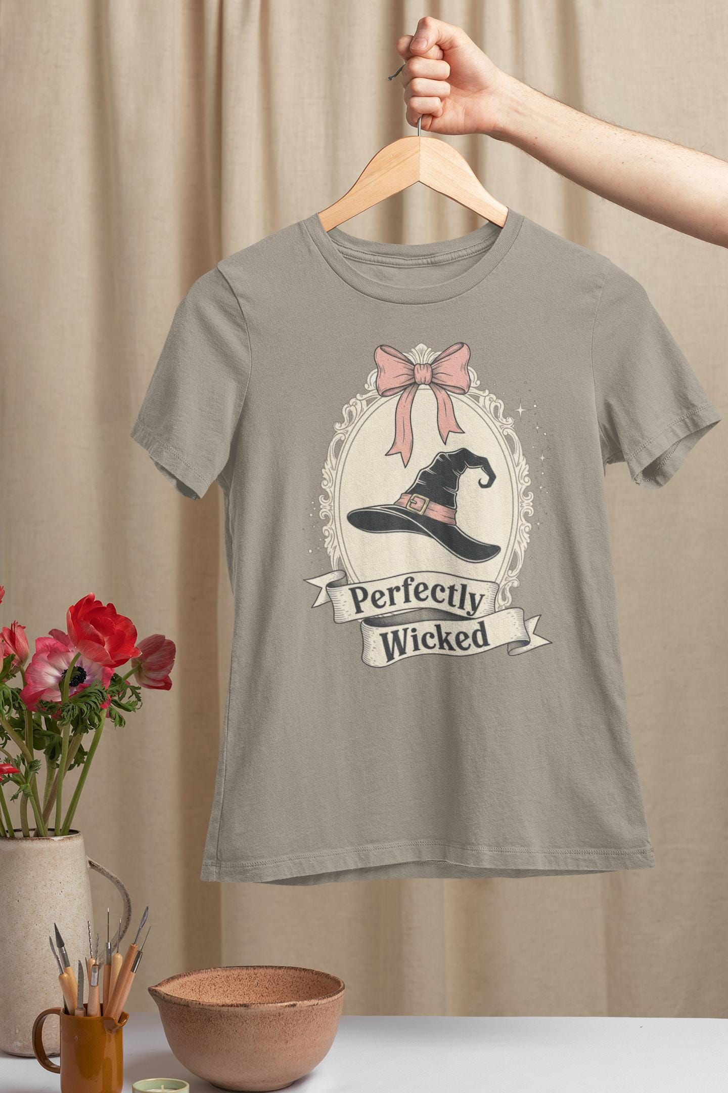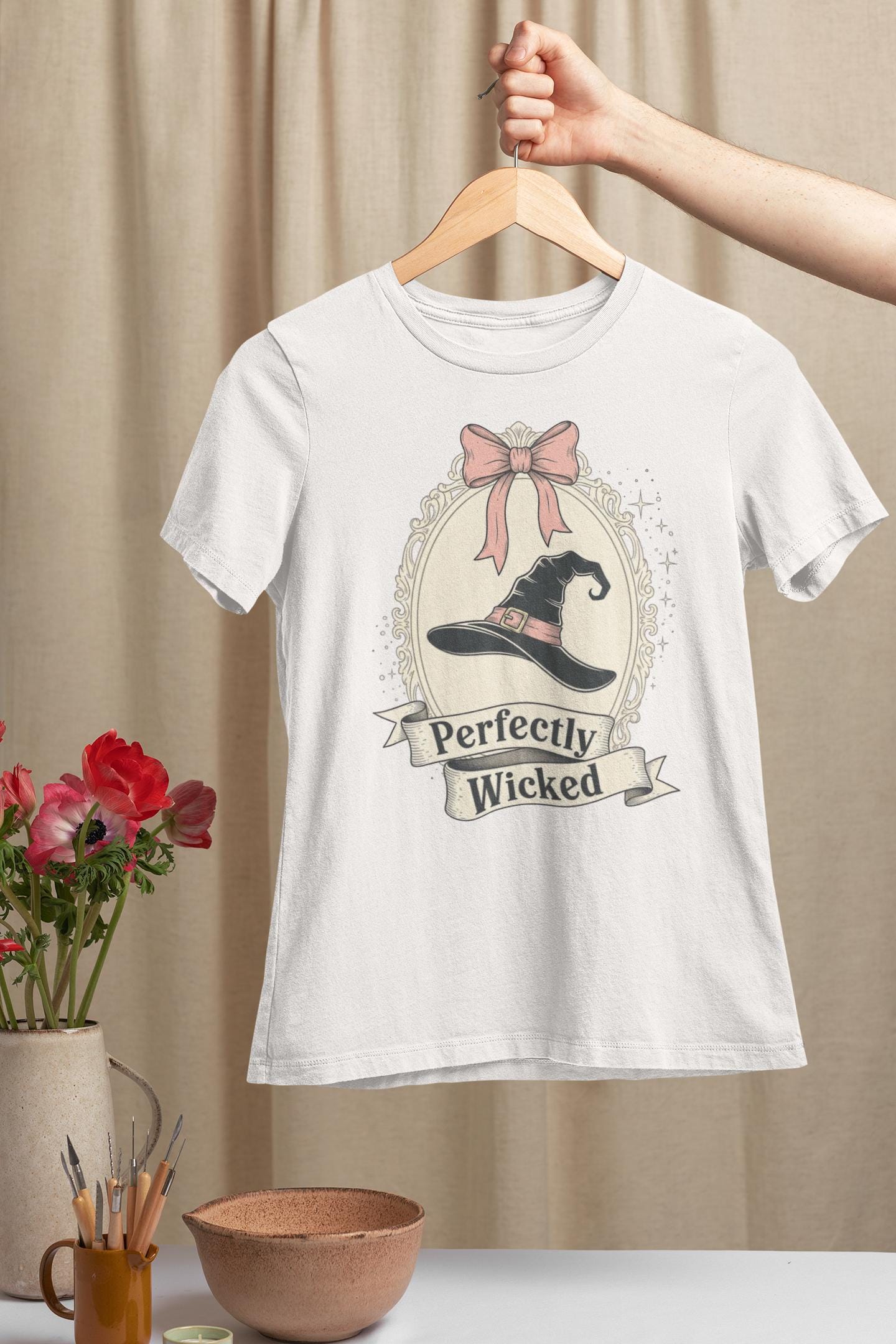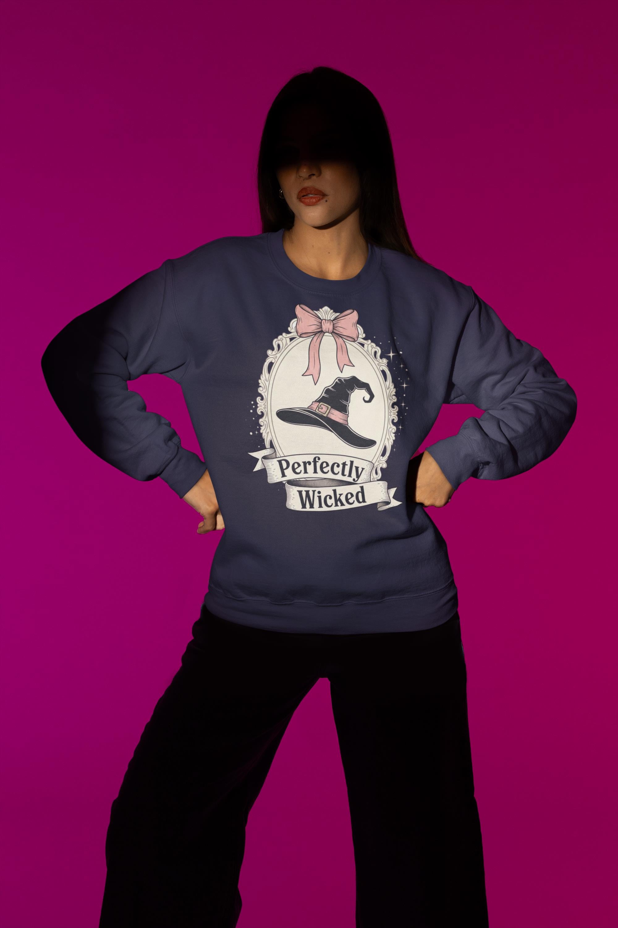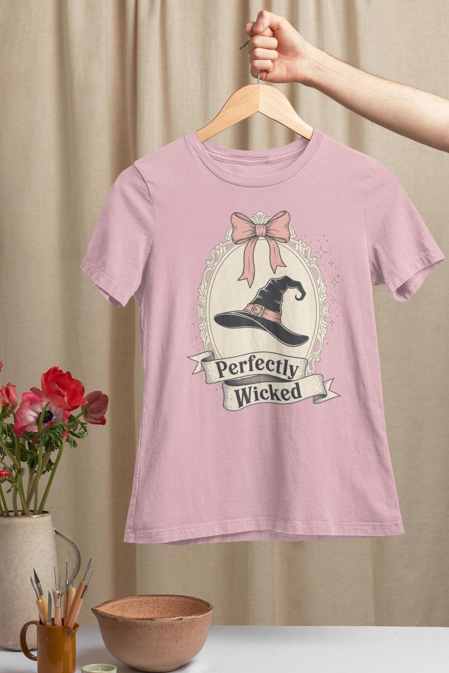 Discover the perfect Coquette Witch Shirt. This vintage-style cameo tee features a "Perfectly Wicked" slogan, blending a chic pink bow with a classic witch hat for a subtle nod to Broadway magic.