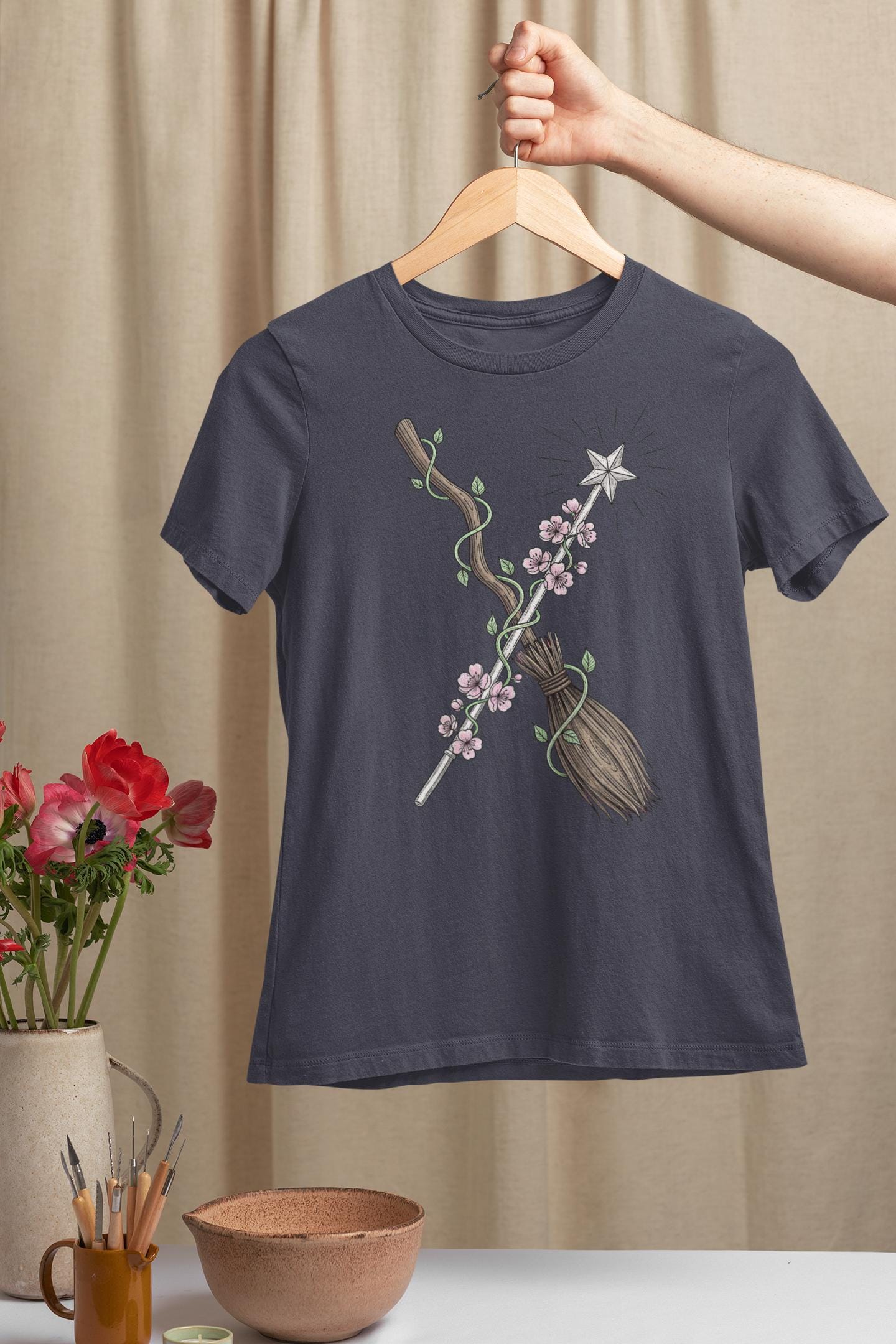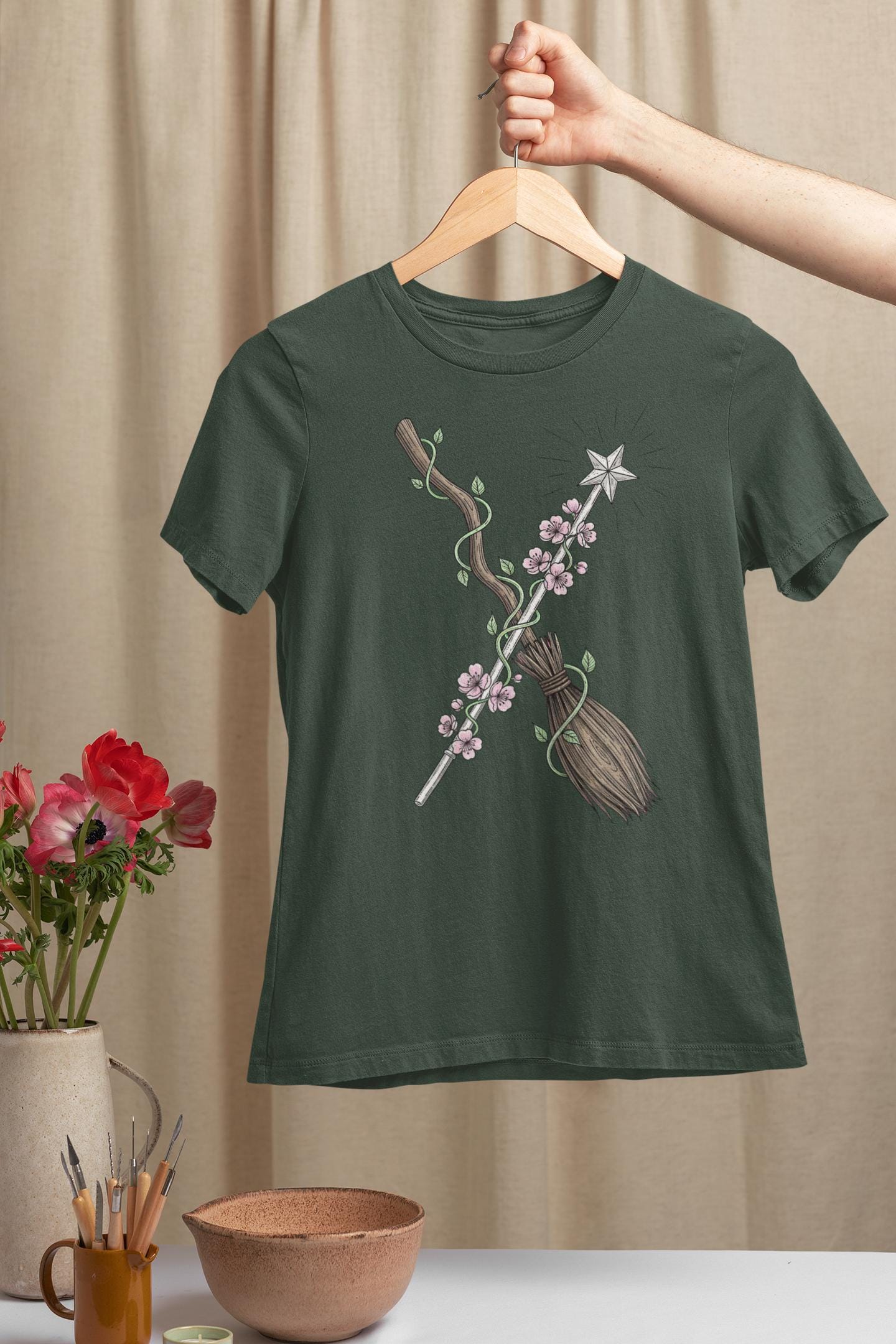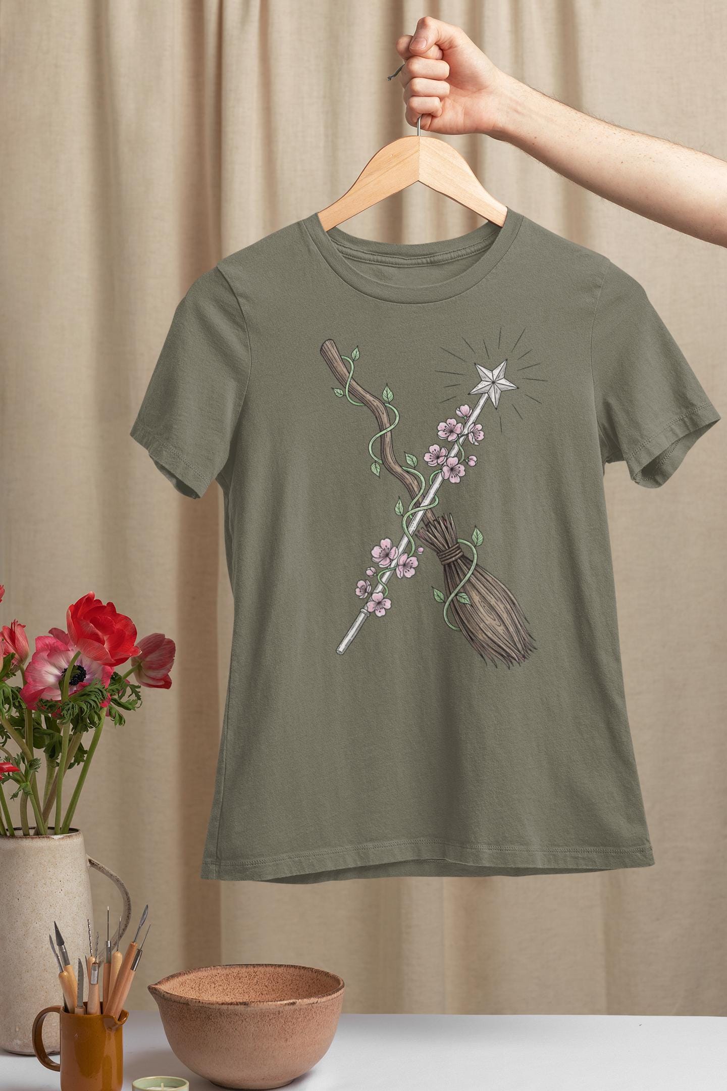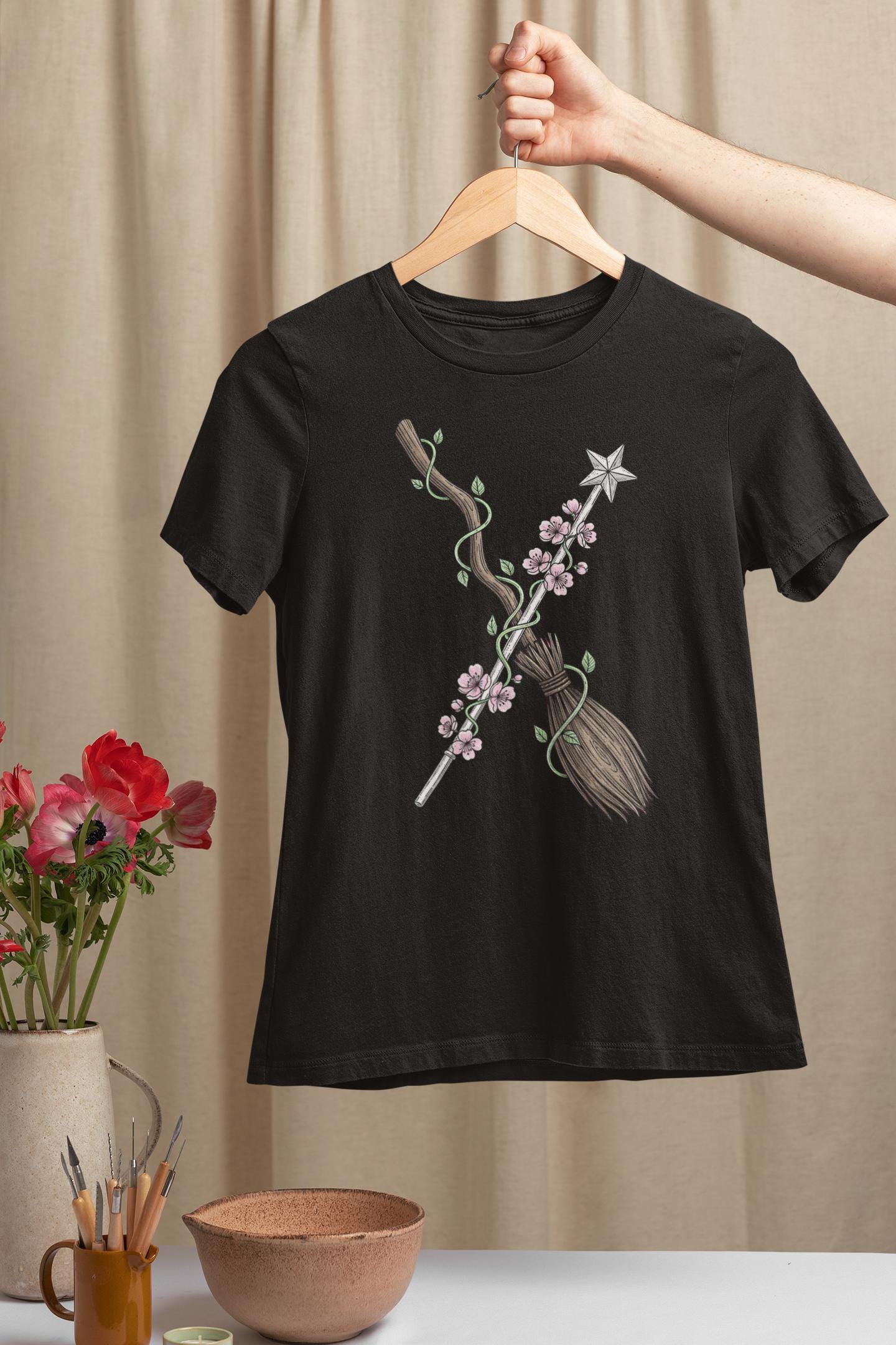 • Vintage Botanical Illustration: Showcases a beautifully detailed, engraving-style drawing of a crossed magic wand and witch's broom, entwined with delicate flowers and vines. • Subtle Wicked Inspired Homage: Captures the story's essence through elegant symbolism, appealing to fans who prefer understated designs over logos. • Bookish & Witchy Aesthetic: Merges the popular bookish, dark academia, and witchy styles, making it versatile for various tastes.