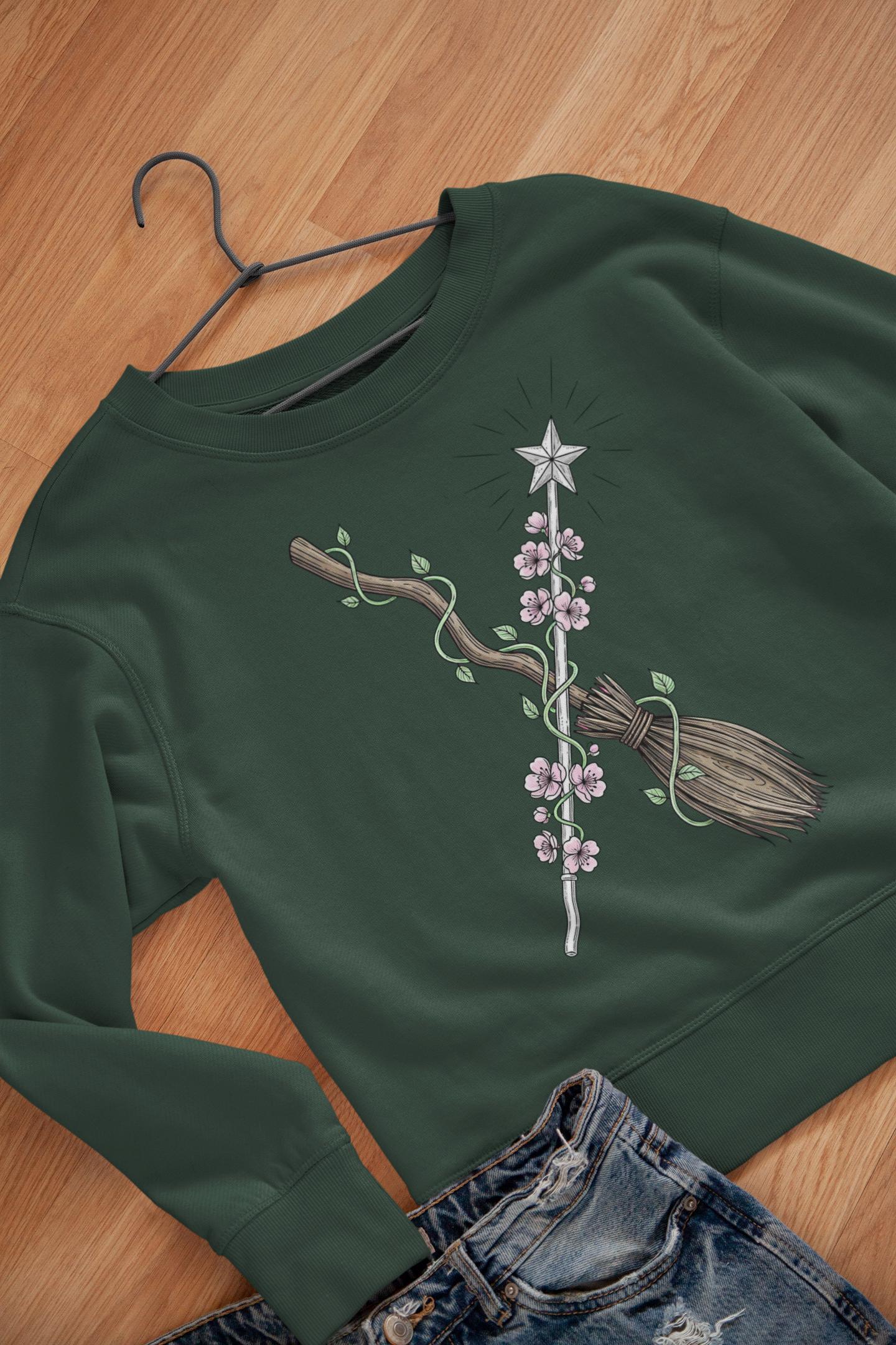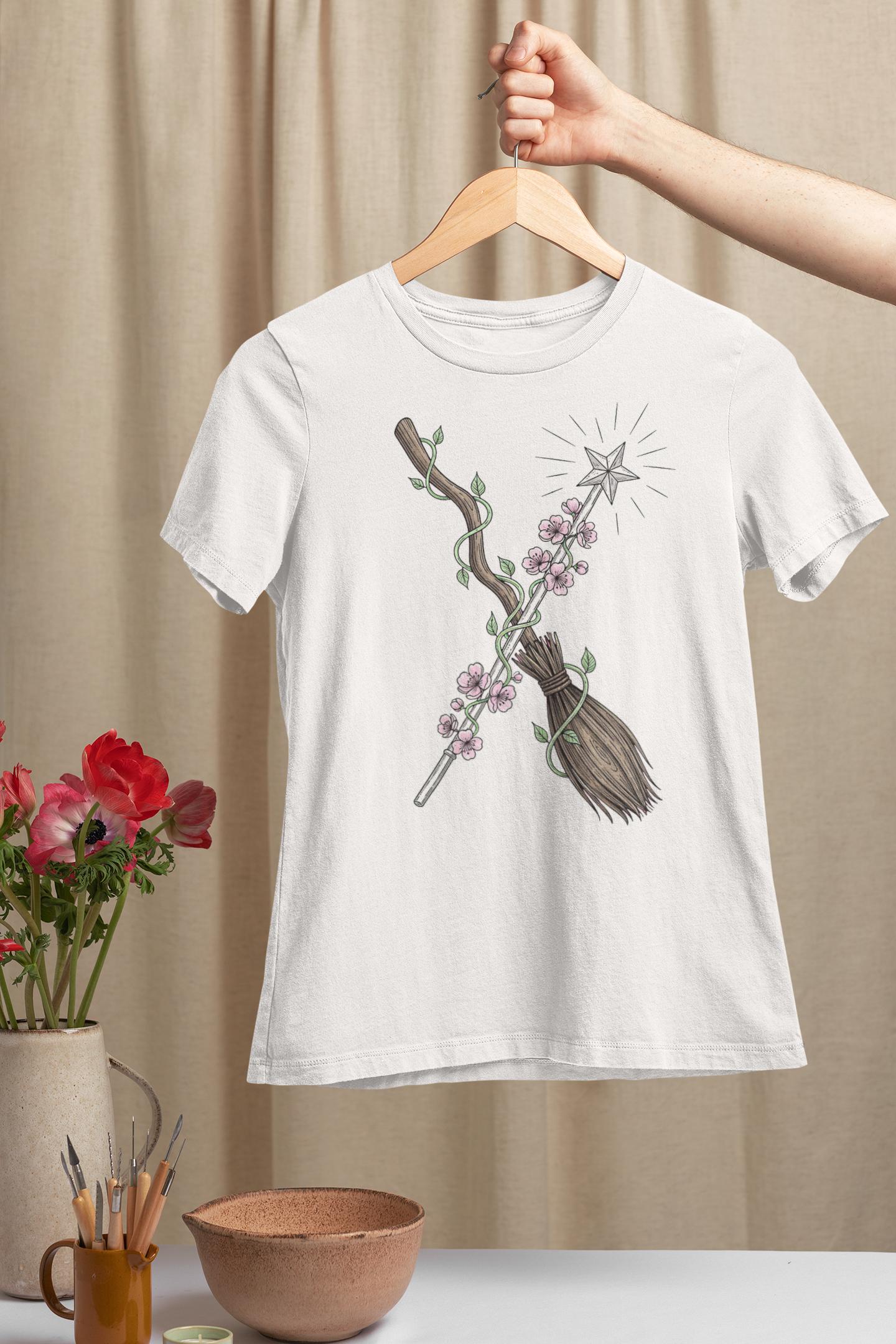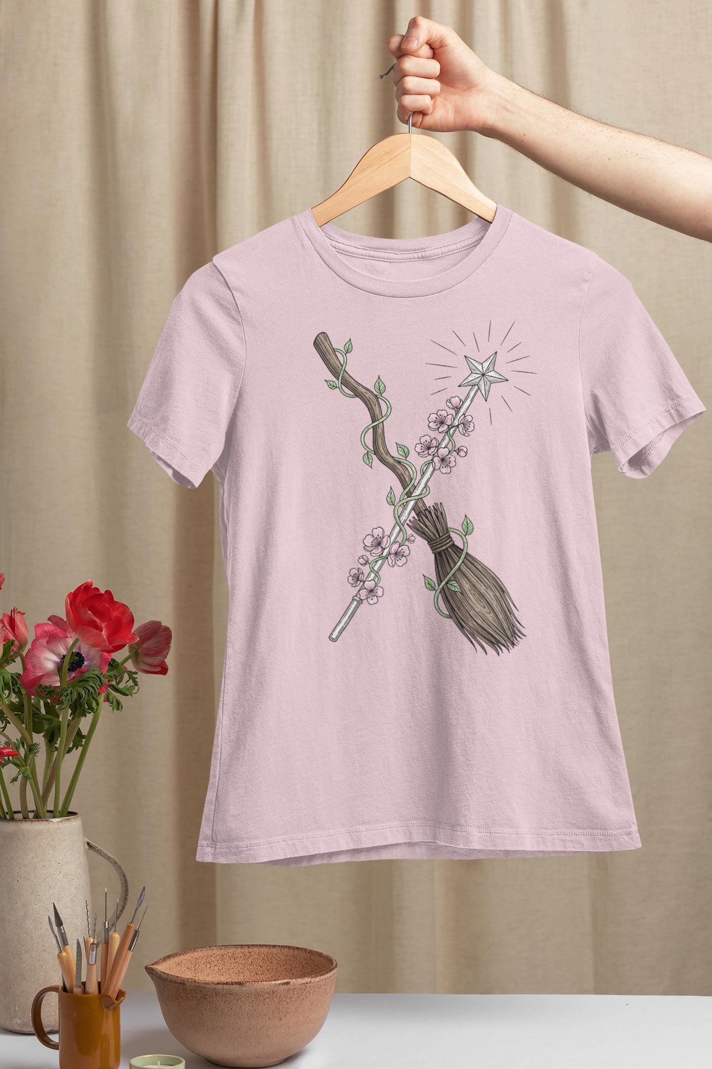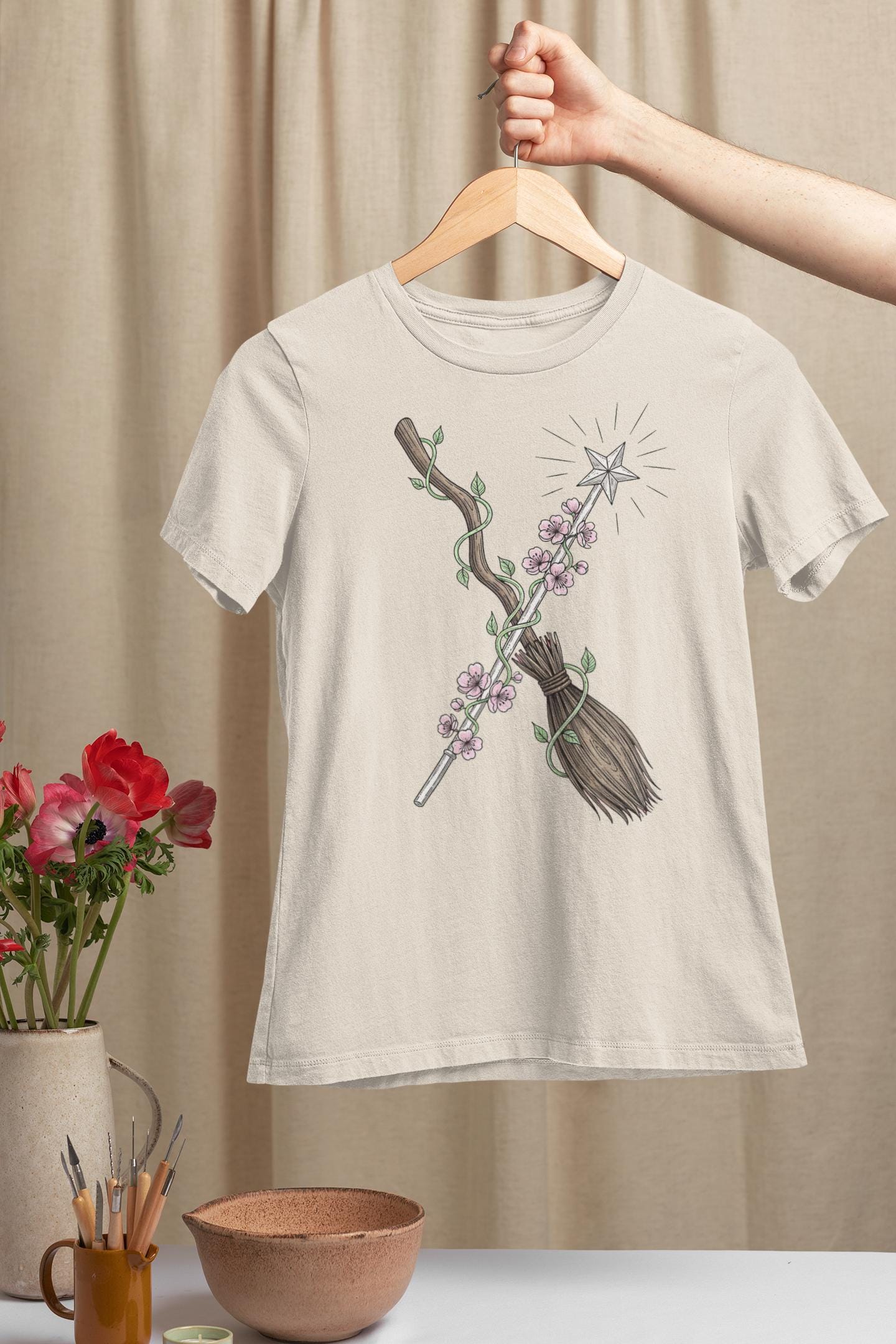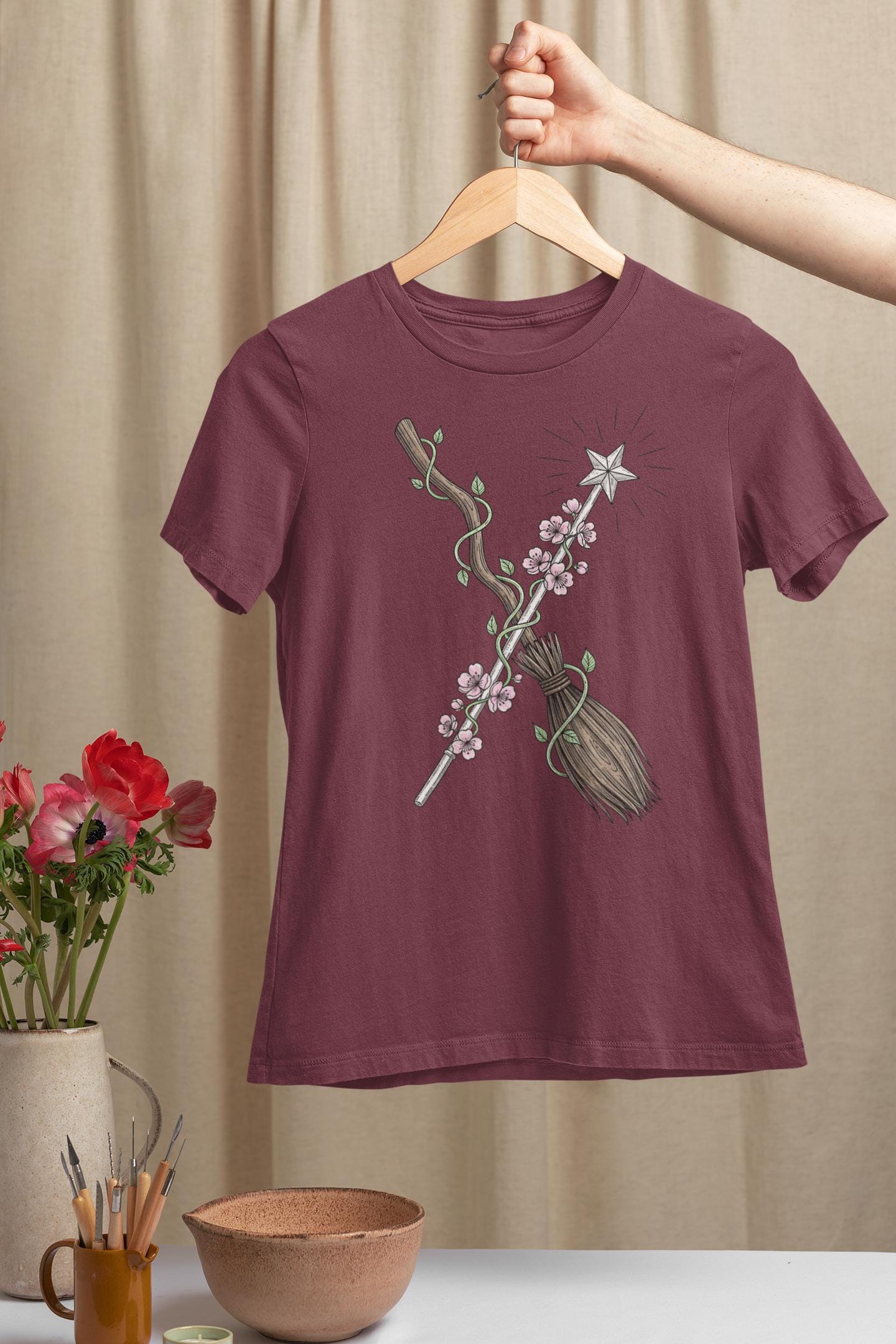 • Vintage Botanical Illustration: Showcases a beautifully detailed, engraving-style drawing of a crossed magic wand and witch's broom, entwined with delicate flowers and vines. • Subtle Wicked Inspired Homage: Captures the story's essence through elegant symbolism, appealing to fans who prefer understated designs over logos. • Bookish & Witchy Aesthetic: Merges the popular bookish, dark academia, and witchy styles, making it versatile for various tastes.
