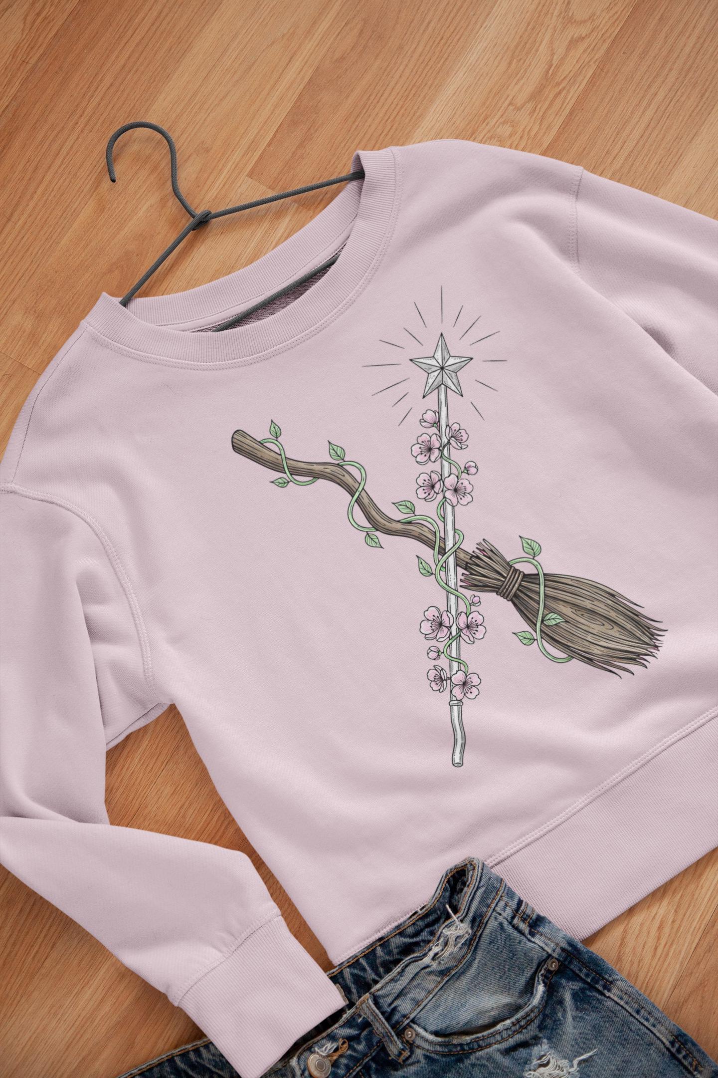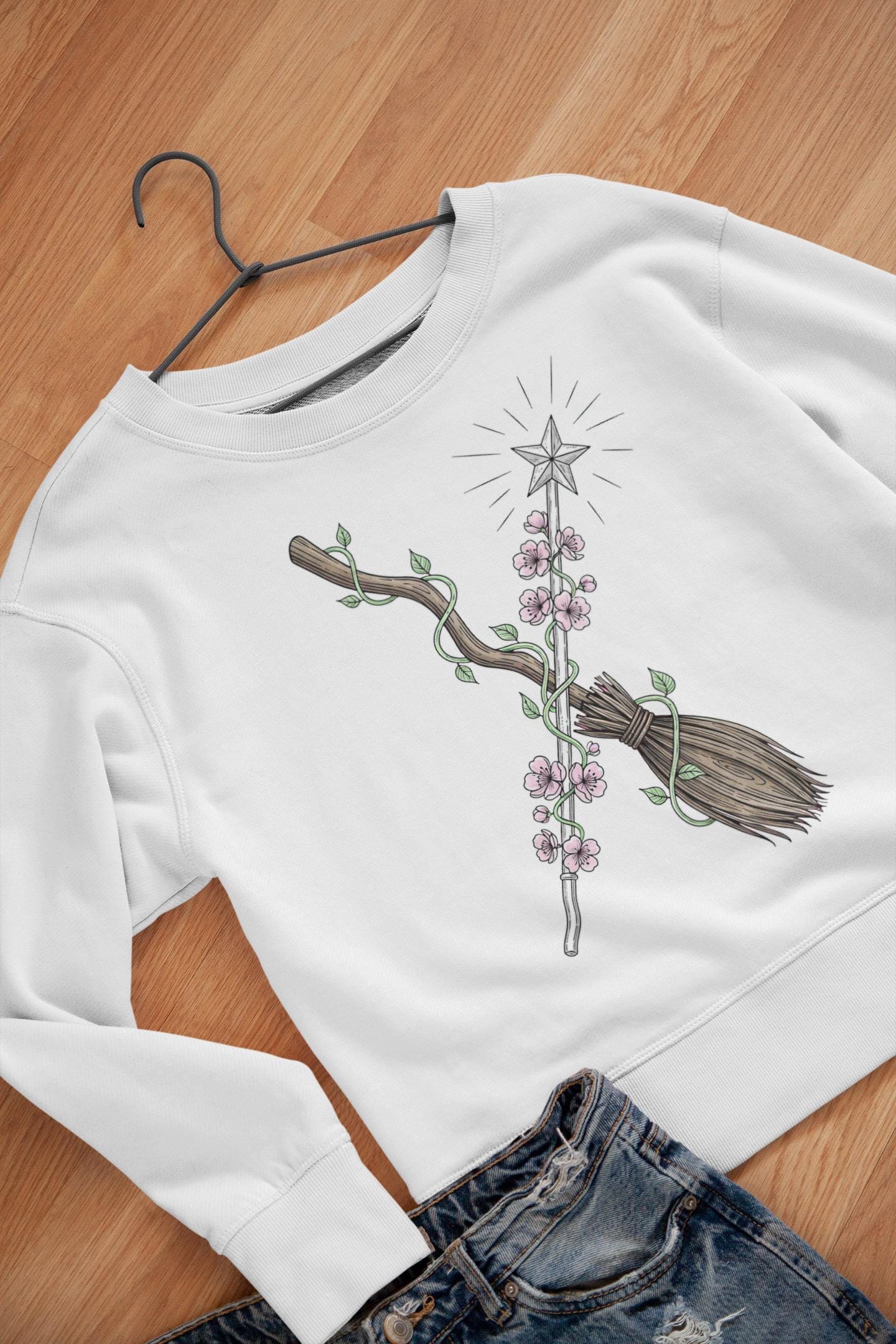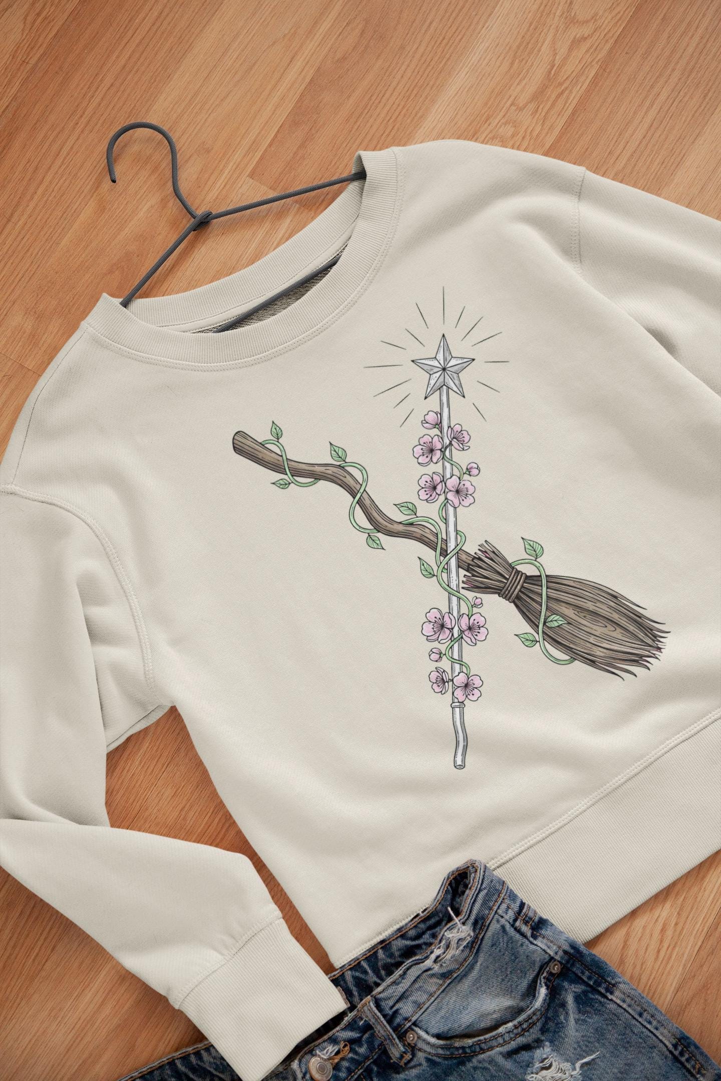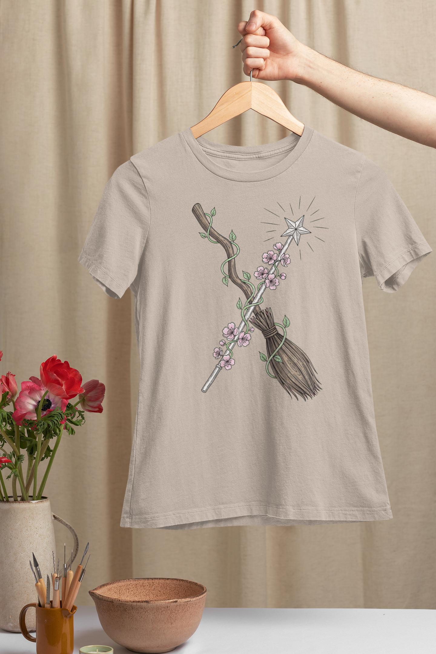 • Vintage Botanical Illustration: Showcases a beautifully detailed, engraving-style drawing of a crossed magic wand and witch's broom, entwined with delicate flowers and vines. • Subtle Wicked Inspired Homage: Captures the story's essence through elegant symbolism, appealing to fans who prefer understated designs over logos. • Bookish & Witchy Aesthetic: Merges the popular bookish, dark academia, and witchy styles, making it versatile for various tastes.