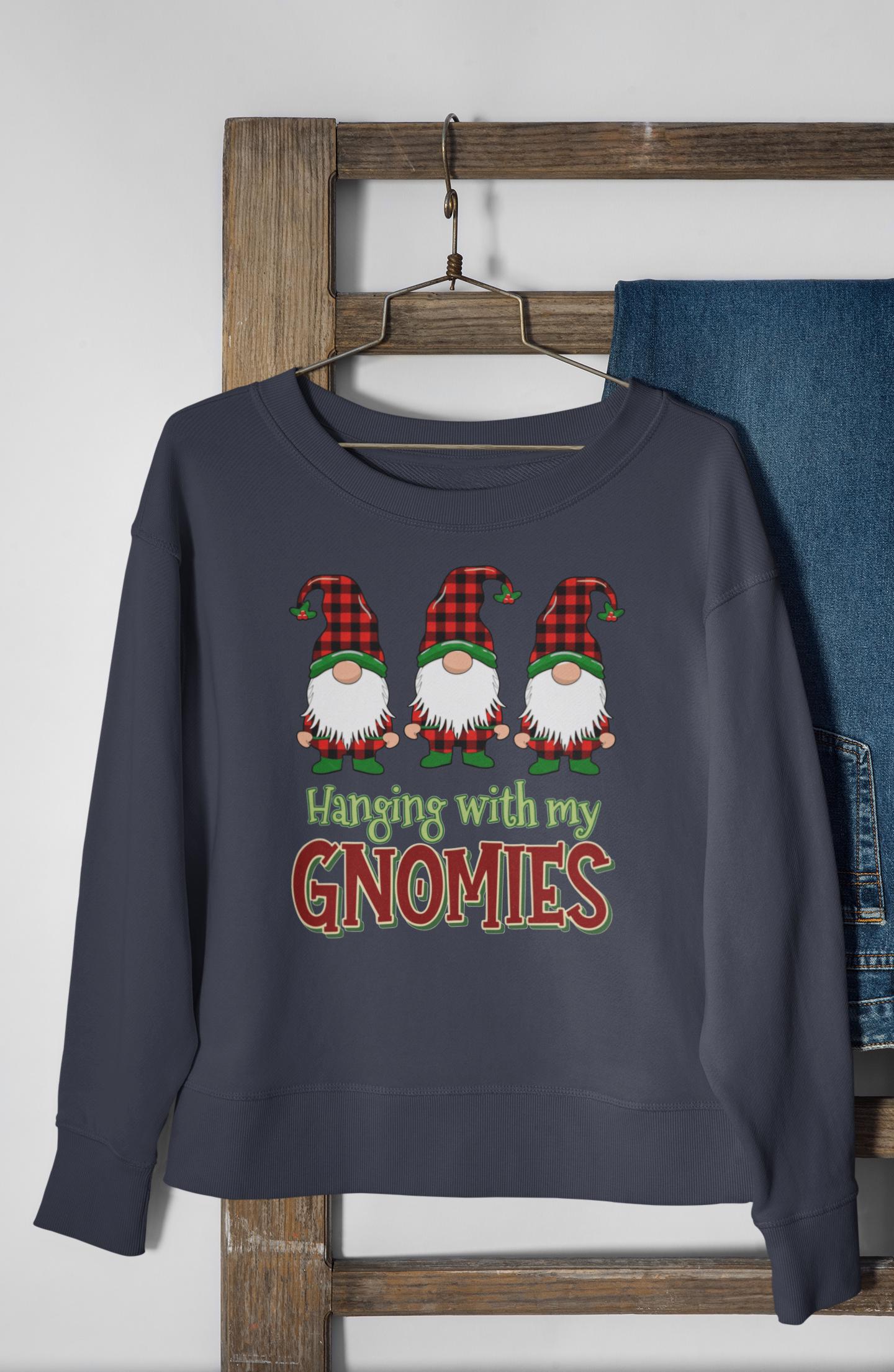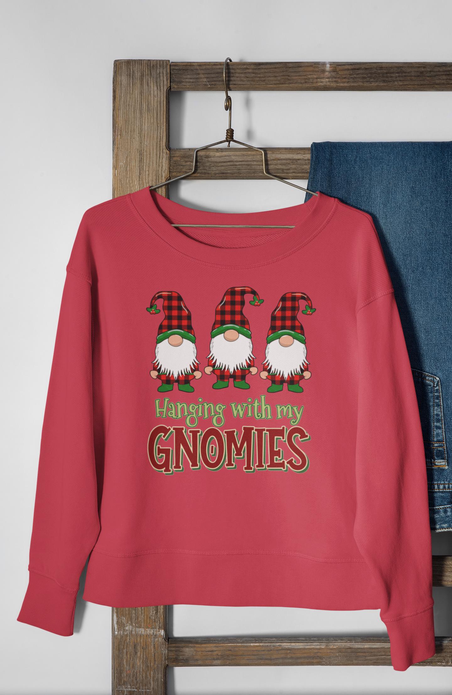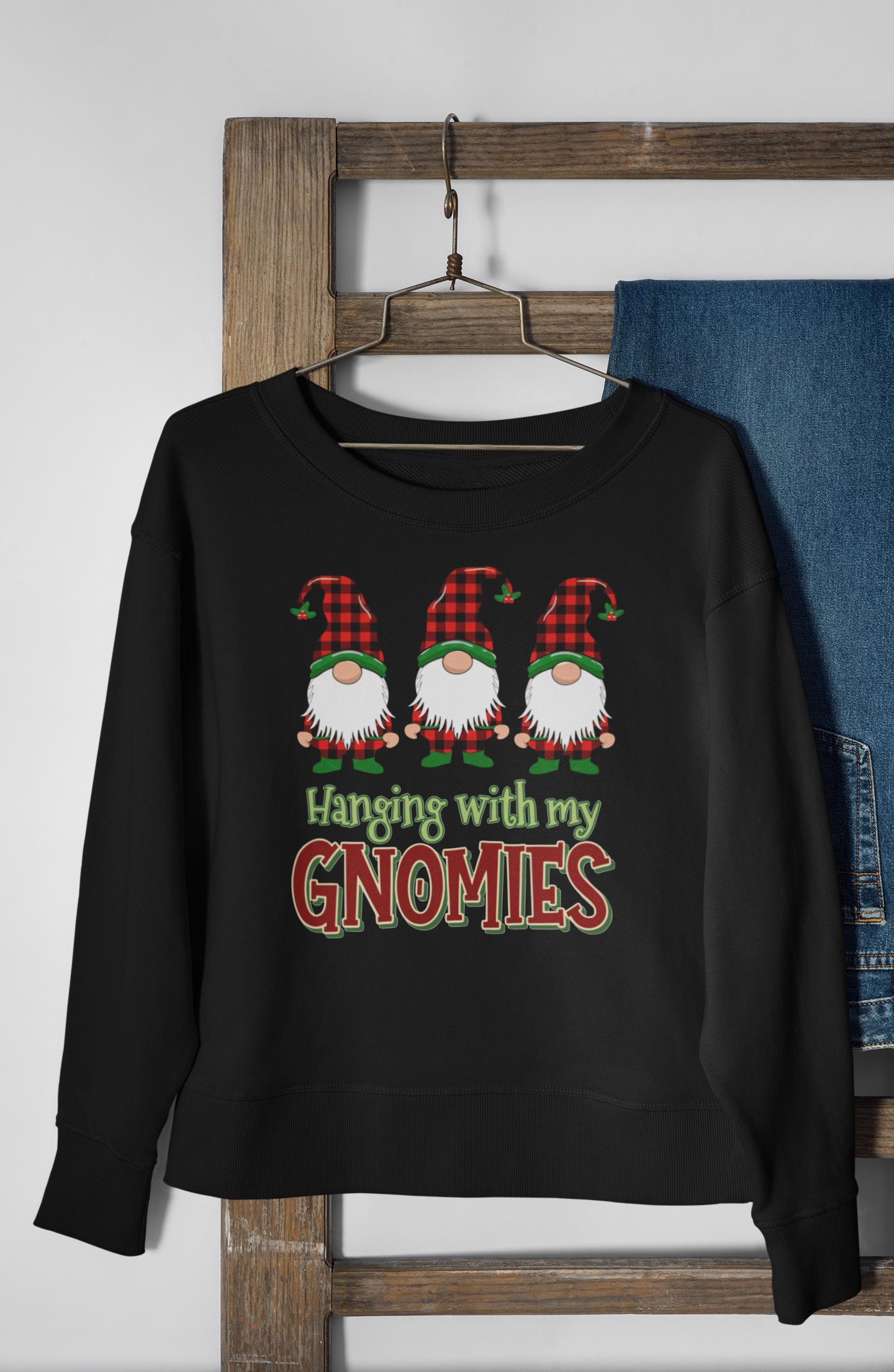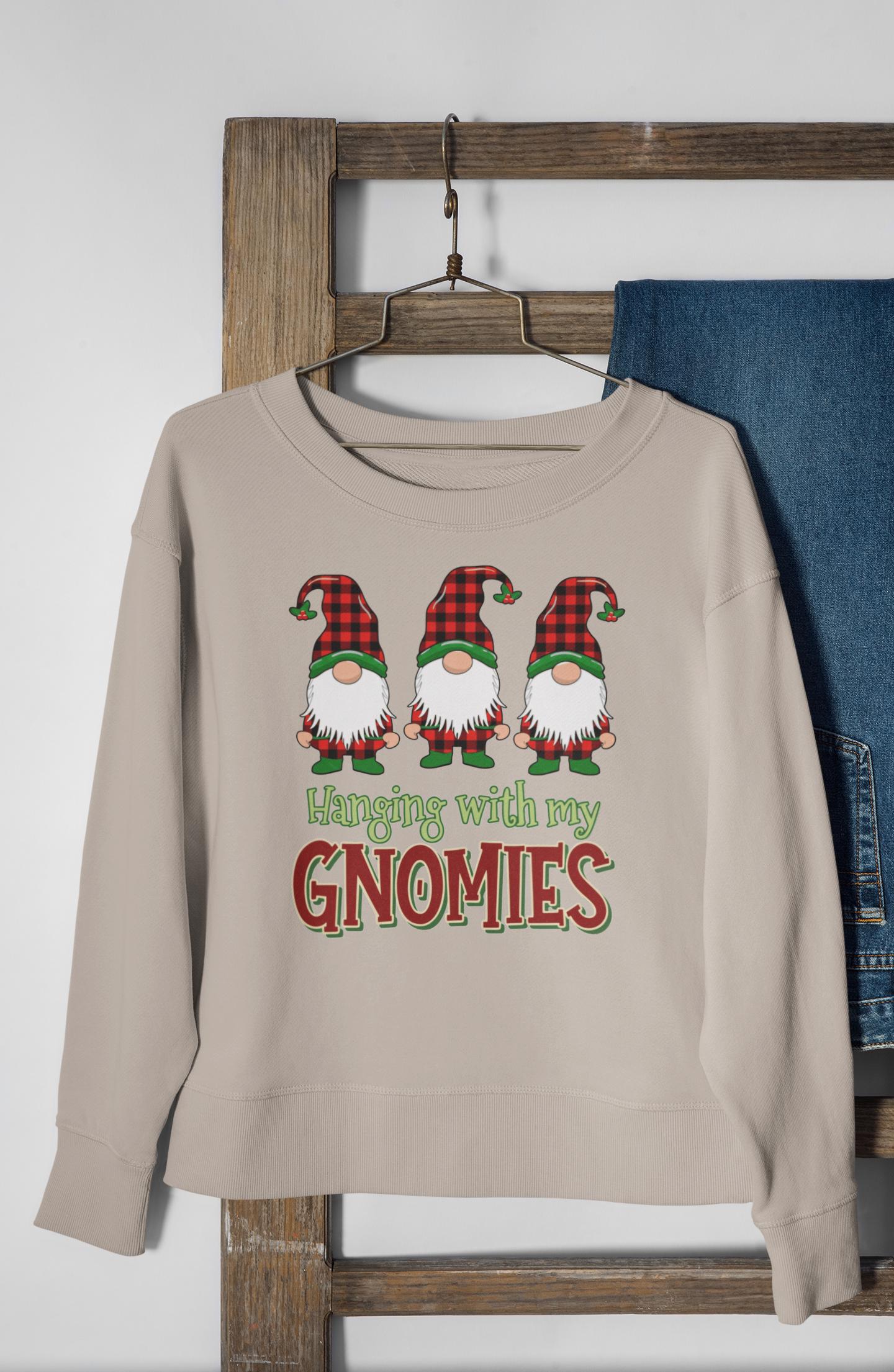 This "Hanging With My Gnomies" sweatshirt combines classic Christmas humor with the popular Buffalo Plaid aesthetic, designed for anyone looking for a fun and cozy statement piece this holiday season.