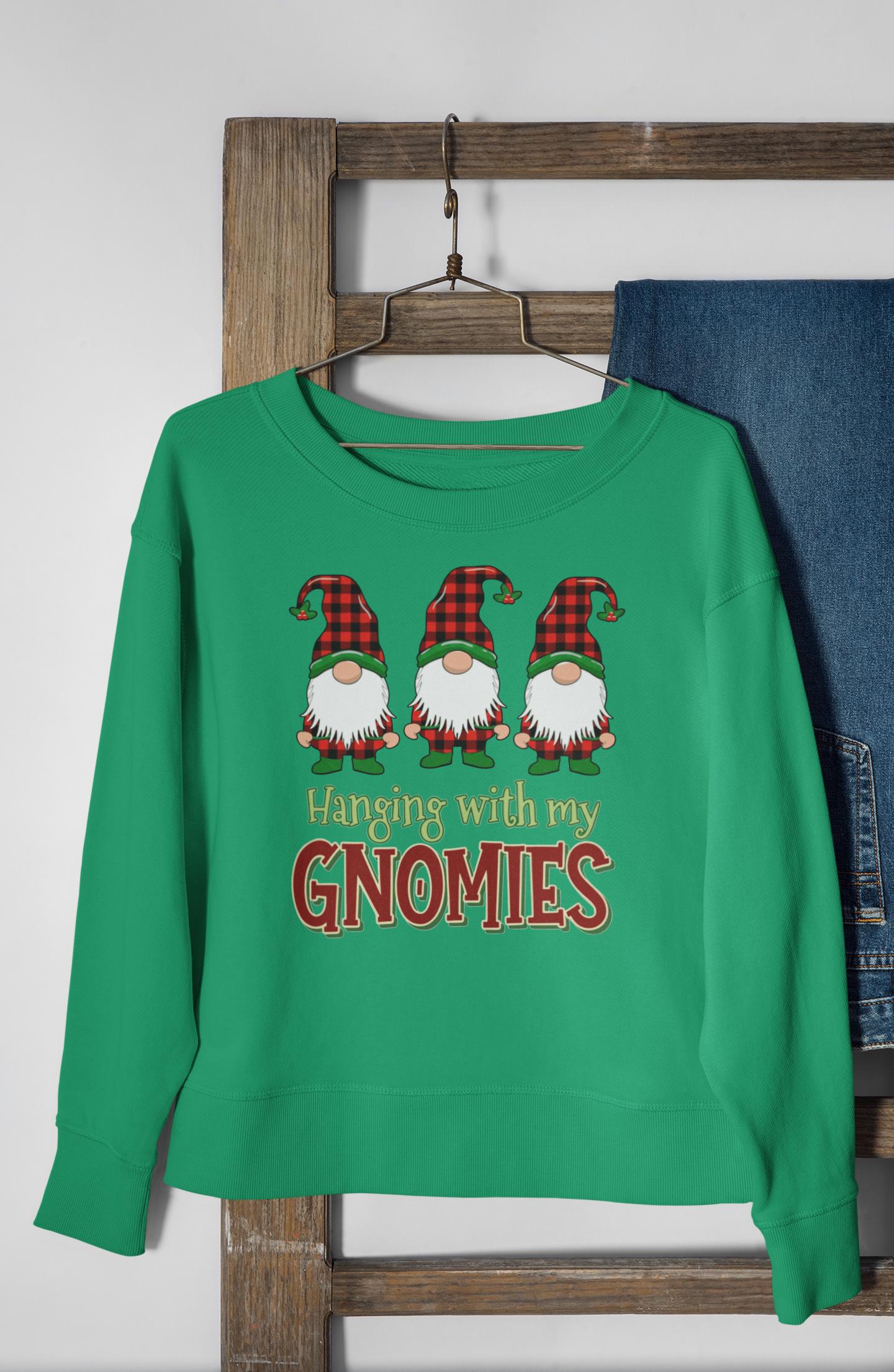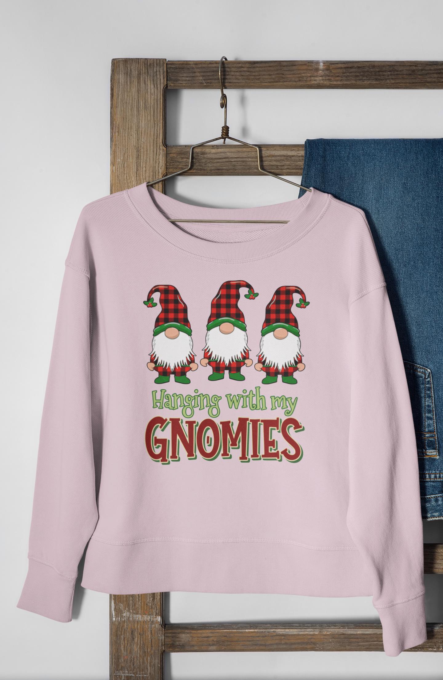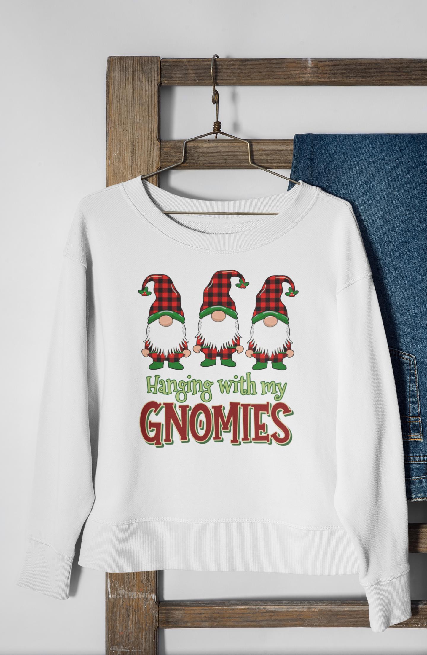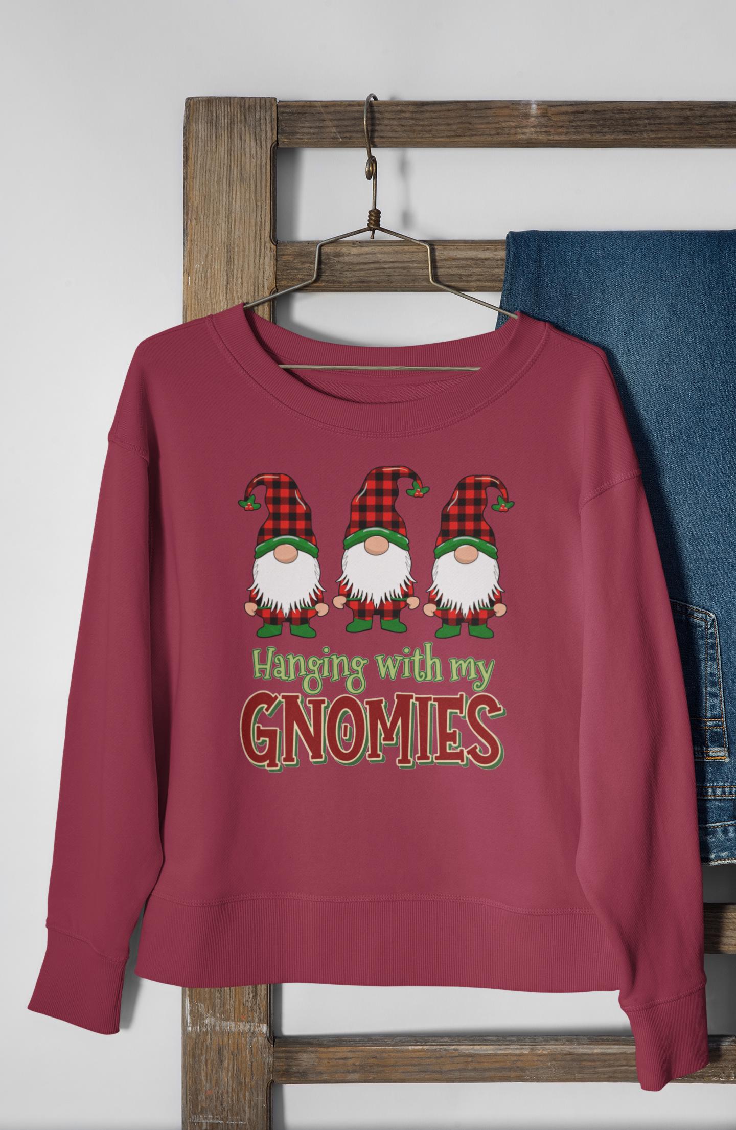 This "Hanging With My Gnomies" sweatshirt combines classic Christmas humor with the popular Buffalo Plaid aesthetic, designed for anyone looking for a fun and cozy statement piece this holiday season.