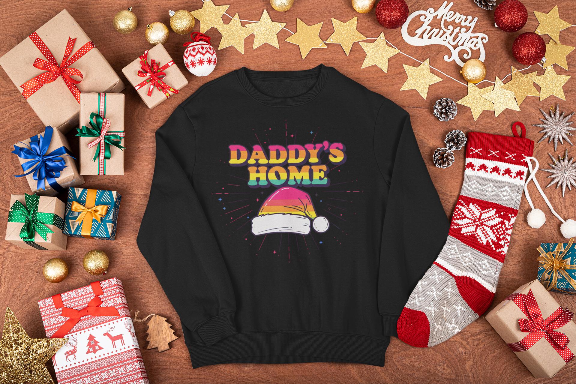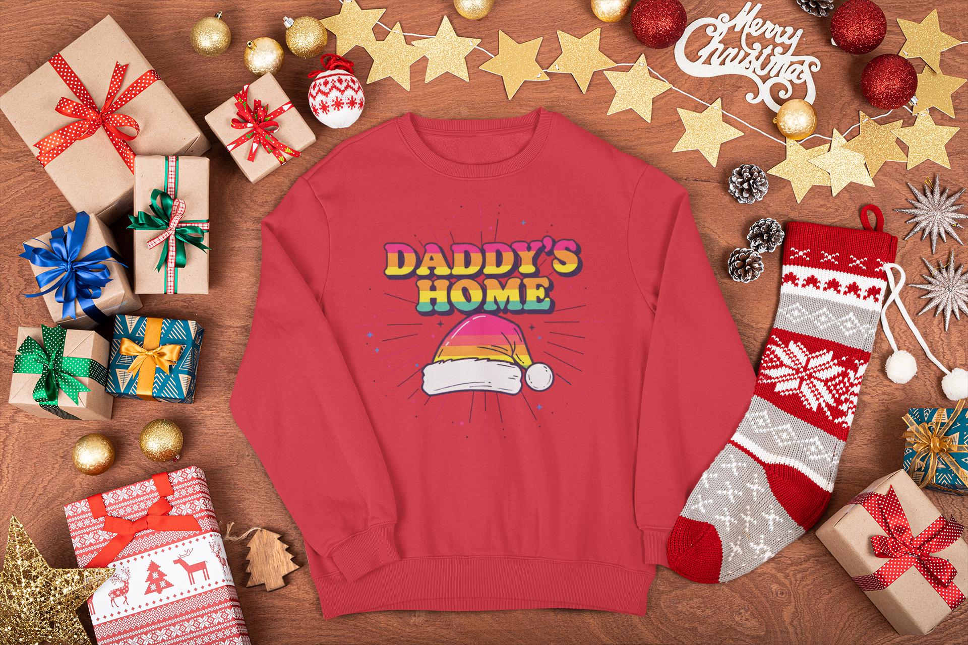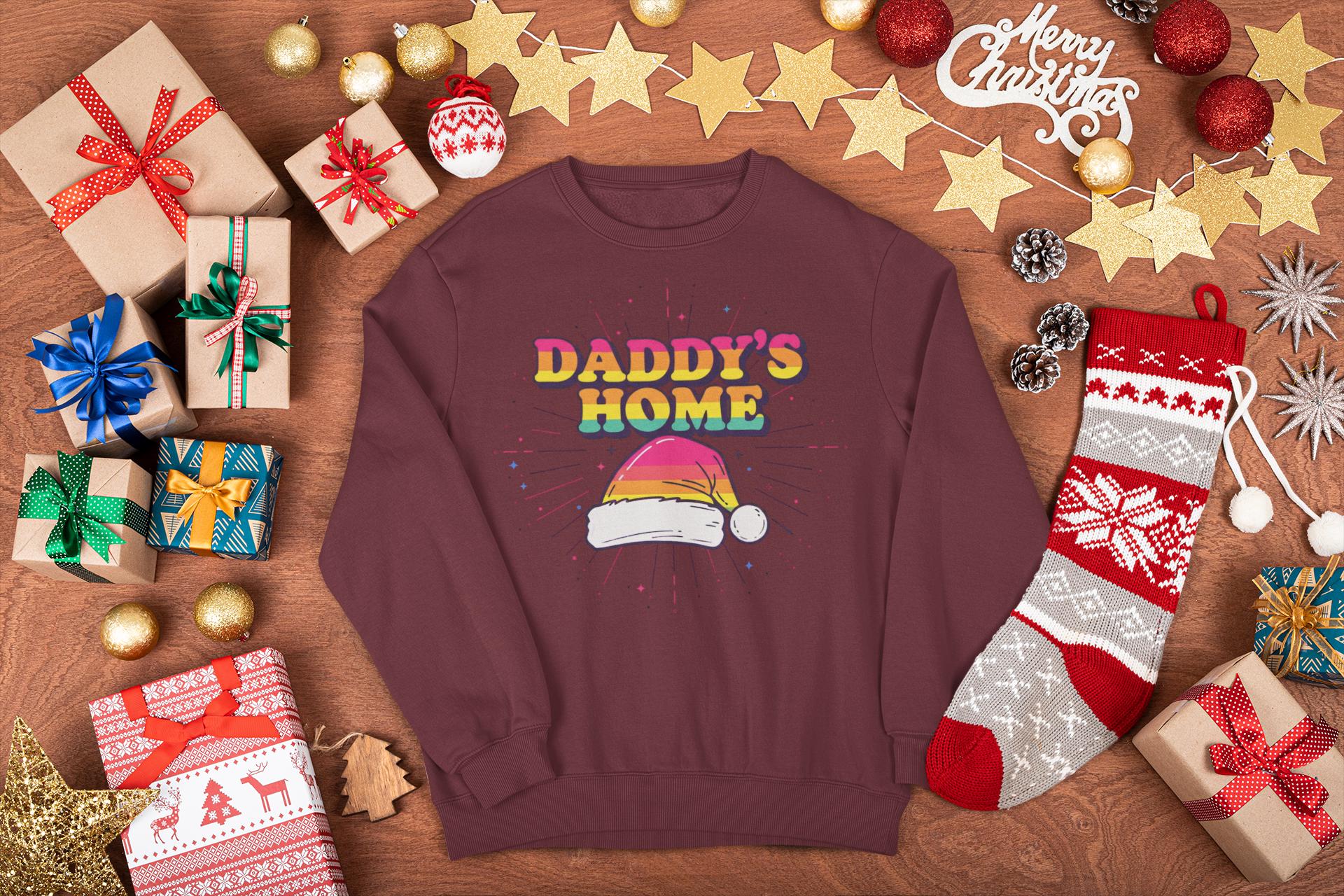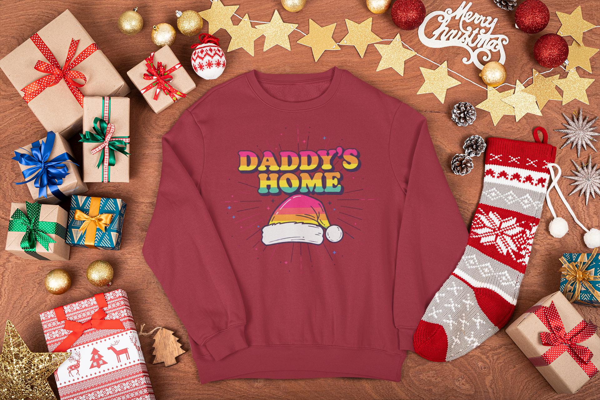 Find the perfect Gay Santa Sweatshirt with a bold, 70s retro vibe. This "Daddy's Home" Christmas design is a humorous and festive statement piece for any LGBTQ holiday party.