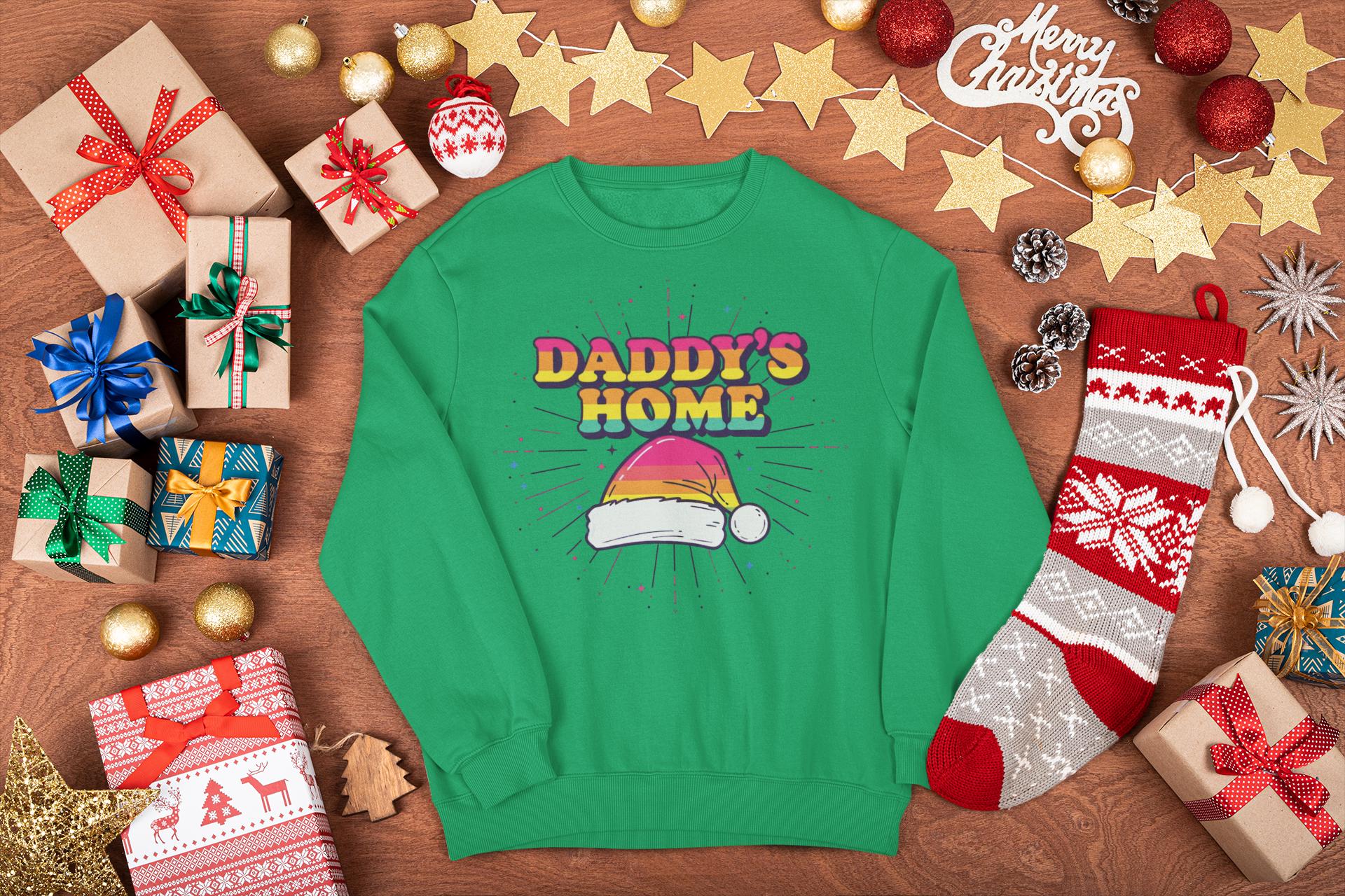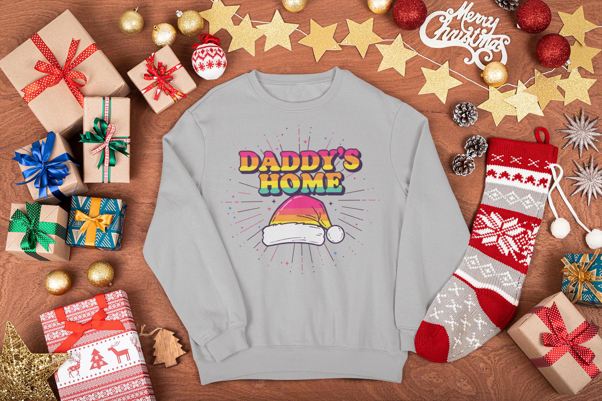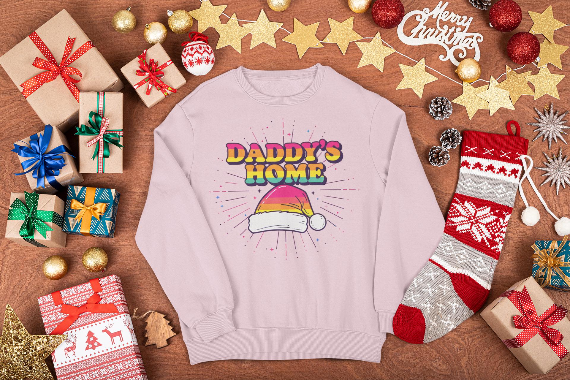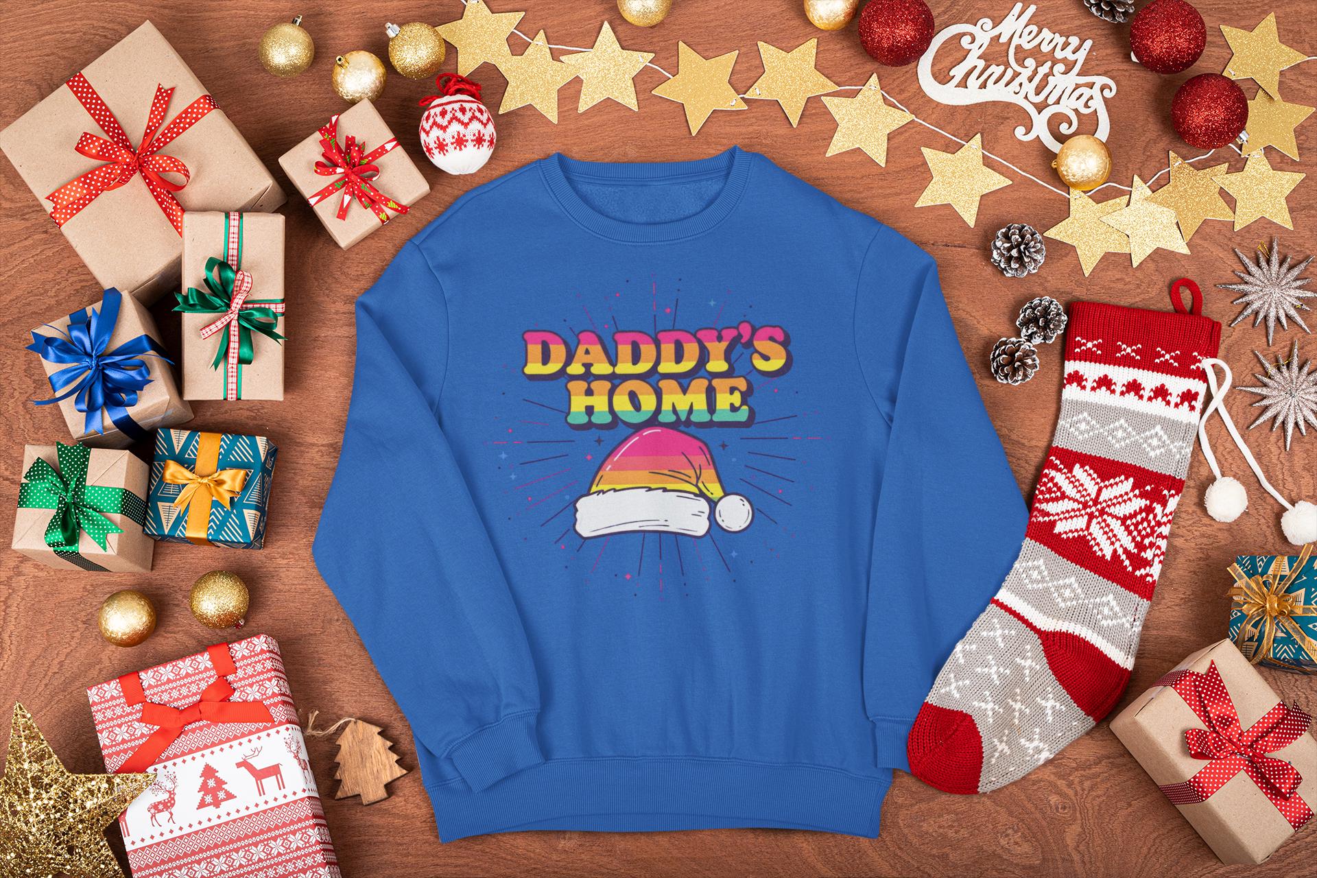 Find the perfect Gay Santa Sweatshirt with a bold, 70s retro vibe. This "Daddy's Home" Christmas design is a humorous and festive statement piece for any LGBTQ holiday party.