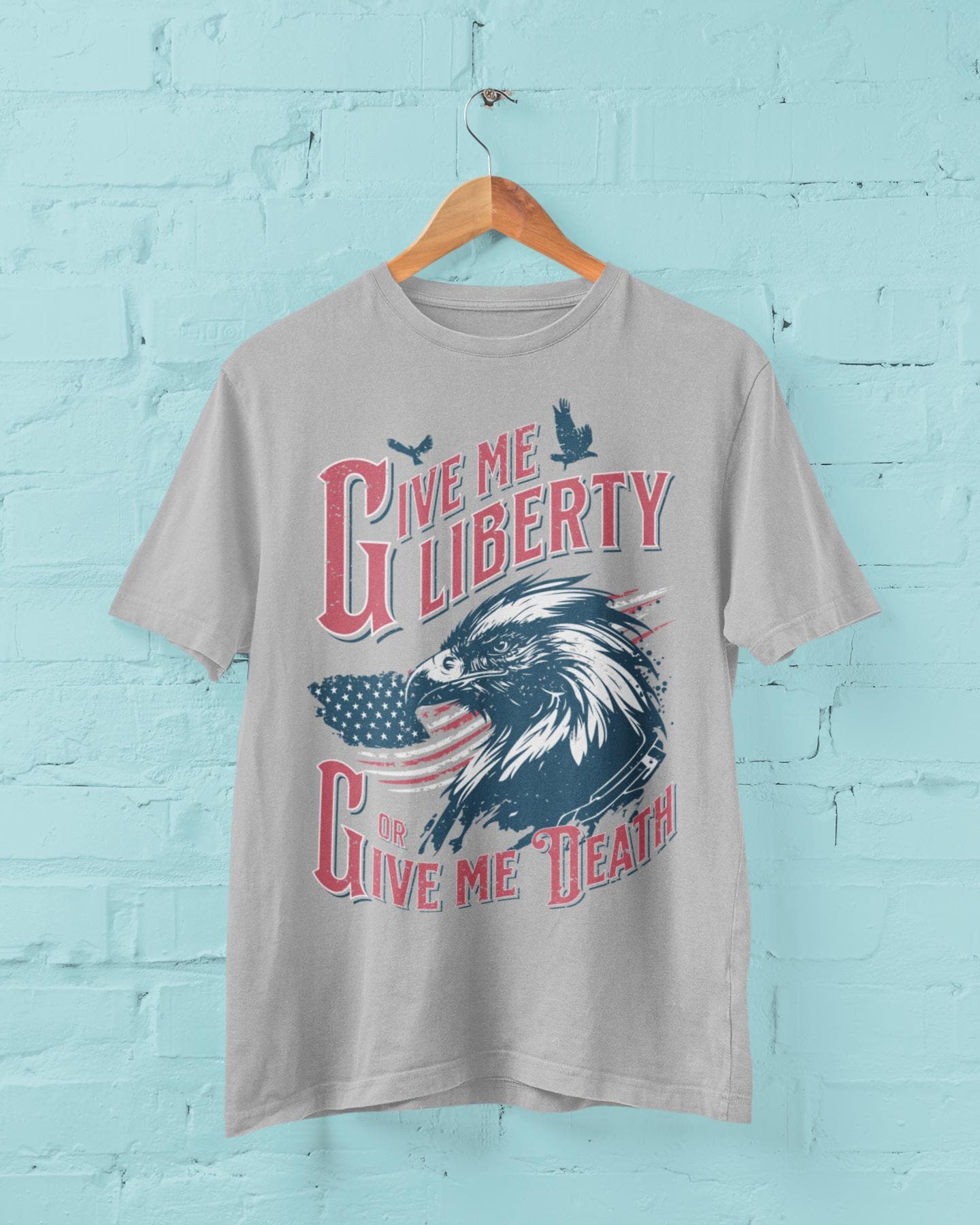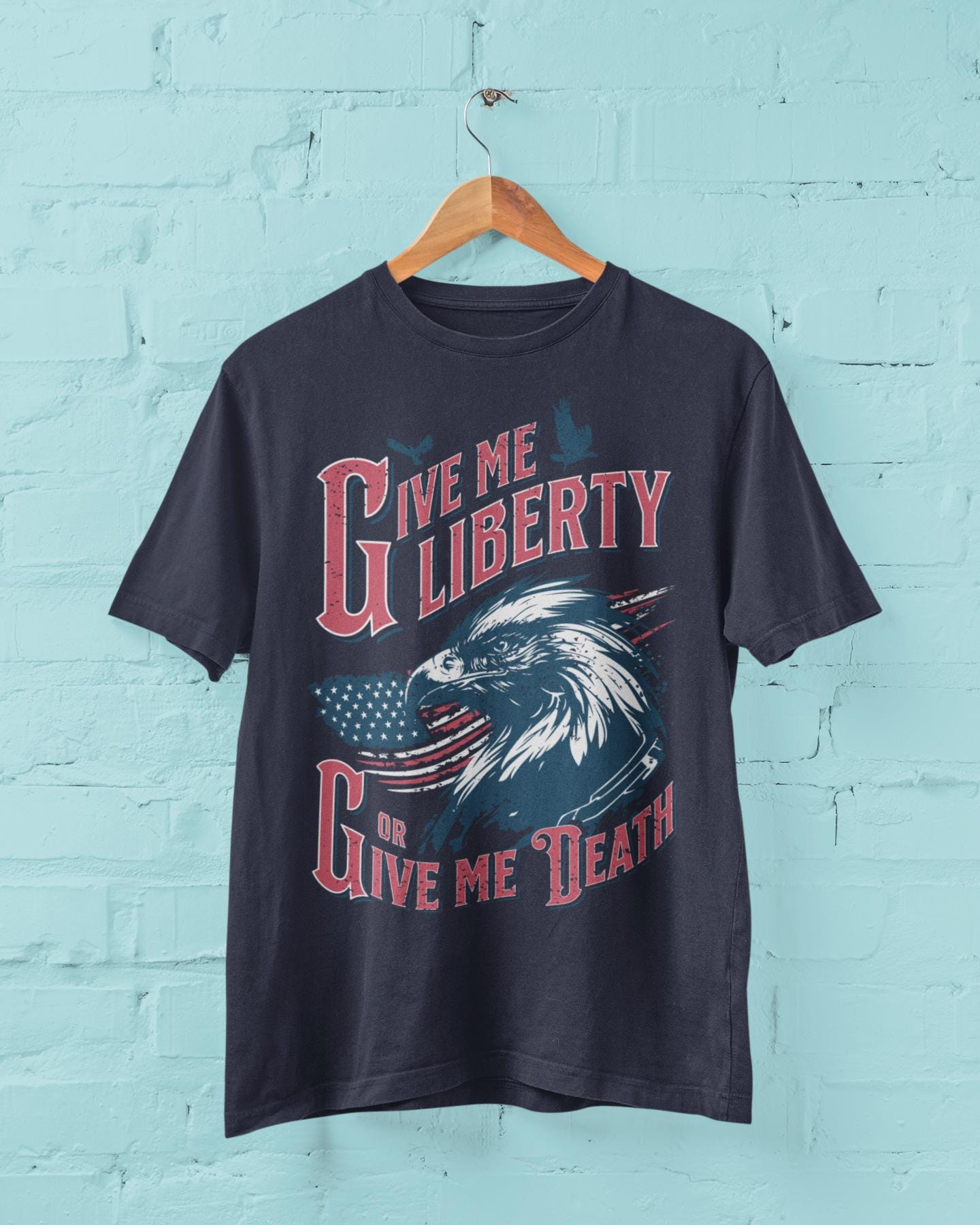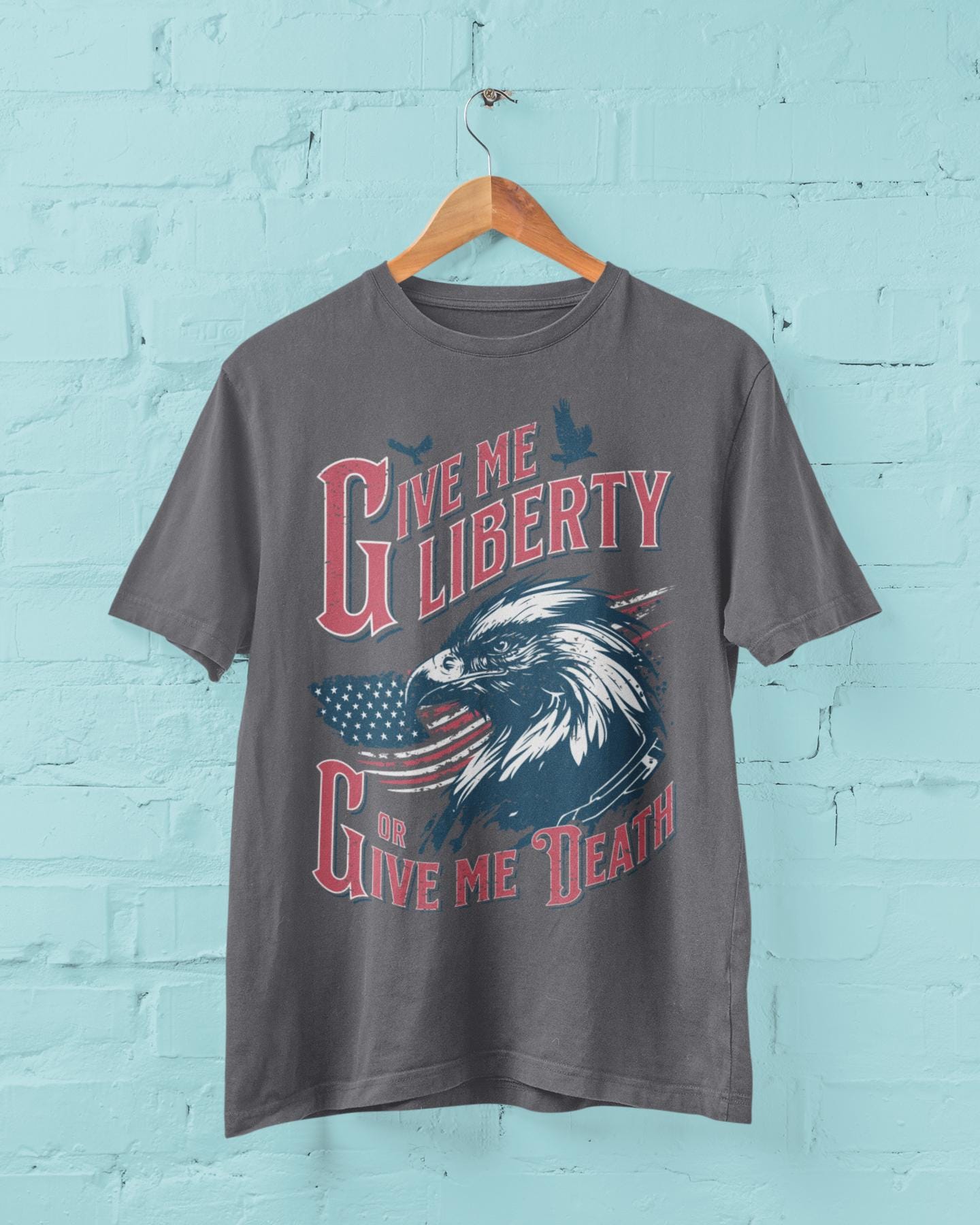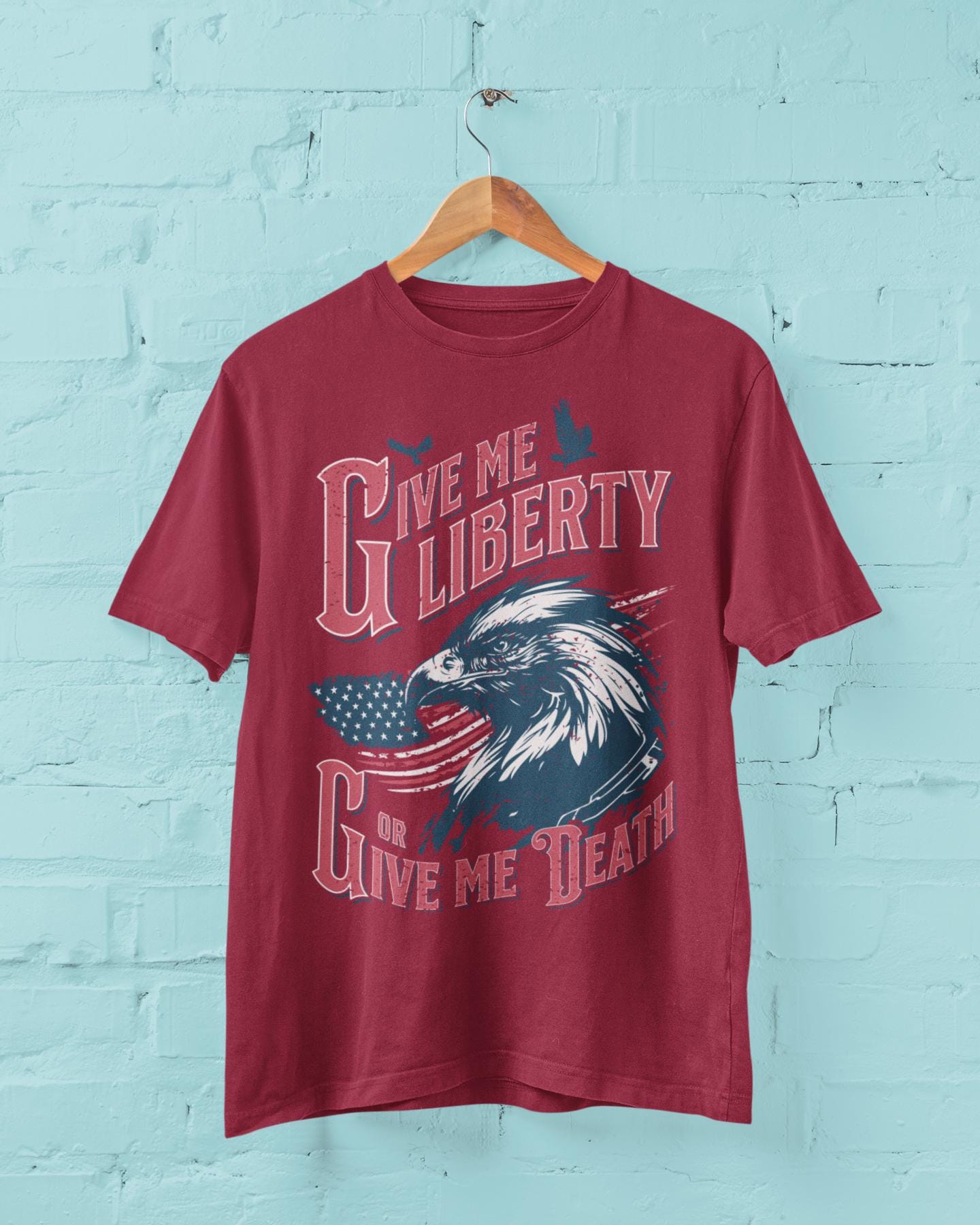 Make a bold statement with this "Give Me Liberty Or Death" t-shirt, a powerful piece of vintage-style patriotic apparel. This distressed Americana tee captures the rebellious spirit of 1776, featuring a striking bald eagle and flag design.
