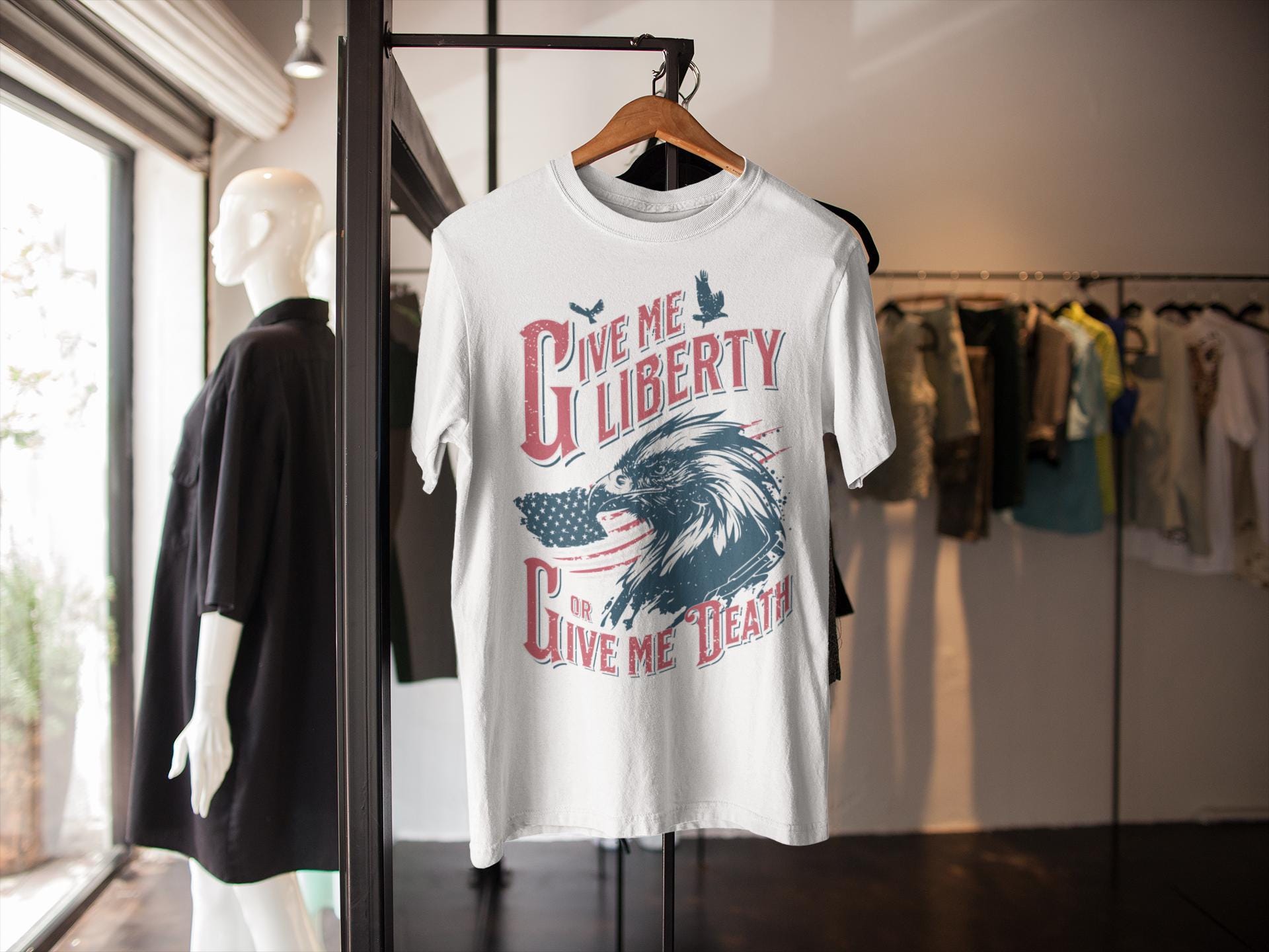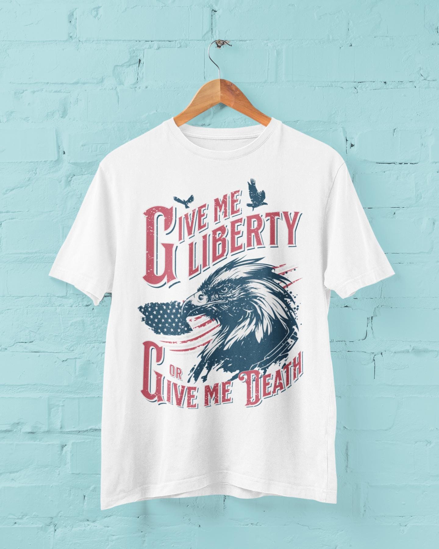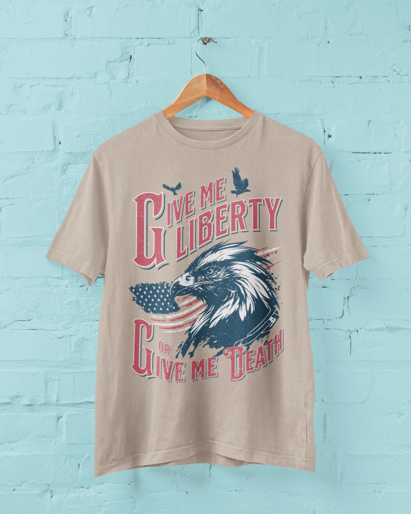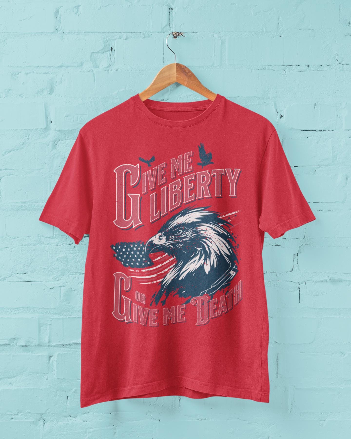 Make a bold statement with this "Give Me Liberty Or Death" t-shirt, a powerful piece of vintage-style patriotic apparel. This distressed Americana tee captures the rebellious spirit of 1776, featuring a striking bald eagle and flag design.